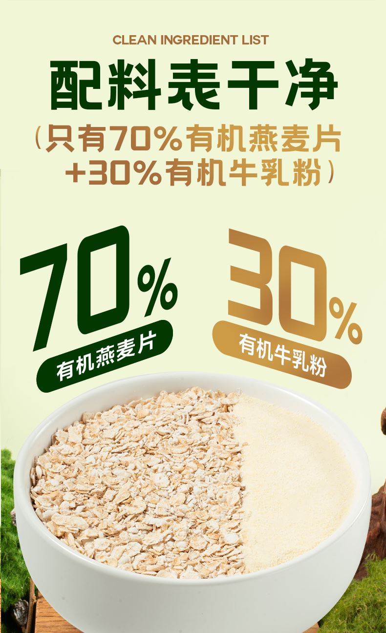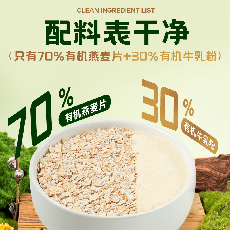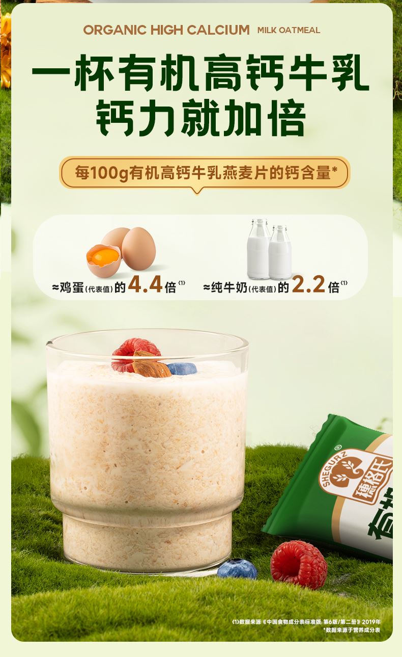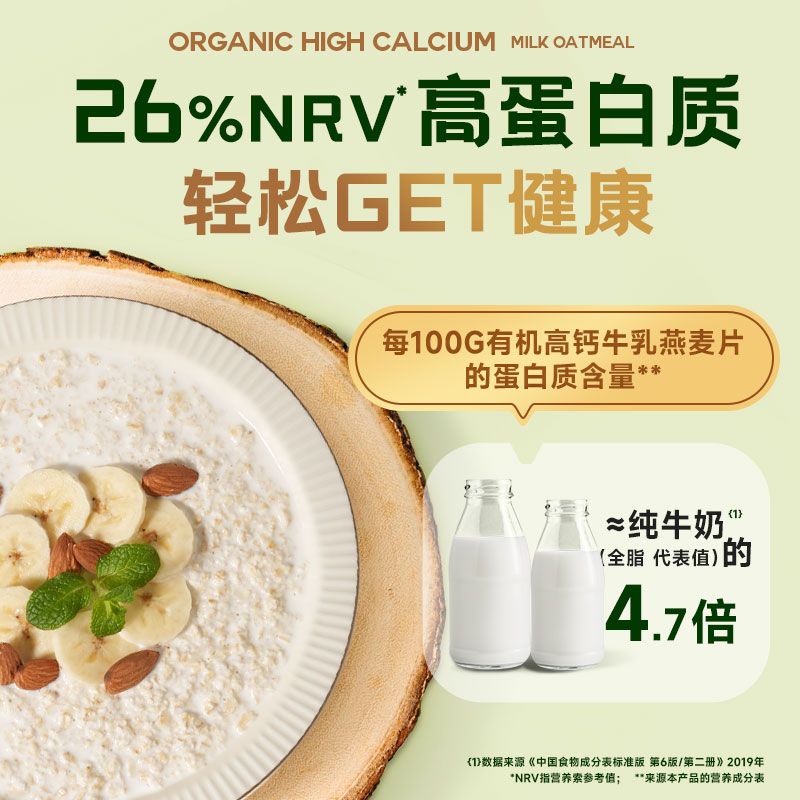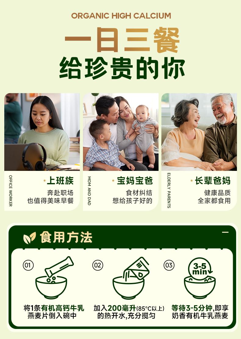 穗格氏有机高钙牛乳燕麦片礼盒840g(30g*28条) 配料表:有机燕麦片(70%),有机牛乳粉(30%) 卖点: 1,配料表干净,仅有燕麦片和牛乳粉; 2,甄选芬兰进口有机奶粉; 3,穗格氏专属有机种植基地,张家口市农业科学院育成品种“坝莜一号”; 4,奶香浓郁,健康高钙; 5,每100g有机高钙牛乳燕麦片的蛋白质含量约等于全脂牛奶的4.7倍; 6,通过中国有机认证,专属朔源二维码,专属有机查询码,一盒一码; 7,上班族,宝爸宝妈,长辈皆可安心食用。