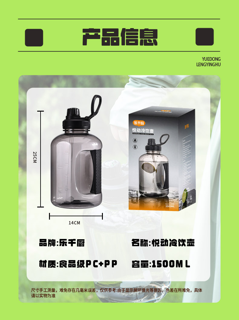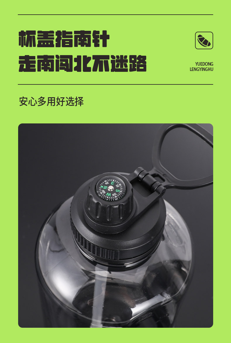 材 质:食品级pc+pp 容 量:1500ml 彩盒尺寸:13.3*13.3*25.3 外箱尺寸:87*49.5*27CM 1. 大容量吸管杯,轻松满足全天饮水需求 2. PP吸嘴配食品级硅胶吸管,饮水安全又舒适 3. 锁扣式按钮设计,单手操作便捷,饮水更安心 4. 自带环形加厚提手,拎拿方便,出行携带无压力 5.指南针装在杯盖处,走南闯北不迷路。