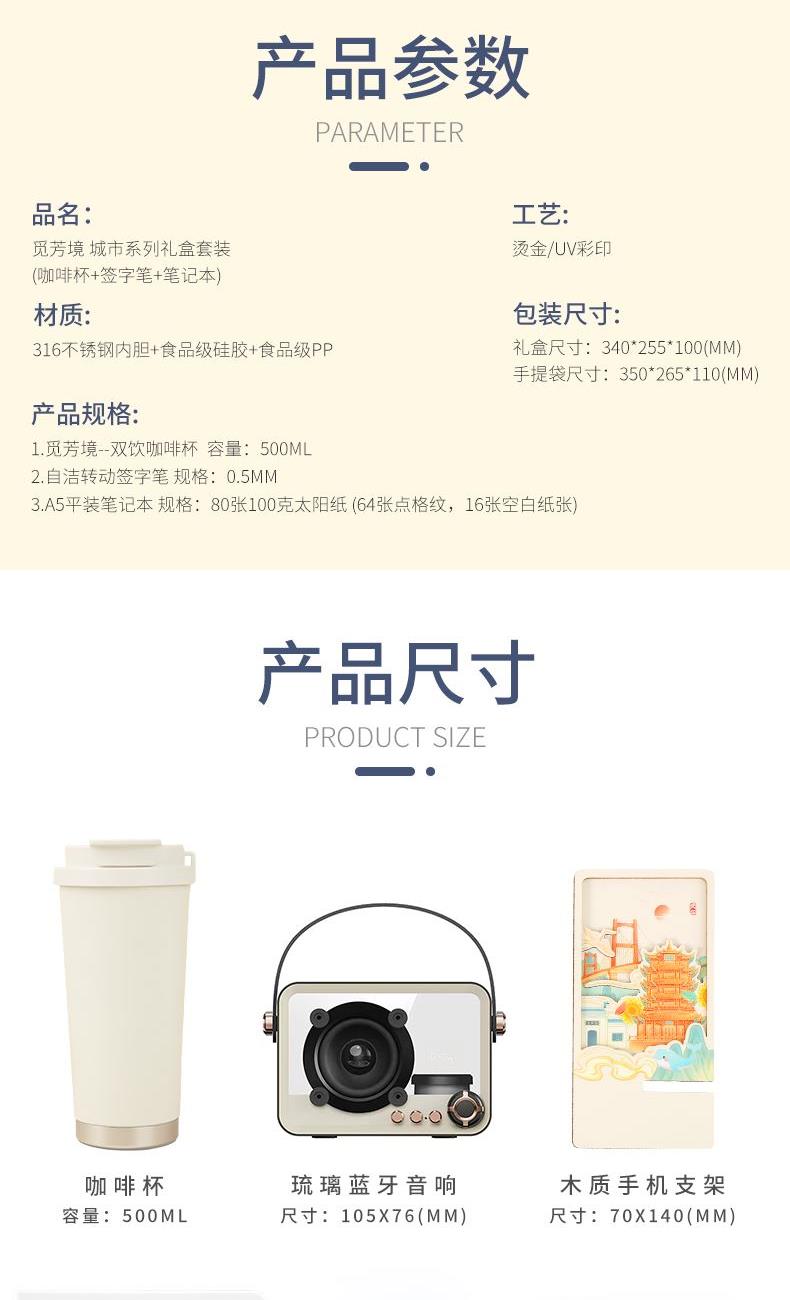 1.觅芳境--双饮咖啡杯 容量:500ml 内胆:316 外壳:304 杯盖:食品级PP 吸管:食品级硅胶 吸嘴:食品级PP 密封圈:食品级硅胶 2.自洁转动签字笔 规格:0.5mm 3.A5平装笔记本 规格:80张100克太阳纸 (64张点格纹,16张空白纸张) 礼盒尺寸:340*255*100(MM) 手提袋尺寸:350*265*110(MM)