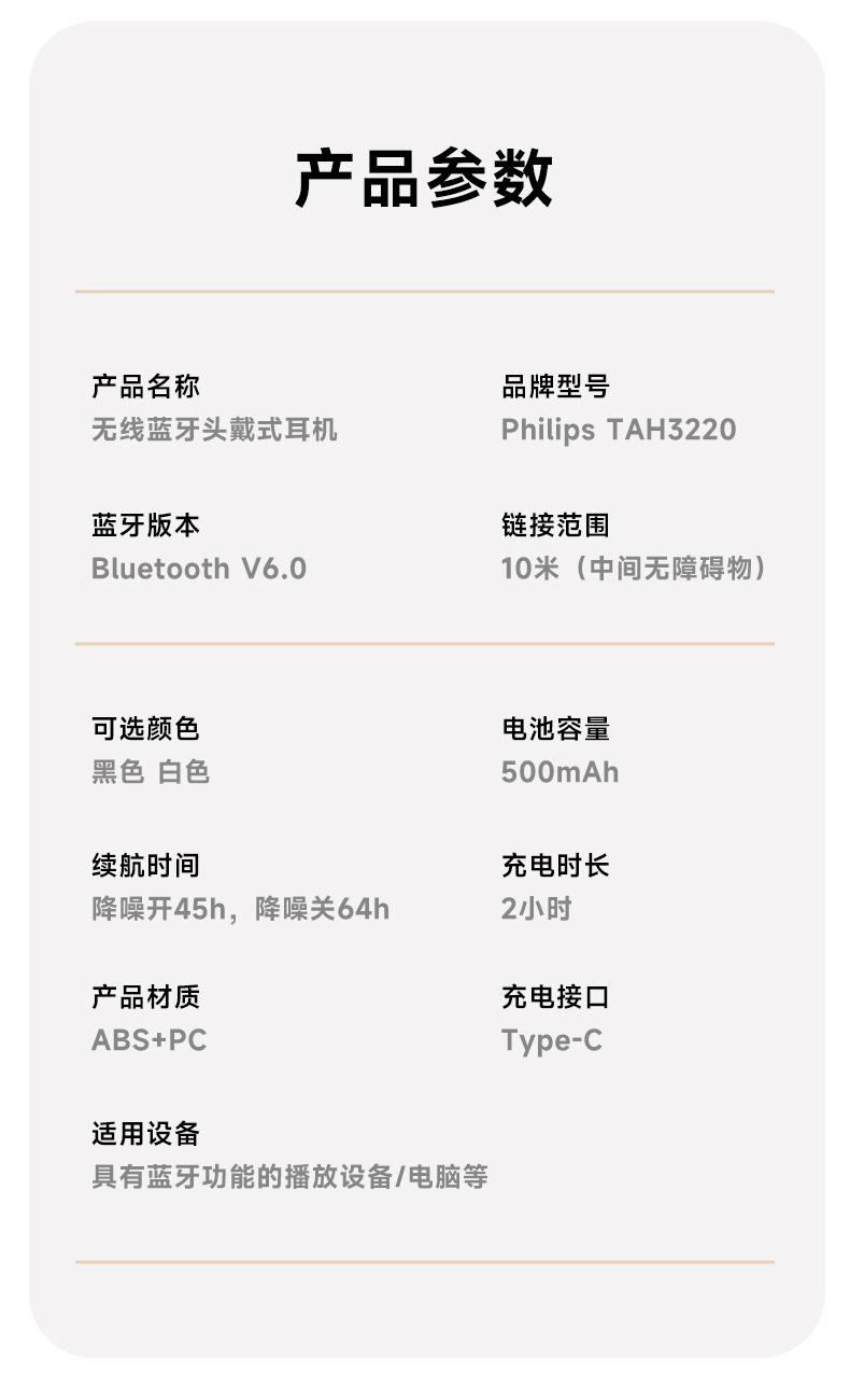 3.内置大容量电池,常规模式下,持久续航约64小时,ANC模式续航45小时;
