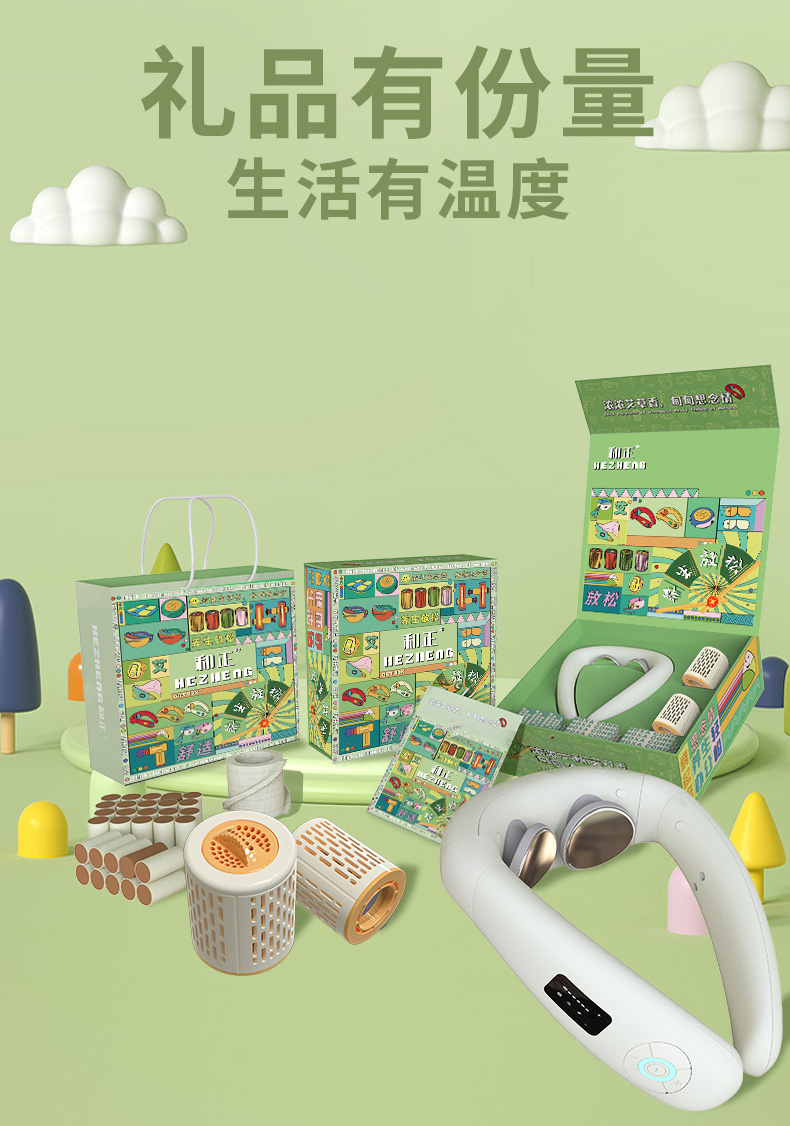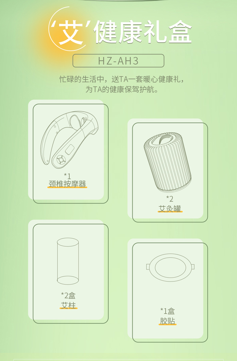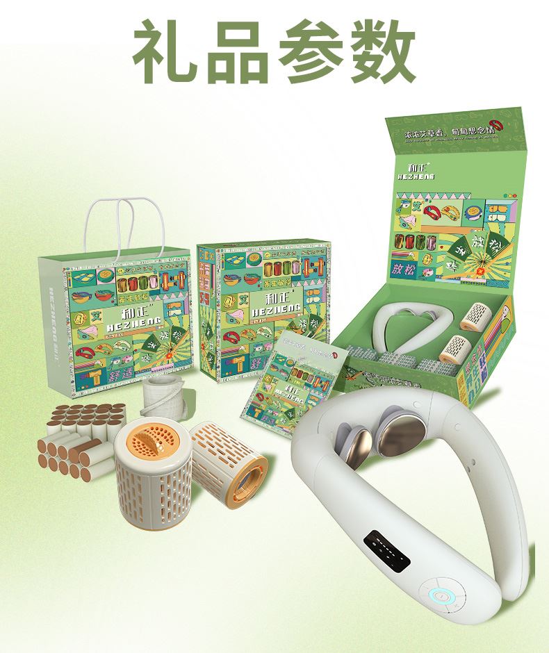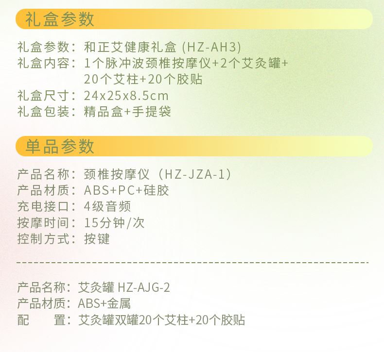 产品参数 产品内容:1个脉冲波颈椎按摩仪 +2个艾灸罐+40个艾柱+40个胶贴 69码:6921311513611 包装方式:精品盒+手提袋 艾灸罐 HZ-AJG-1 产品材质:ABS+金属 配置:艾灸罐双罐40个艾柱+40个胶贴 产品卖点 这是一款组合式健康套装,由1个脉冲波颈椎按摩仪+2个艾灸罐组成: 和正颈椎按摩仪采用EMS脉冲、中低频技术,仿人手按摩更真实;五大按摩模式十档按摩力度可调,使用更随心;三个3D浮动电极片按摩头设计,贴合颈椎,体感更舒适。 五种按摩模式(振动功能 、脉冲功能、热灸功能、 红光功能、全功能)+弹性硅胶关节的应用仿人手按摩更真实。 和正艾灸罐,根据艾灸理念设计而成,产品设计小巧,可循环使用;明火悬灸,升降调温,阻燃材质,多重保护,艾灸更安心;选用地道艾草精制而成的艾柱,艾香醇正,热力温润。