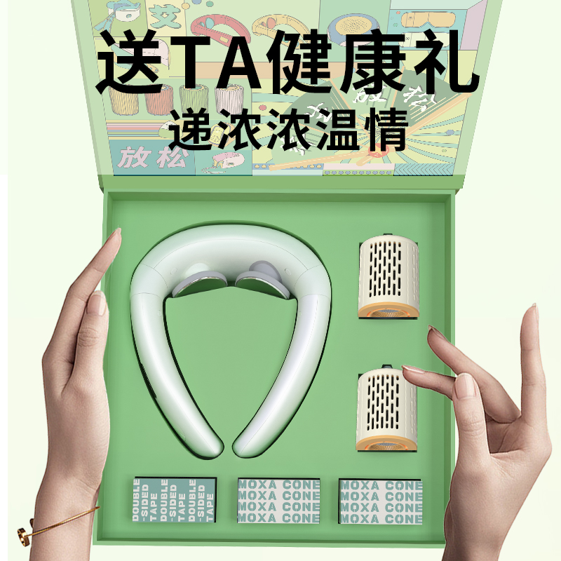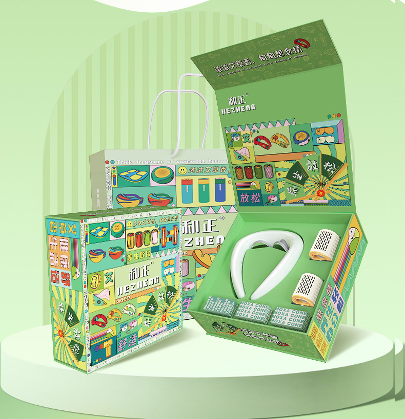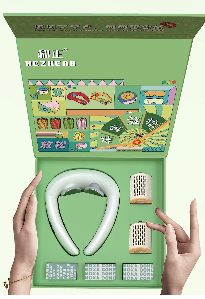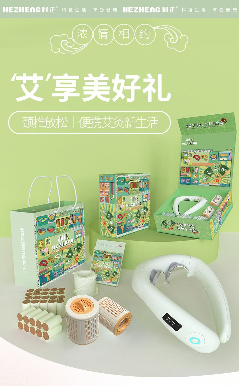产品参数 产品内容:1个脉冲波颈椎按摩仪 +2个艾灸罐+40个艾柱+40个胶贴 69码:6921311513611 包装方式:精品盒+手提袋 艾灸罐 HZ-AJG-1 产品材质:ABS+金属 配置:艾灸罐双罐40个艾柱+40个胶贴 产品卖点 这是一款组合式健康套装,由1个脉冲波颈椎按摩仪+2个艾灸罐组成: 和正颈椎按摩仪采用EMS脉冲、中低频技术,仿人手按摩更真实;五大按摩模式十档按摩力度可调,使用更随心;三个3D浮动电极片按摩头设计,贴合颈椎,体感更舒适。 五种按摩模式(振动功能 、脉冲功能、热灸功能、 红光功能、全功能)+弹性硅胶关节的应用仿人手按摩更真实。 和正艾灸罐,根据艾灸理念设计而成,产品设计小巧,可循环使用;明火悬灸,升降调温,阻燃材质,多重保护,艾灸更安心;选用地道艾草精制而成的艾柱,艾香醇正,热力温润。