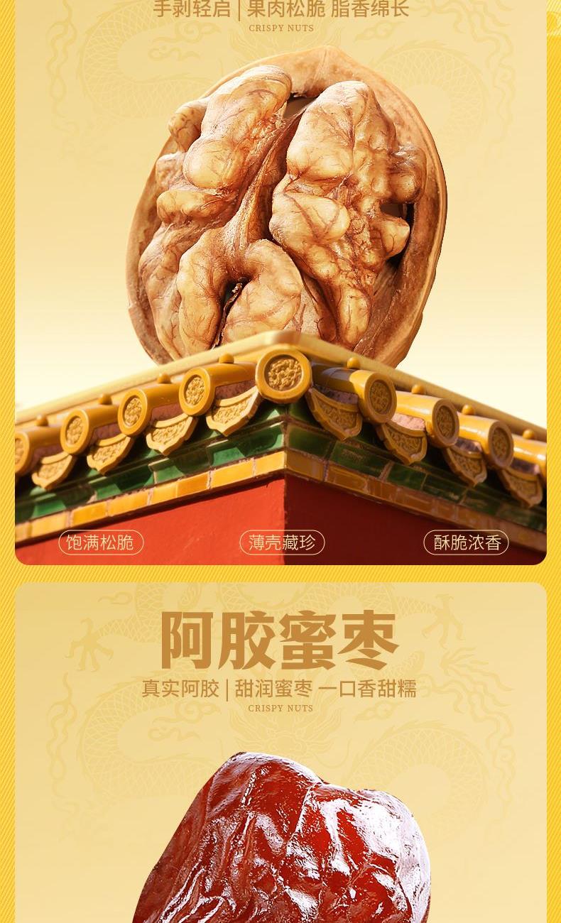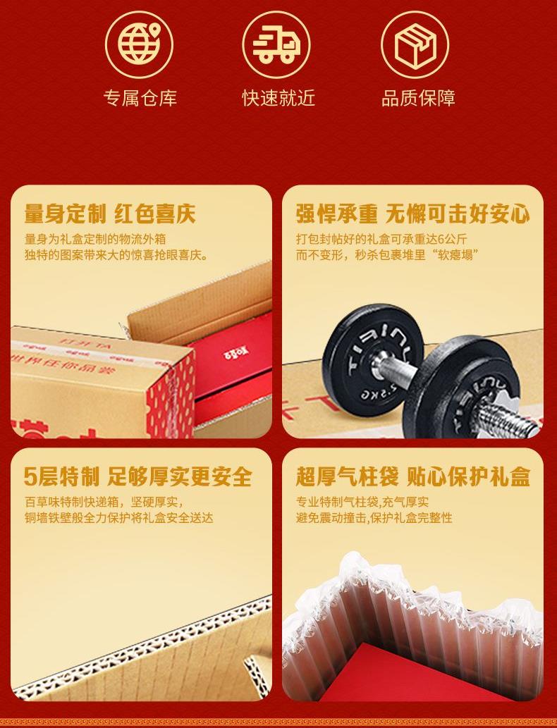 礼盒尺寸mm(长*宽*高):400*150*290 保质期:240天 内配:纸皮核桃 100g 爆汁卤花生(五香味)228g 津酥大麻花 120g 乳沙琪玛335g 阿胶蜜枣228g