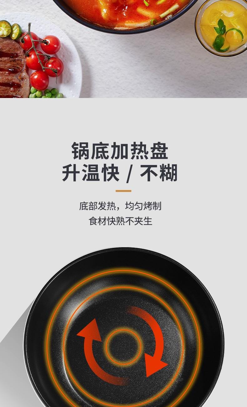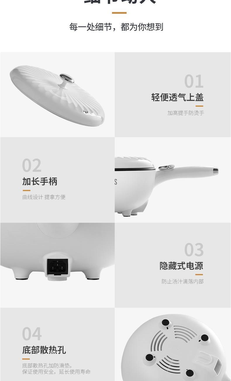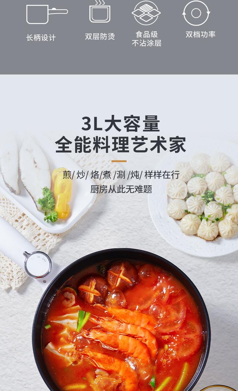 额定电源 :220V~50Hz 额定功率 :1600W 炒锅容量 :3L 净 重 :1.9kg 毛重:2.3kg 包装尺寸:533*328*195mm 1、1600W大功率,爆炒快熟,美味轻松拿捏; 2、 爆炒、、煮、焖、炖、火锅,一锅多用; 3、陶瓷釉不粘涂层,健康烹饪 安心放心; 4、大功率高效加热,两档火力可调; 5、 精 准控温,防干烧保护;