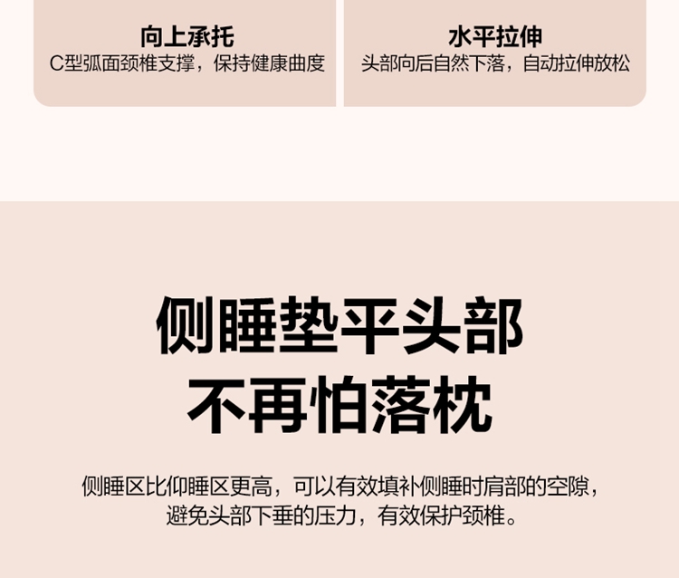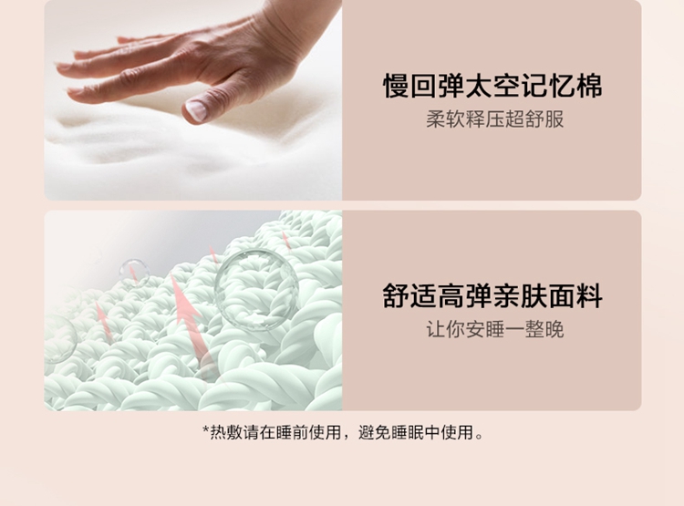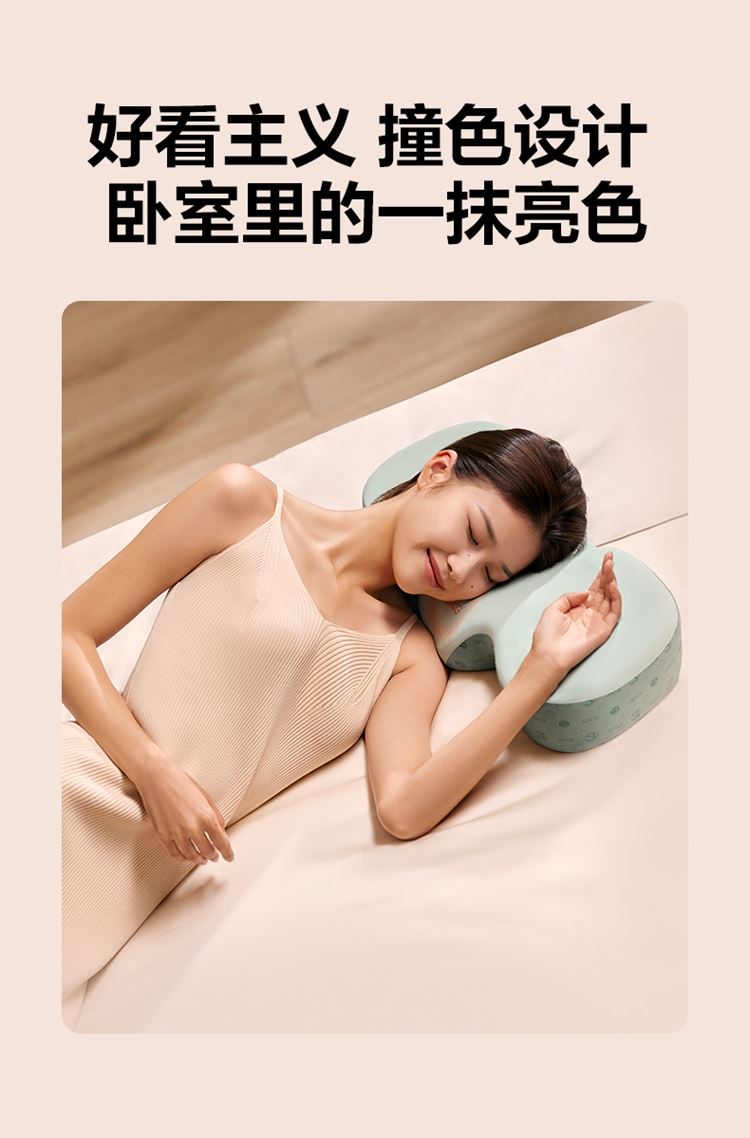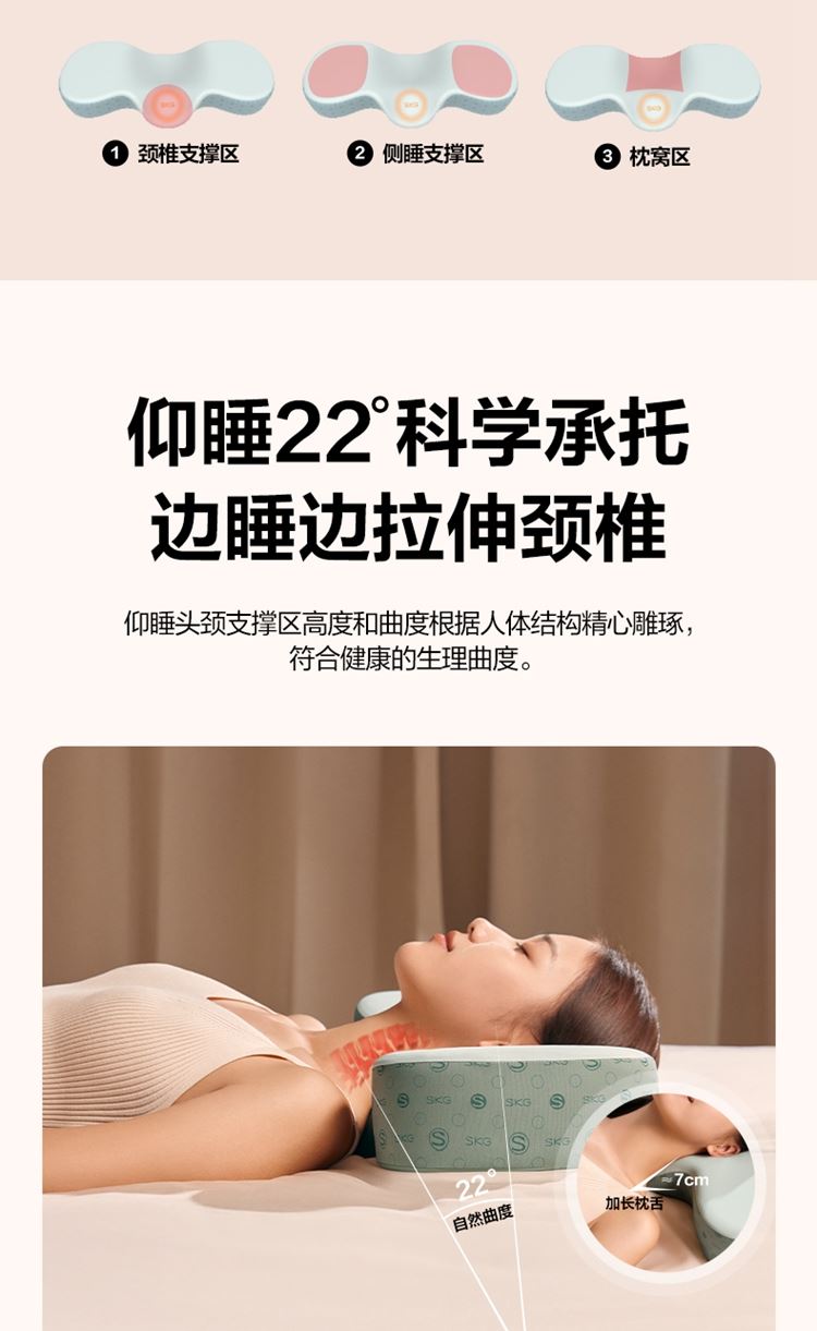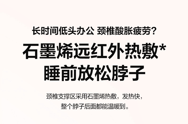科学分区颈椎睡眠枕 石墨烯远红外热敷 仰睡低,侧睡垫高,耳窝专区 仰睡22°承托颈椎 慢回弹太空记忆棉 复合凉爽面料 手提盒 产品参数: 机身材质:记忆棉 电源电压:5V/5W 充电接口:USB 控制方式:机身按键 语音播报:无 电池容量:无 续航时间:小时 按摩时间:30分钟 按摩模式:无 热敷档位:3档 温度挡位:38/41/44°C 单台毛重/净重:1.5/0.85kg 彩箱尺寸:570*260*96mm
