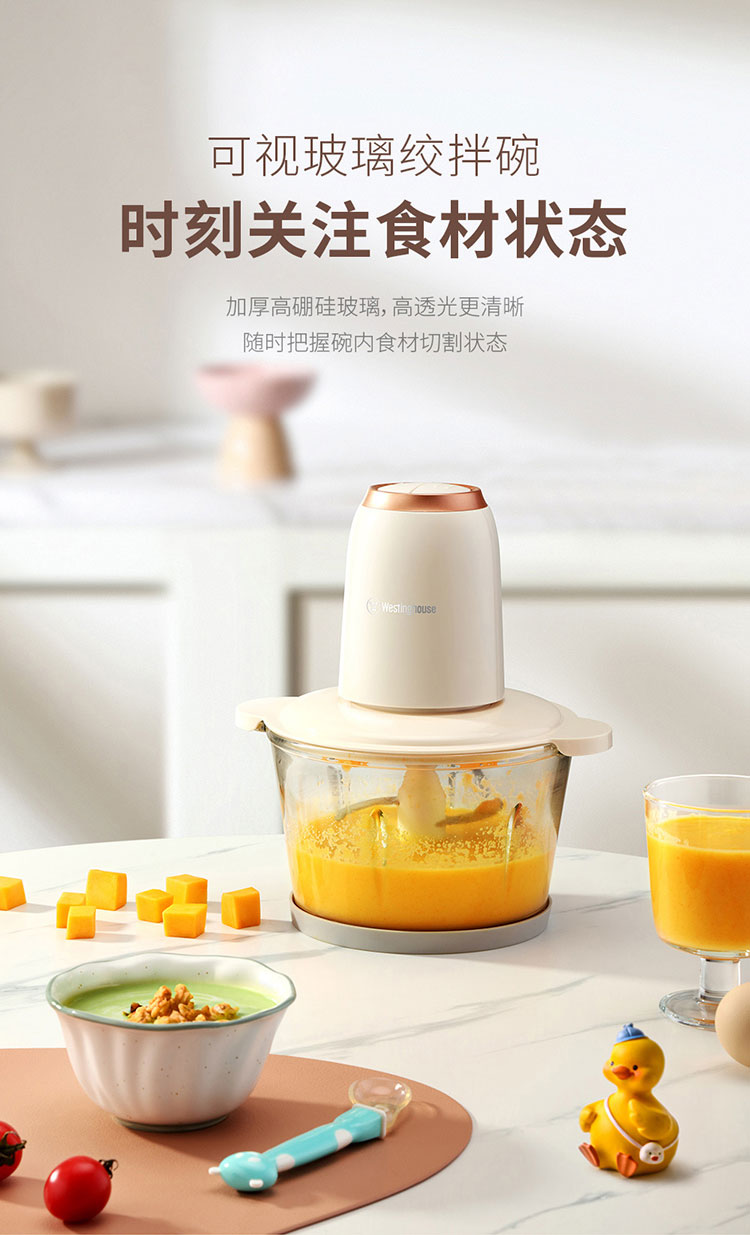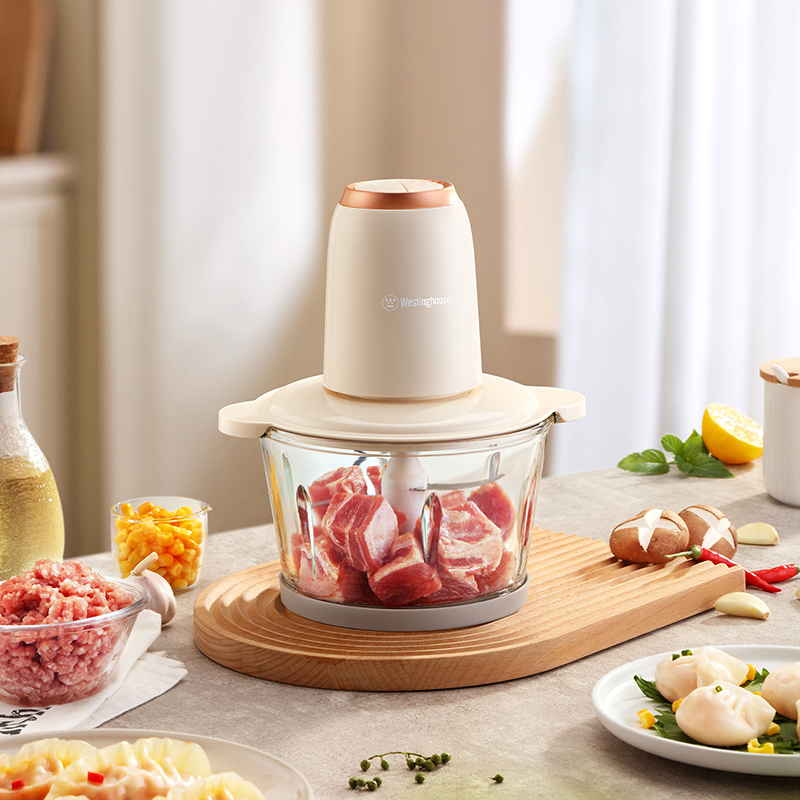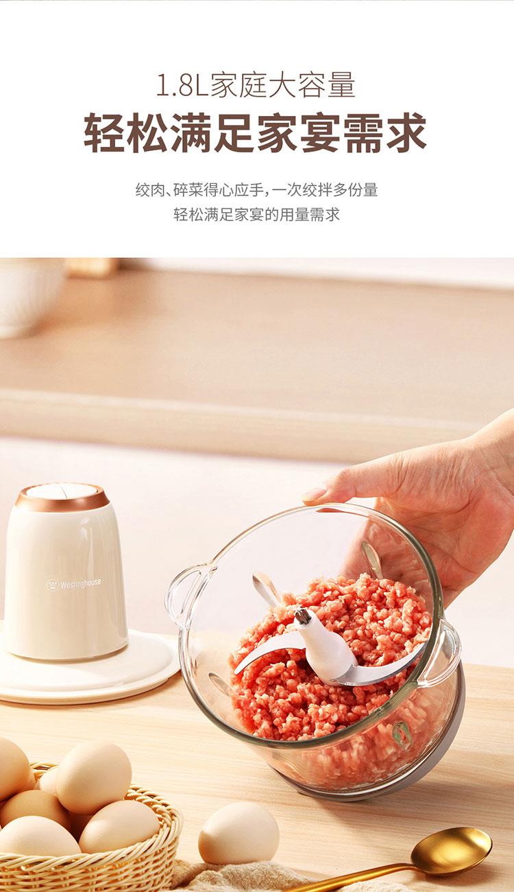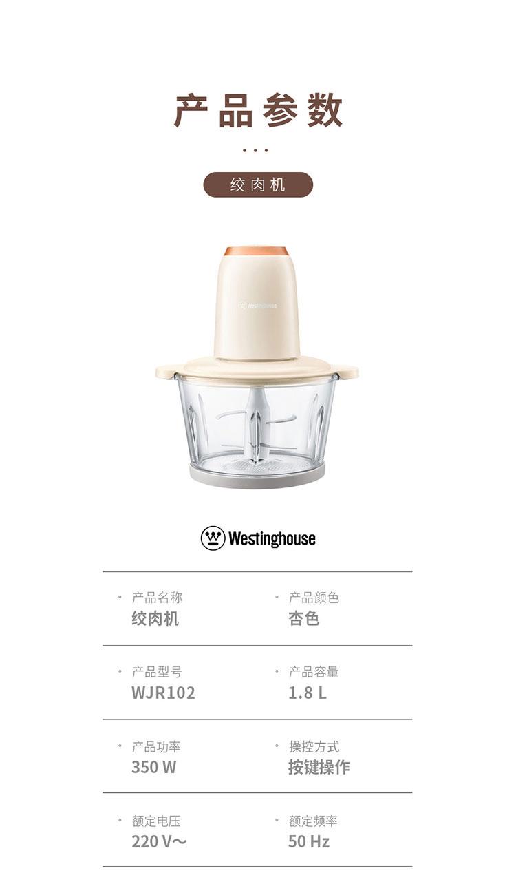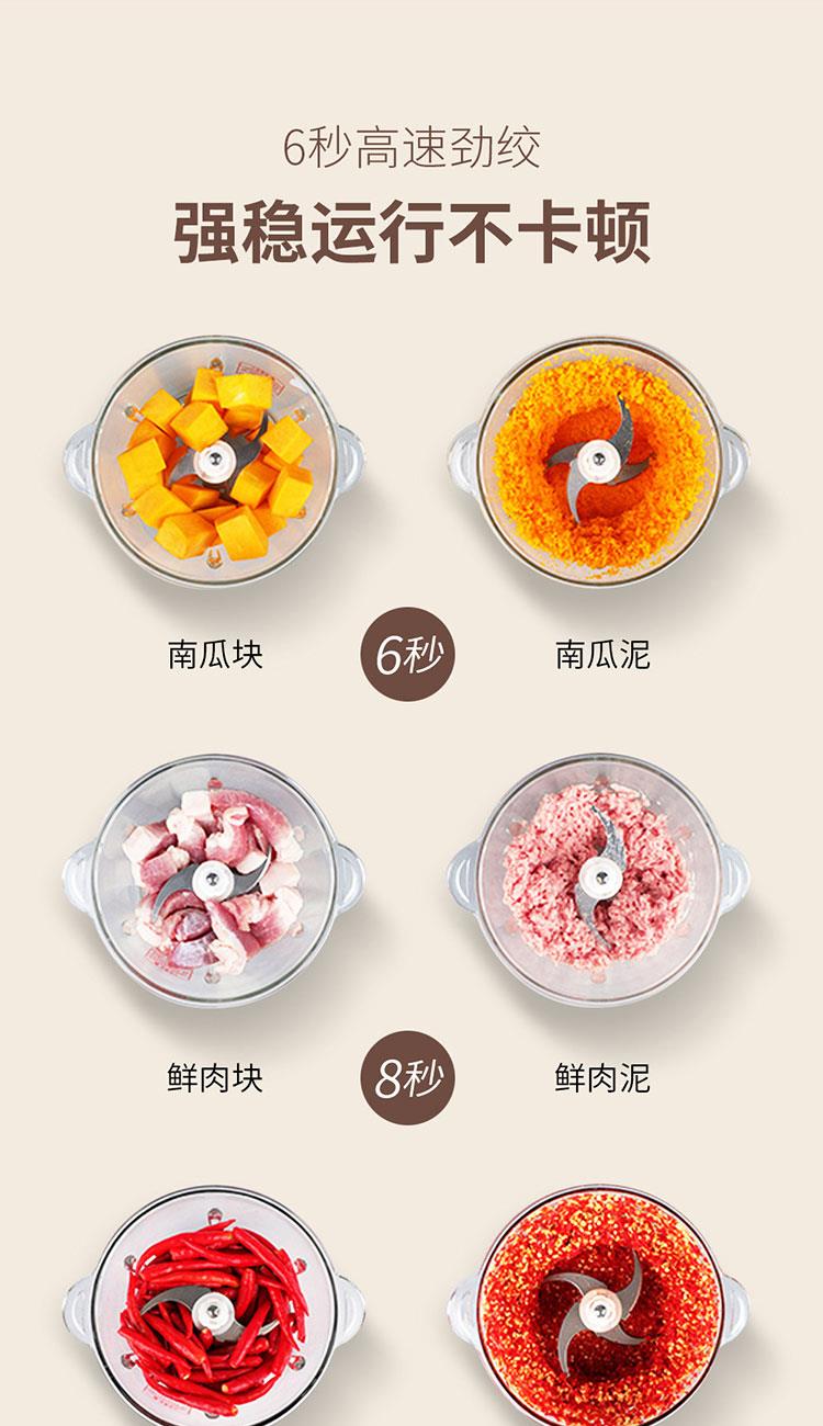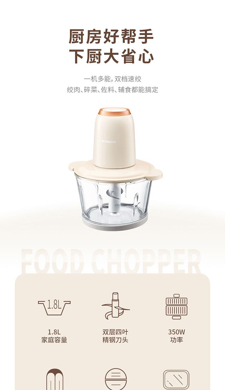 产品规格: 额定电压:220V~50Hz 额定功率:350W 额定容量:1.8L 绞肉杯材质:玻璃 产品颜色:杏色 操作方式:按键操作 产品特点: 1.8L家庭大容量,绞肉、碎菜得心应手; 快慢双档切换,点动操作,灵活适配多种食材; 350W大功率,强劲动力,快速均匀切碎食材; S型双层精钢刀头,多角度精细切割食材; 全钢轴心,防打滑、抗磨损; 加厚高硼硅玻璃,把握食材切割状态。