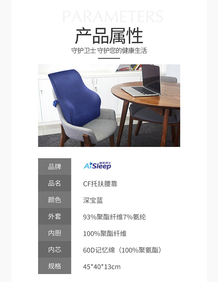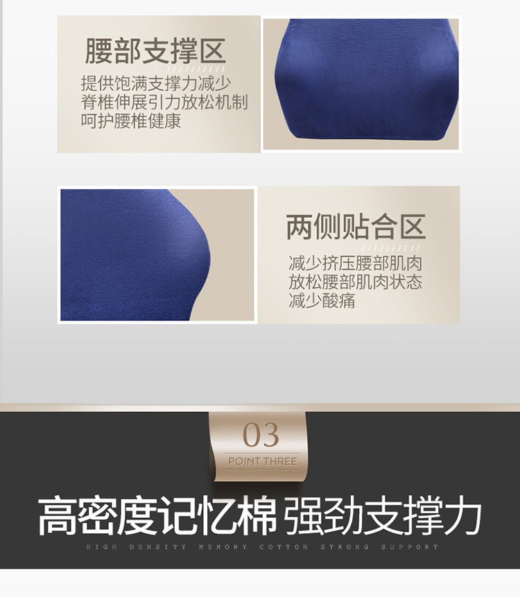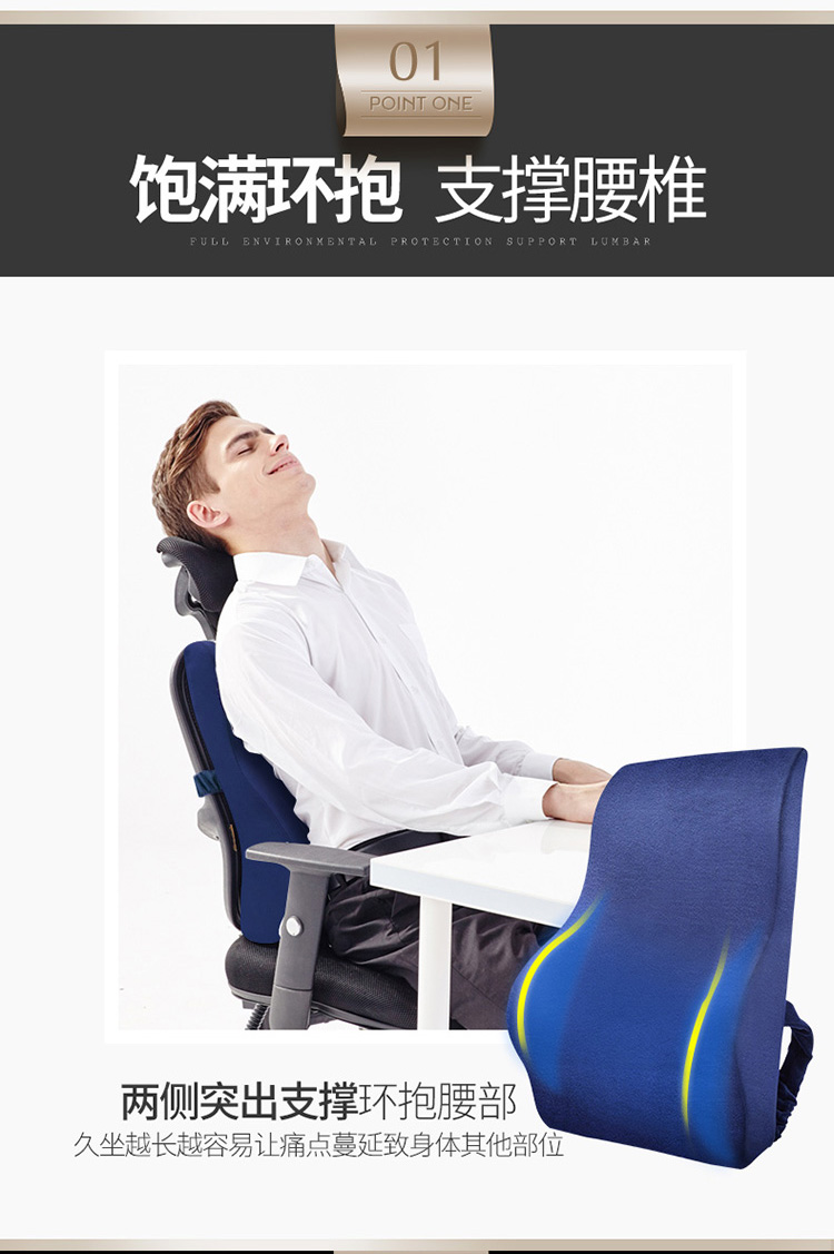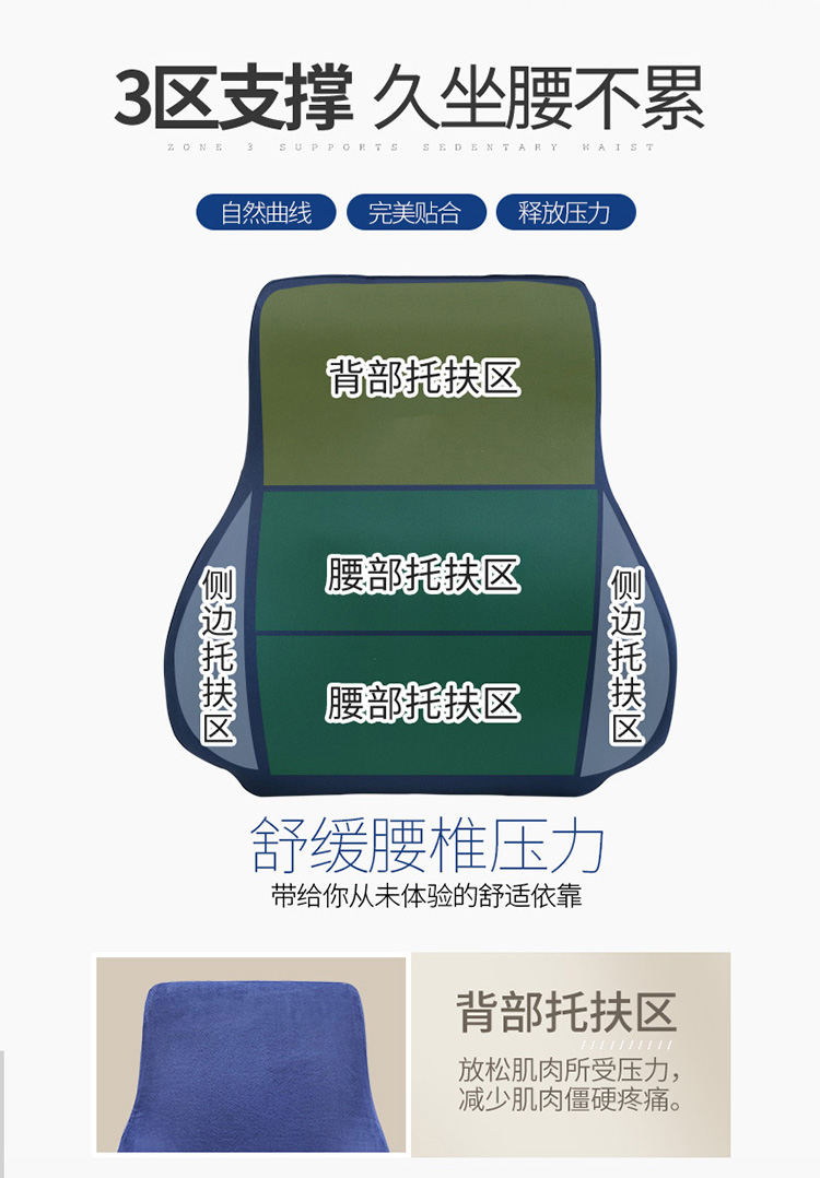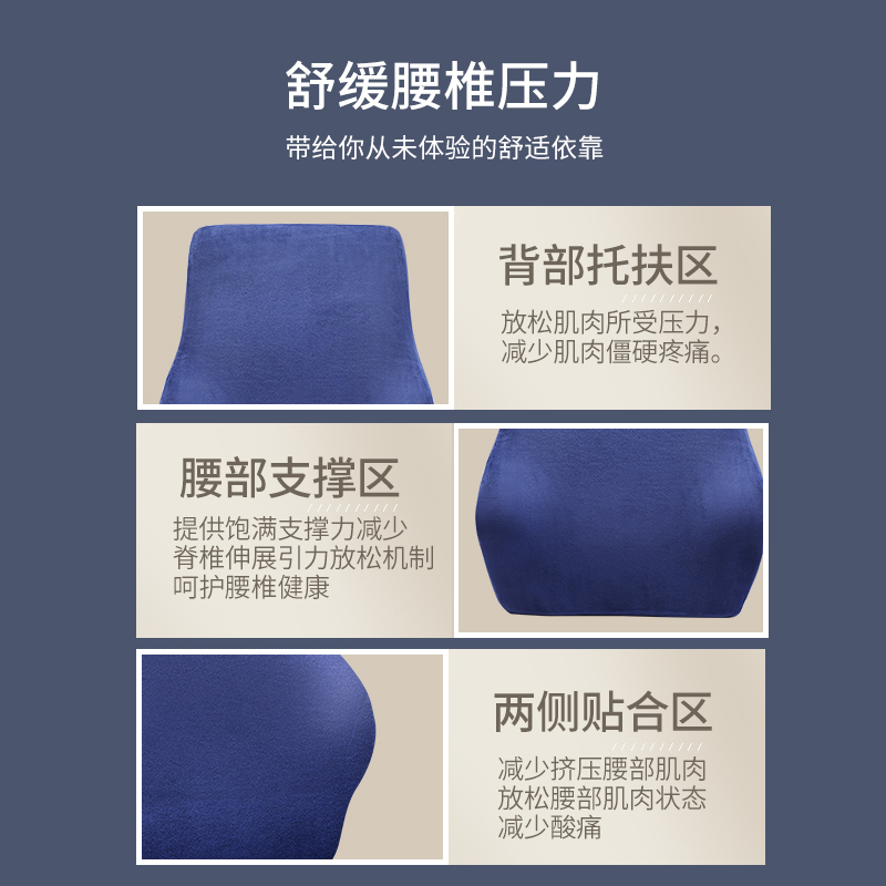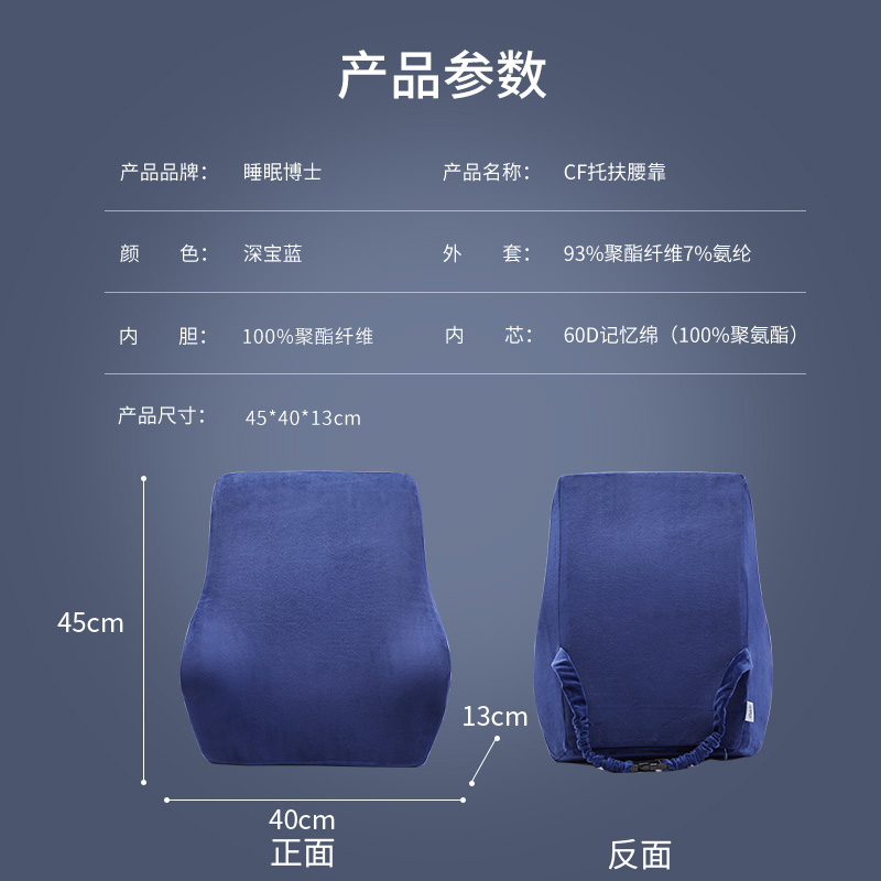 条码:6946592107892 尺寸:45*40*13cm(深宝蓝) 面料:93%聚酷纤维7%氨纶 填充:聚氨酯 基本特性:靠垫设计符合人体工程学原理,两翼防偏移包裹,增强驾驶中的包裹感,记忆材质填充为颈椎提供良好的支撑。 特性优势:良好的弹性和支撑性,贴合腰部曲线,背部贴服区增高,仰靠更舒适,为腰部提供均匀的支撑。 益处价值:分担腰部压力,保持腰椎正常的生理曲度,缓解肌肉疲劳,预防因久坐引起的腰部不适。 适合人群:腰椎疾病人群,司机,孕妇、长途自驾游客,办公室职员