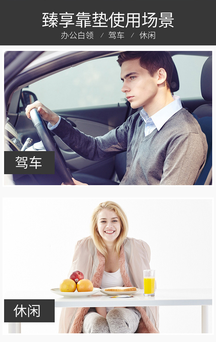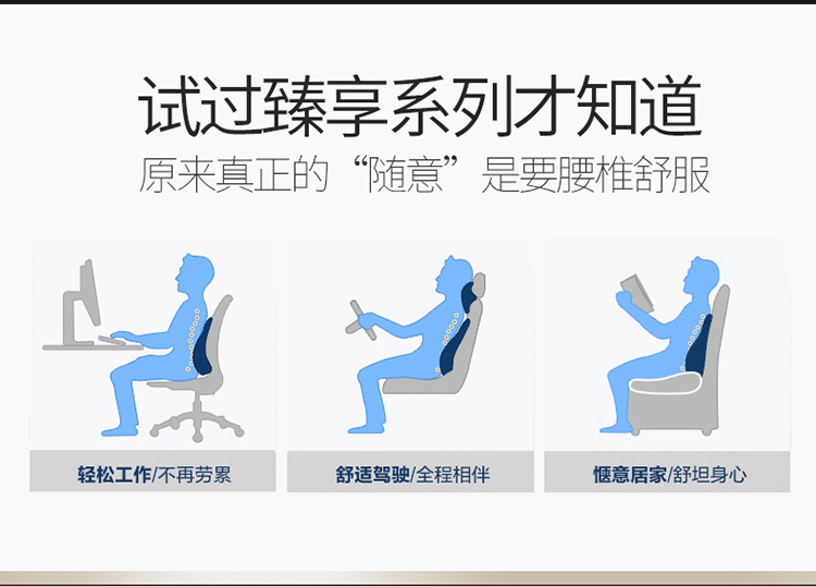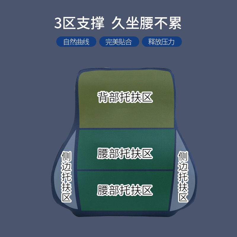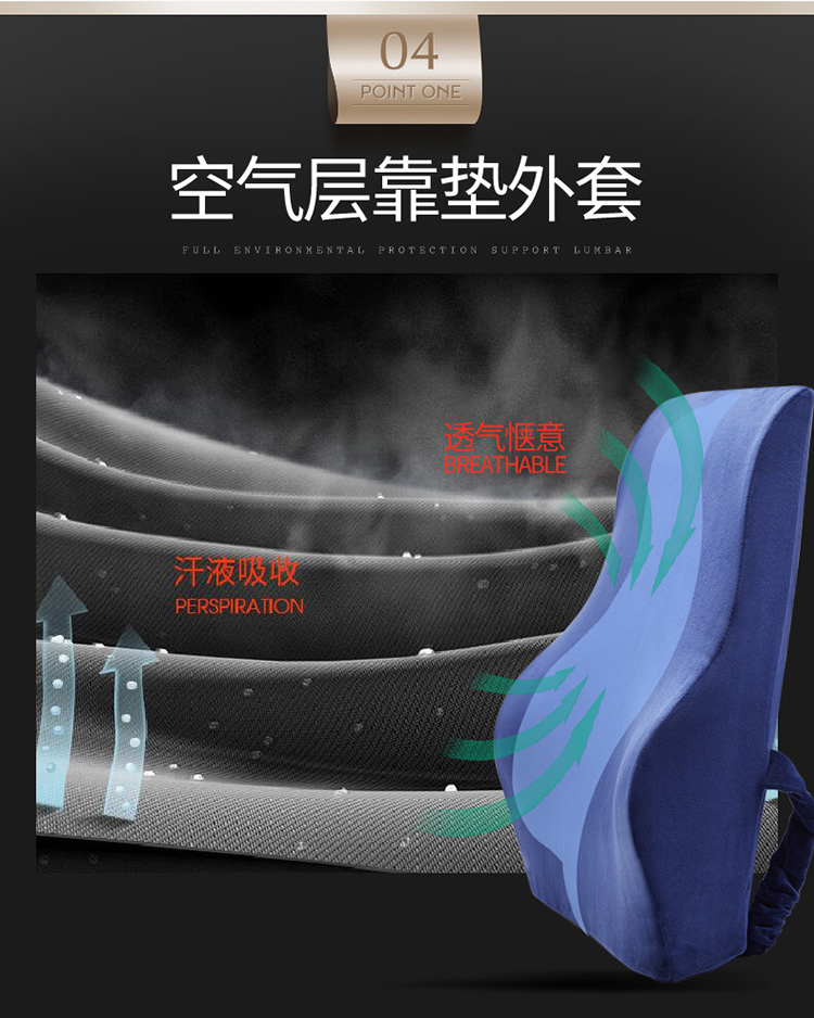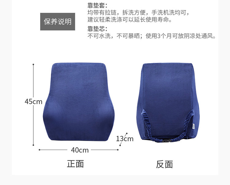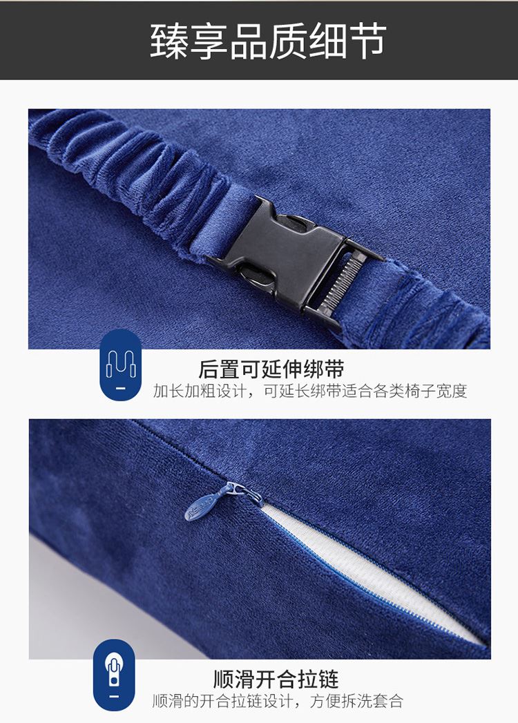 条码:6946592107892 尺寸:45*40*13cm(深宝蓝) 面料:93%聚酷纤维7%氨纶 填充:聚氨酯 基本特性:靠垫设计符合人体工程学原理,两翼防偏移包裹,增强驾驶中的包裹感,记忆材质填充为颈椎提供良好的支撑。 特性优势:良好的弹性和支撑性,贴合腰部曲线,背部贴服区增高,仰靠更舒适,为腰部提供均匀的支撑。 益处价值:分担腰部压力,保持腰椎正常的生理曲度,缓解肌肉疲劳,预防因久坐引起的腰部不适。 适合人群:腰椎疾病人群,司机,孕妇、长途自驾游客,办公室职员