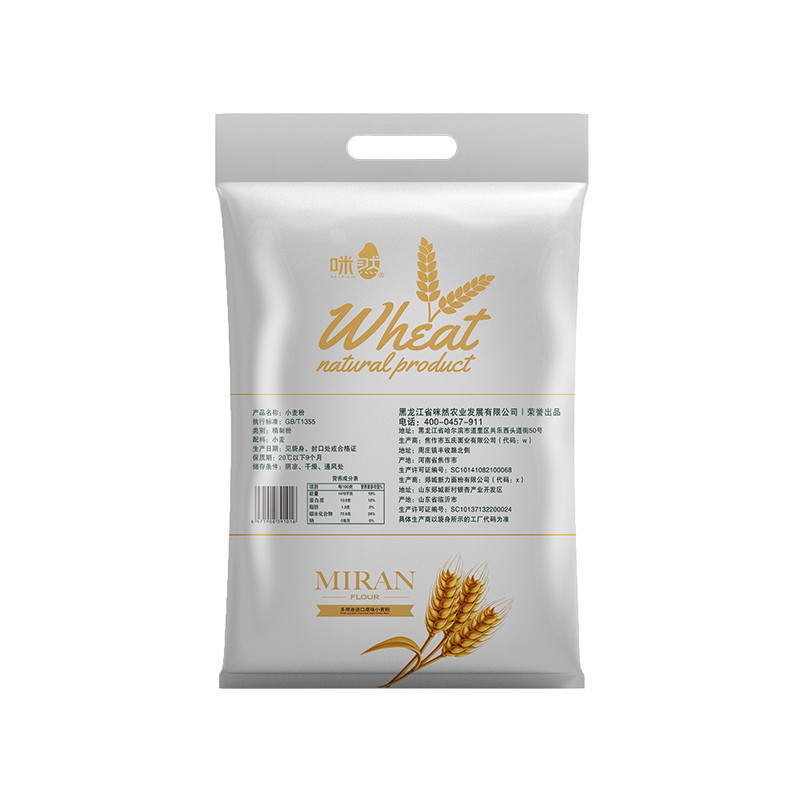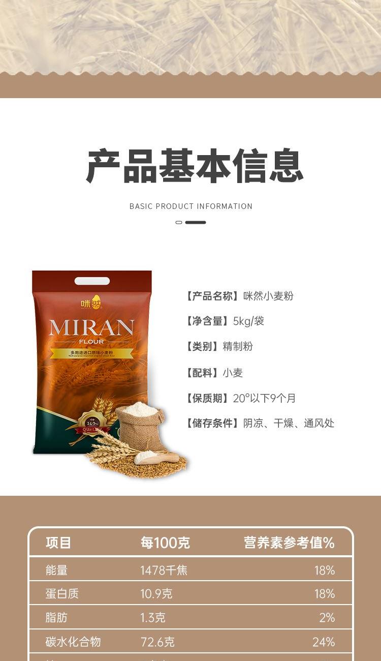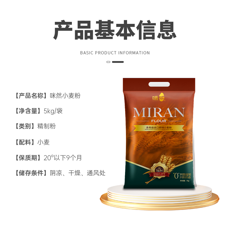 产 品 :咪然多用途进口原味小麦粉5kg 执行标准 : GB/T 1355 保 质 期 :9个月 产 地 :河南焦作 箱 规 :5*5kg