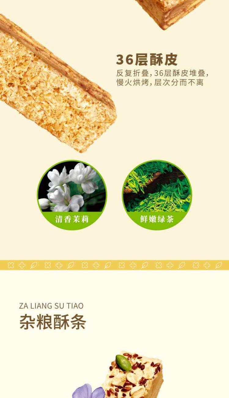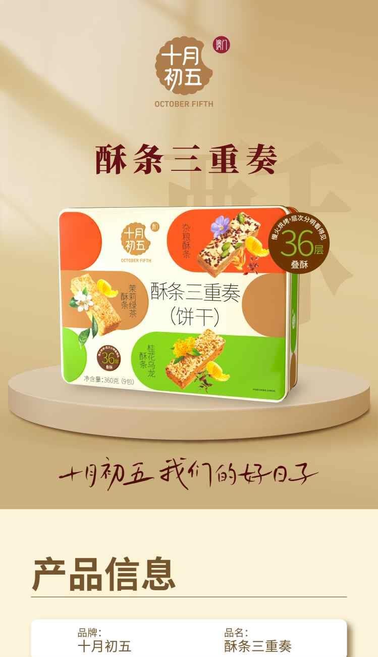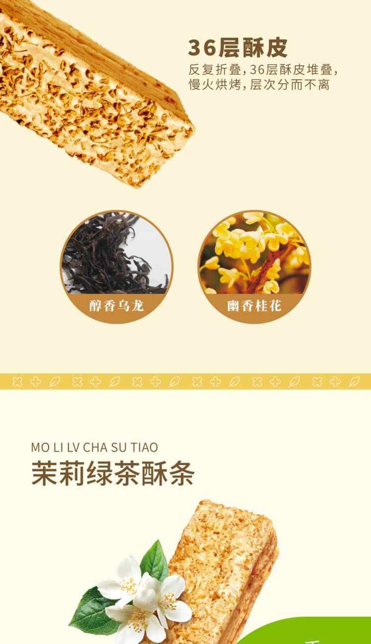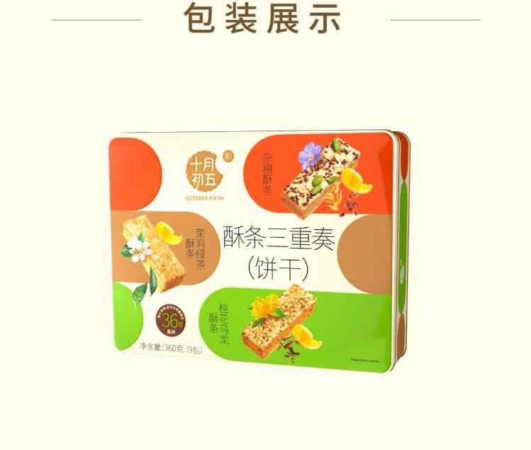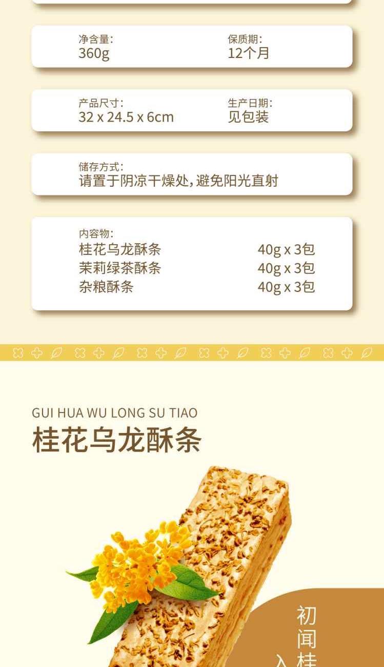 十月初五酥条三重奏 净含量:360g 40g桂花乌龙酥条X3小包 40g茉莉绿茶酥条X3小包 40g杂粮酥条X3小包