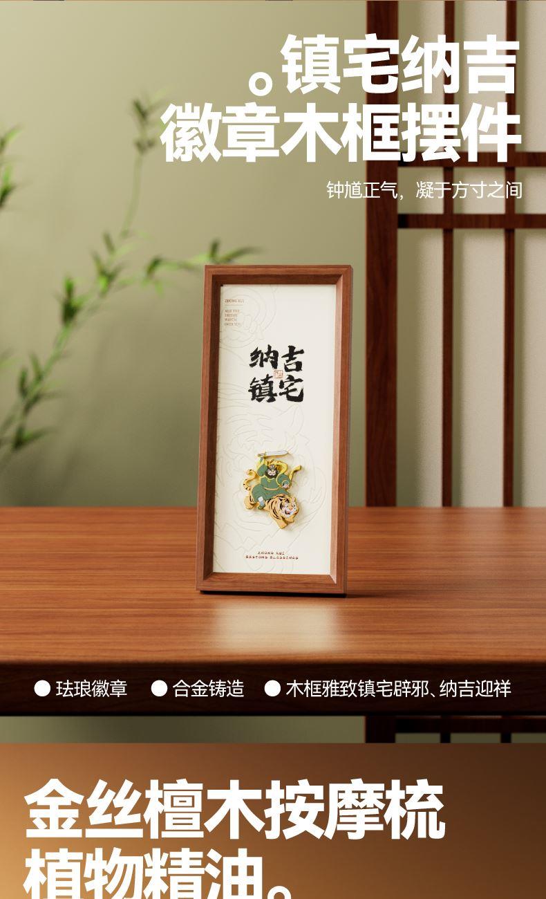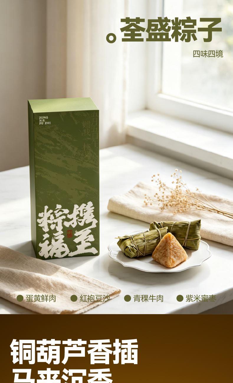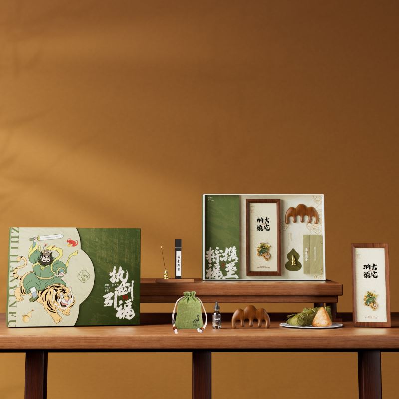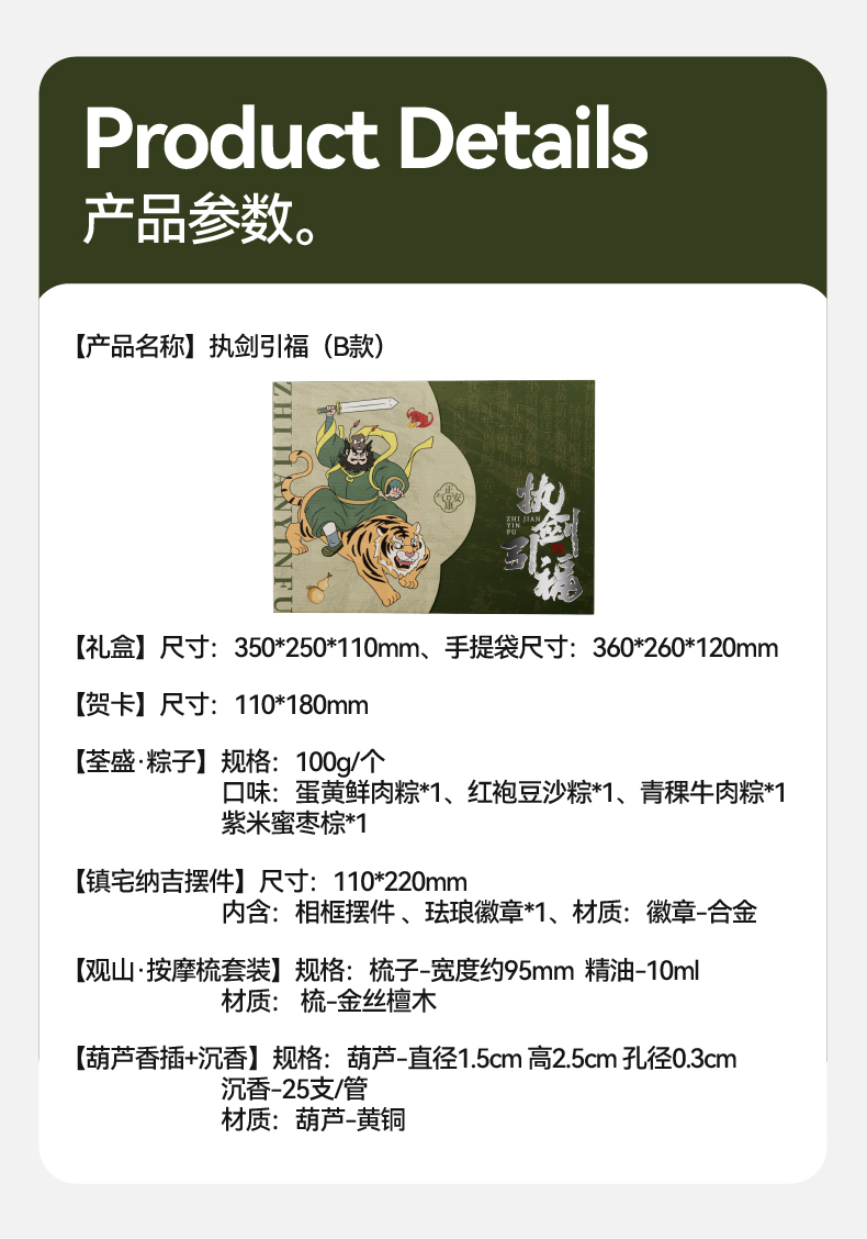 钟馗镇宅,正气凝于盒上;福牌纳吉,瑞意藏于器中 一枚咸蛋映端午之俗,一尊摆件立浩然之风 角黍寄情,糯香传意 一盒风骨,半是民俗祥瑞,半是君子气节 赠者有心,愿君岁岁端阳,安康顺遂,福运长随 内配: 配置一:礼盒&手袋x1 配置二:荃盛·粽子x4 配置三:镇宅纳吉·徽章木框摆件x1 配置四:观山·金丝檀按摩梳x1 配置五:精油x1 配置六:黄铜葫芦香插x1 配置七:马来沉香x1配置八:贺卡x1