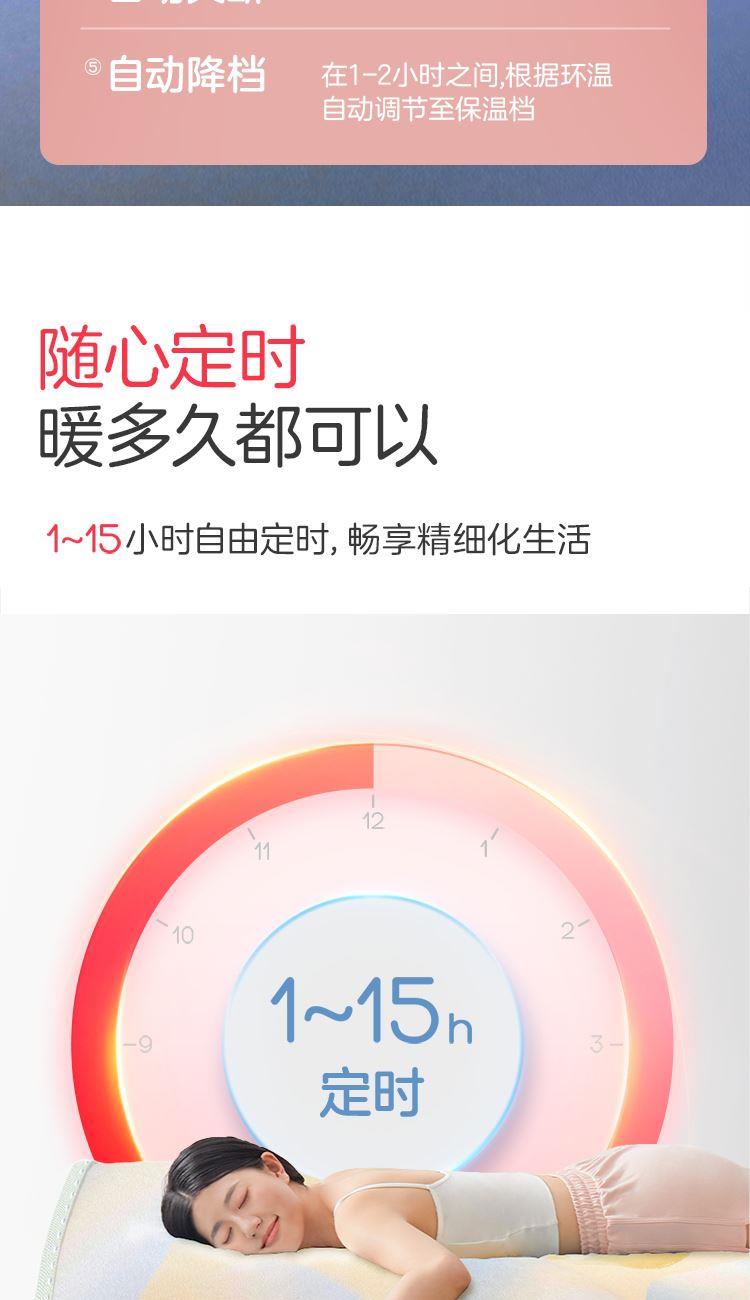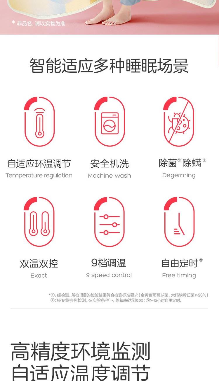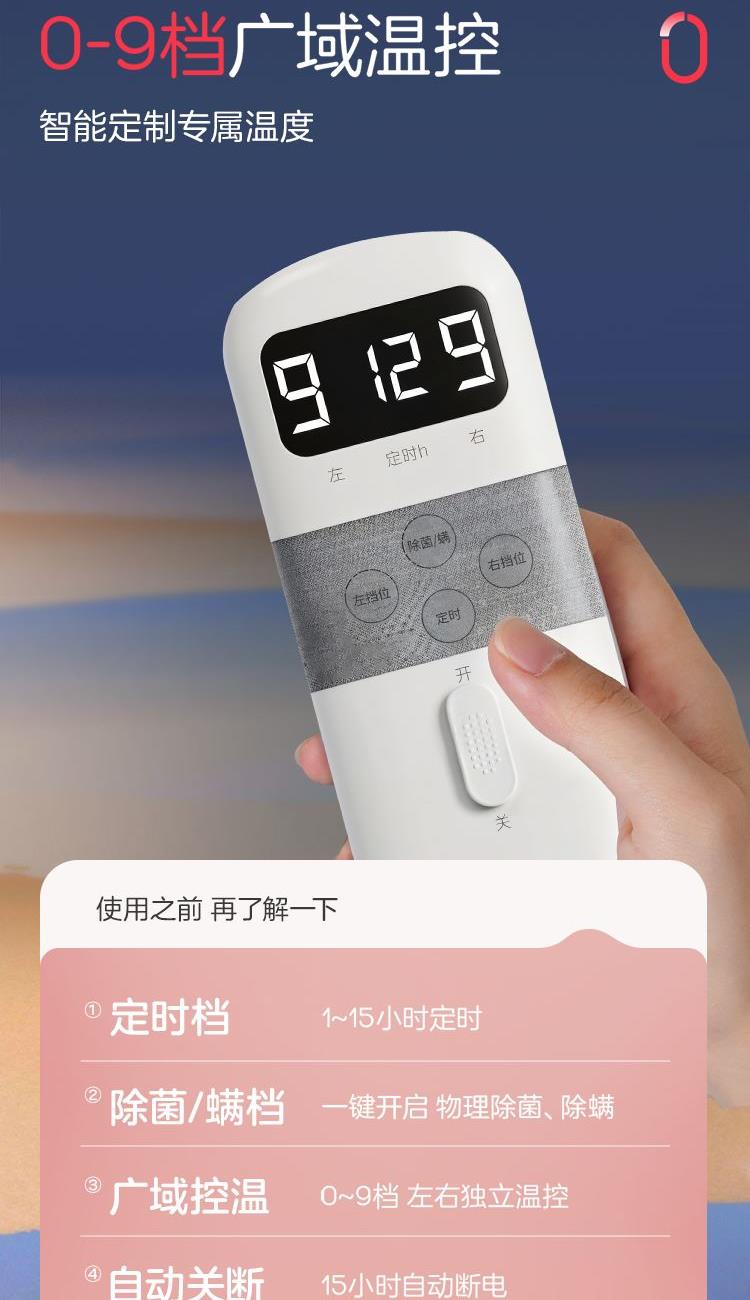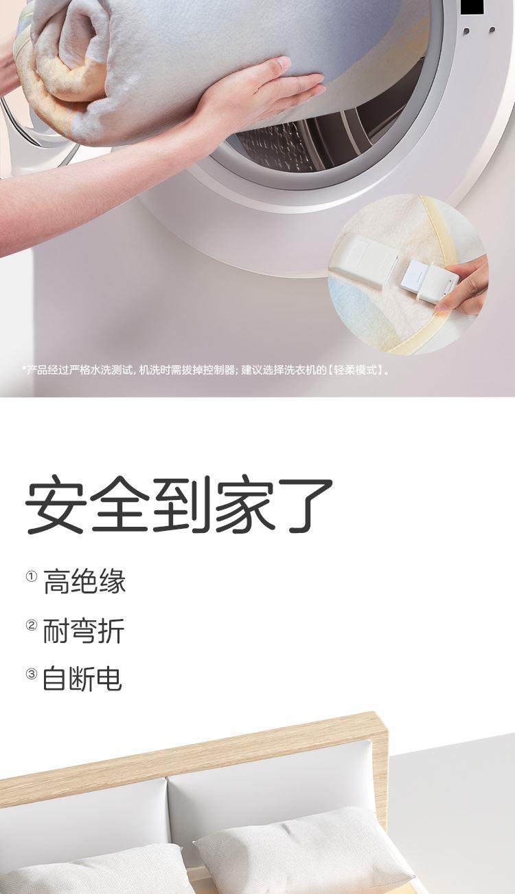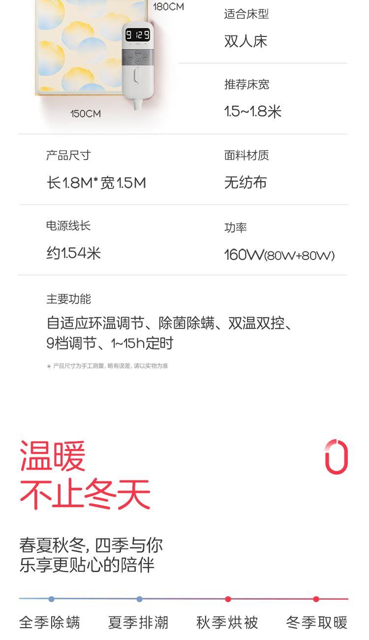参数: 型号:TT180×150-28XN 功率:160W 功能:可水洗,NTC自动调温、9档调温、1-15小时定时、一键除螨 面料:化纤 包装:彩盒 卖点: 1、安全机洗,轻松焕新 2、NTC自动调温 3、全线路安全保护 4、一键除螨 5、9档调温