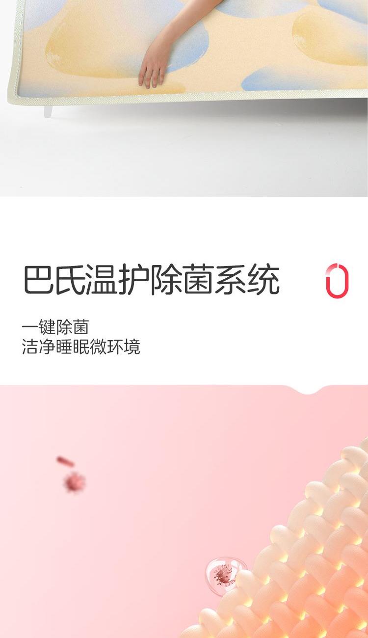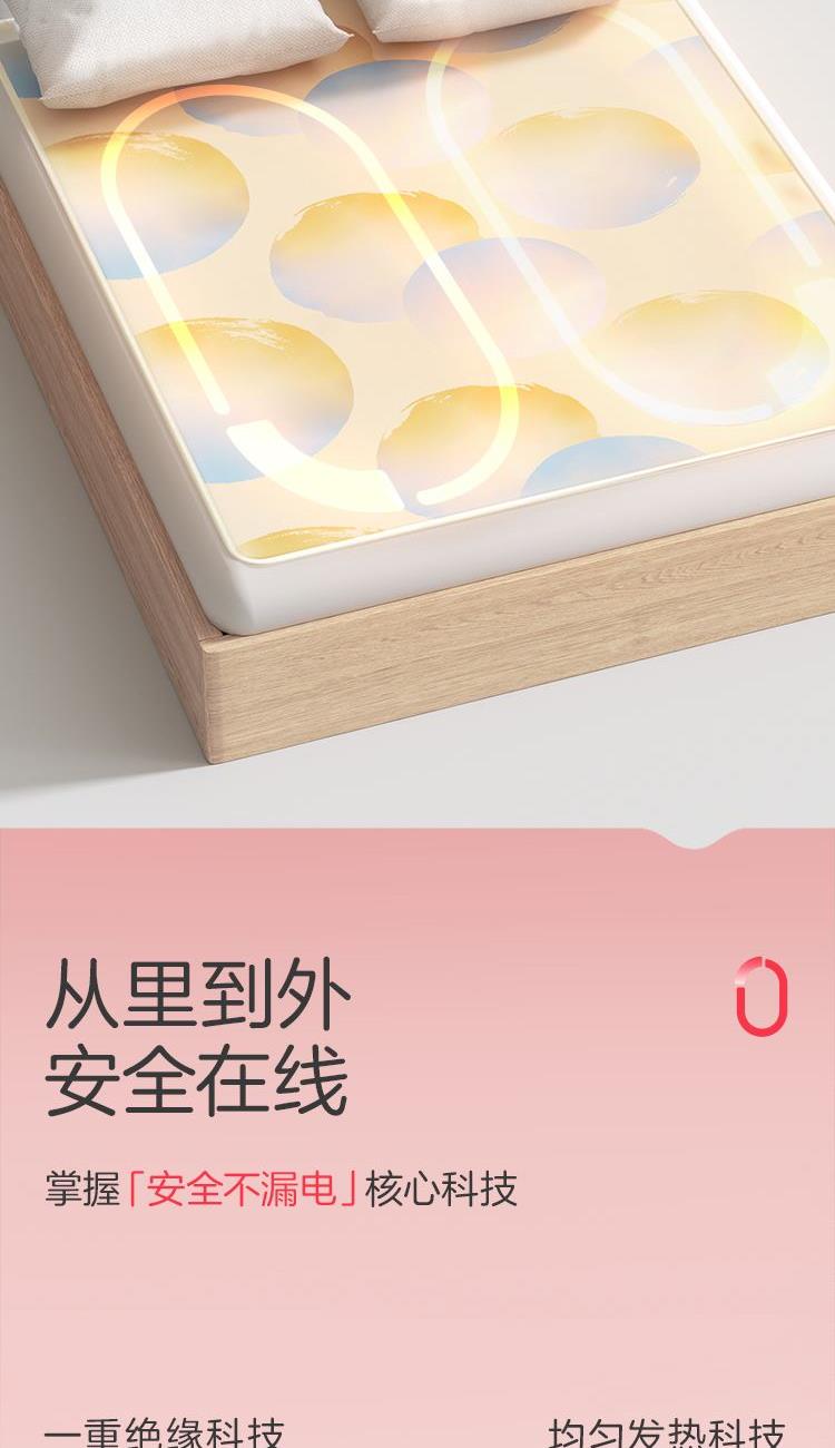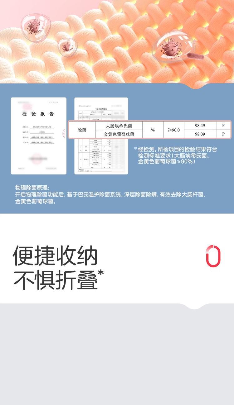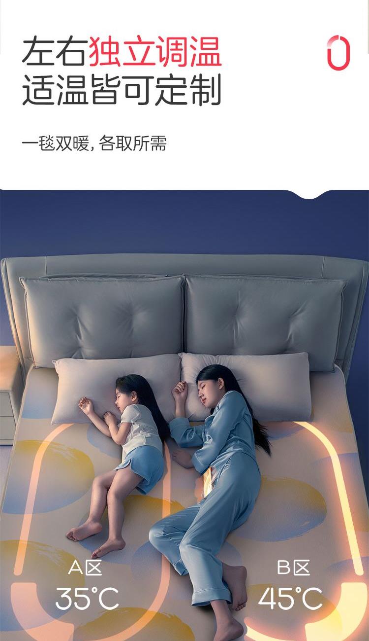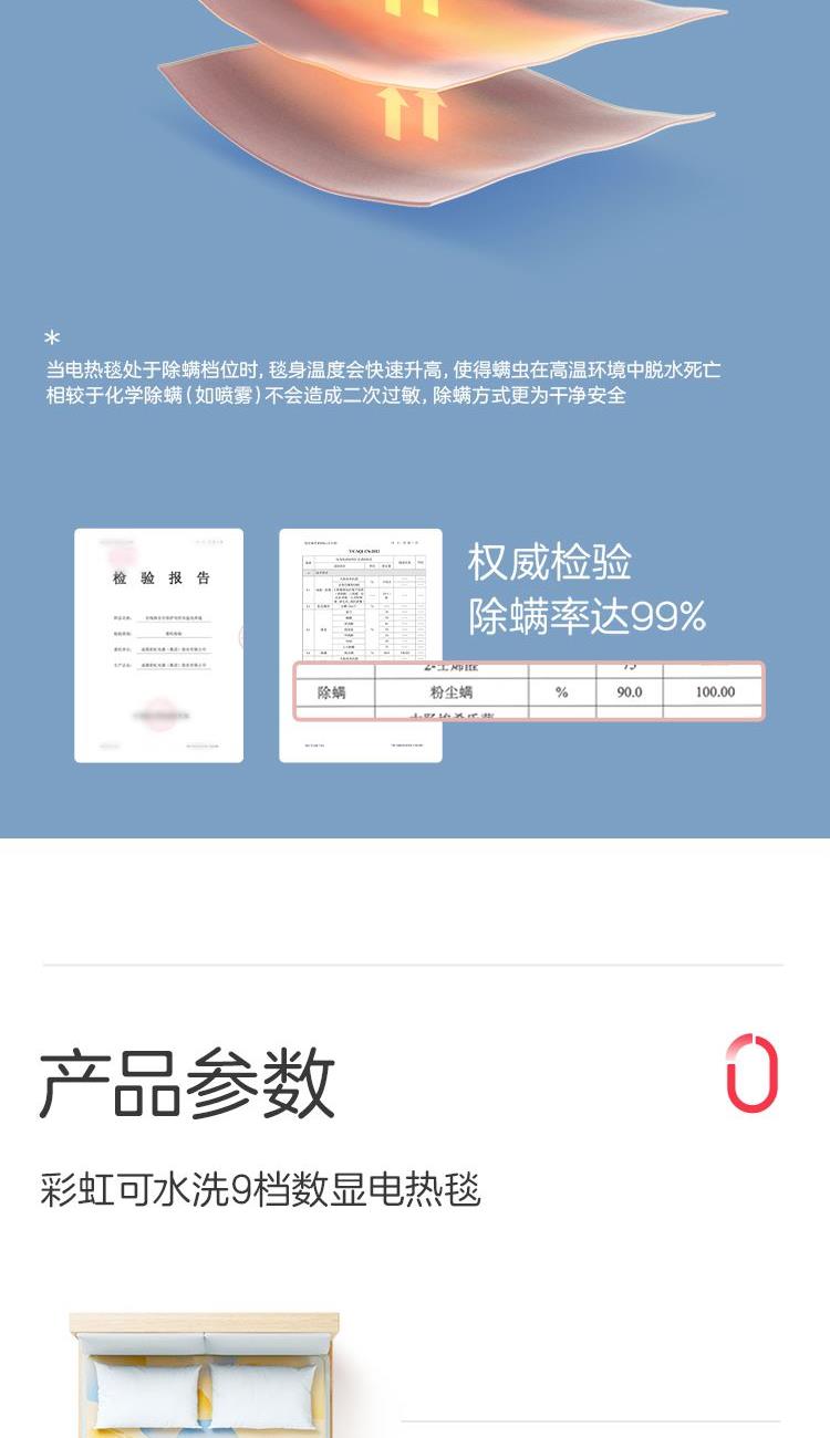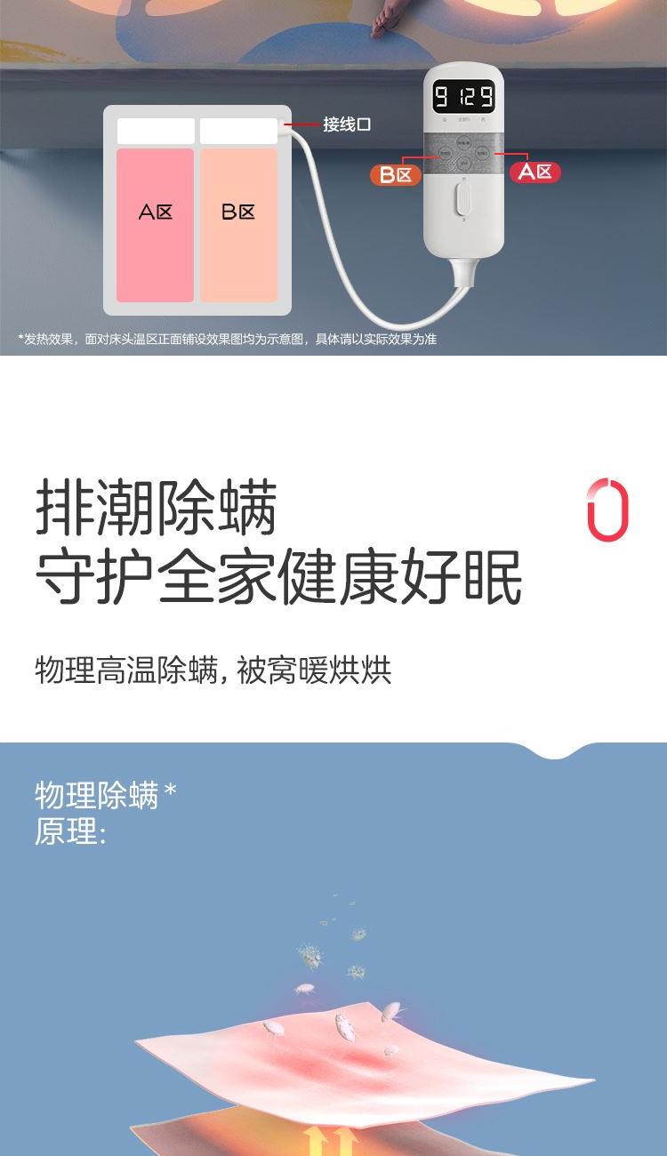 参数: 型号:TT180×150-28XN 功率:160W 功能:可水洗,NTC自动调温、9档调温、1-15小时定时、一键除螨 面料:化纤 包装:彩盒 卖点: 1、安全机洗,轻松焕新 2、NTC自动调温 3、全线路安全保护 4、一键除螨 5、9档调温