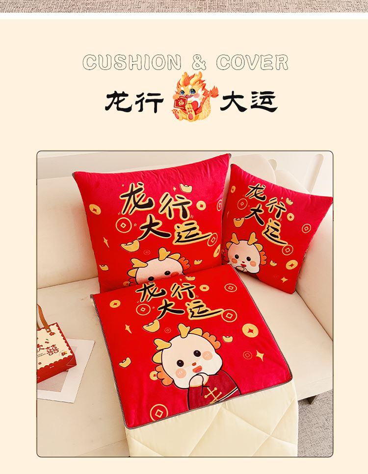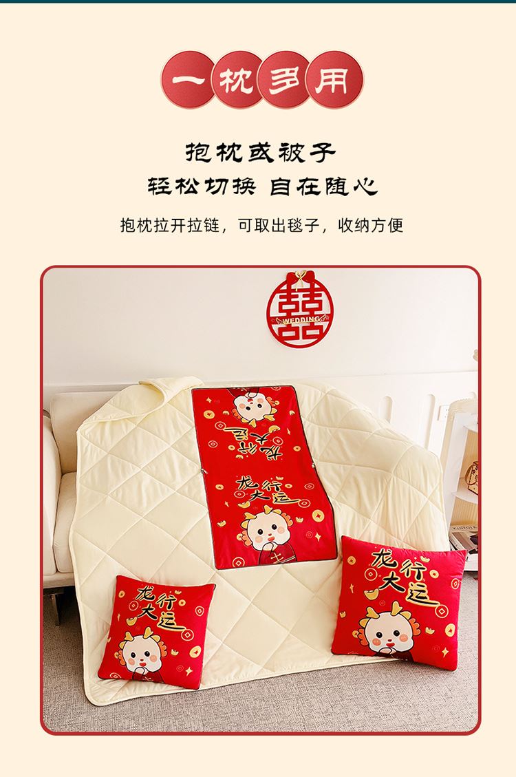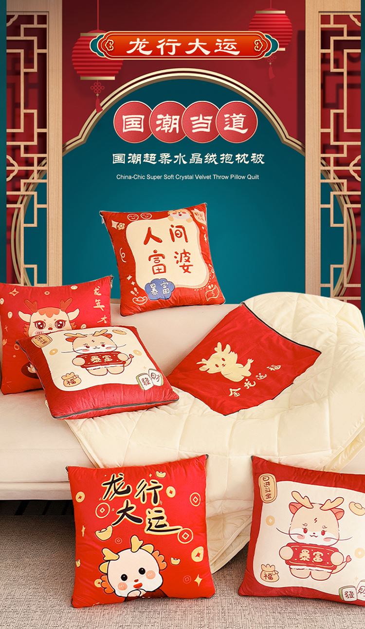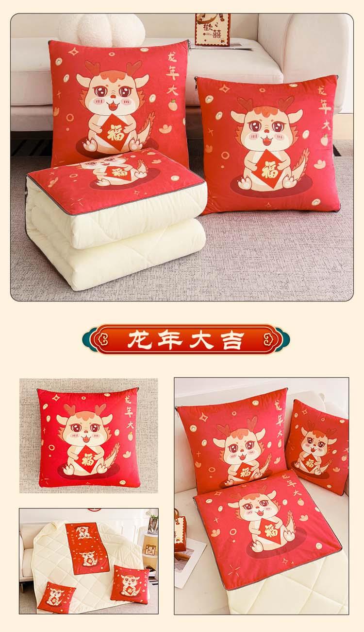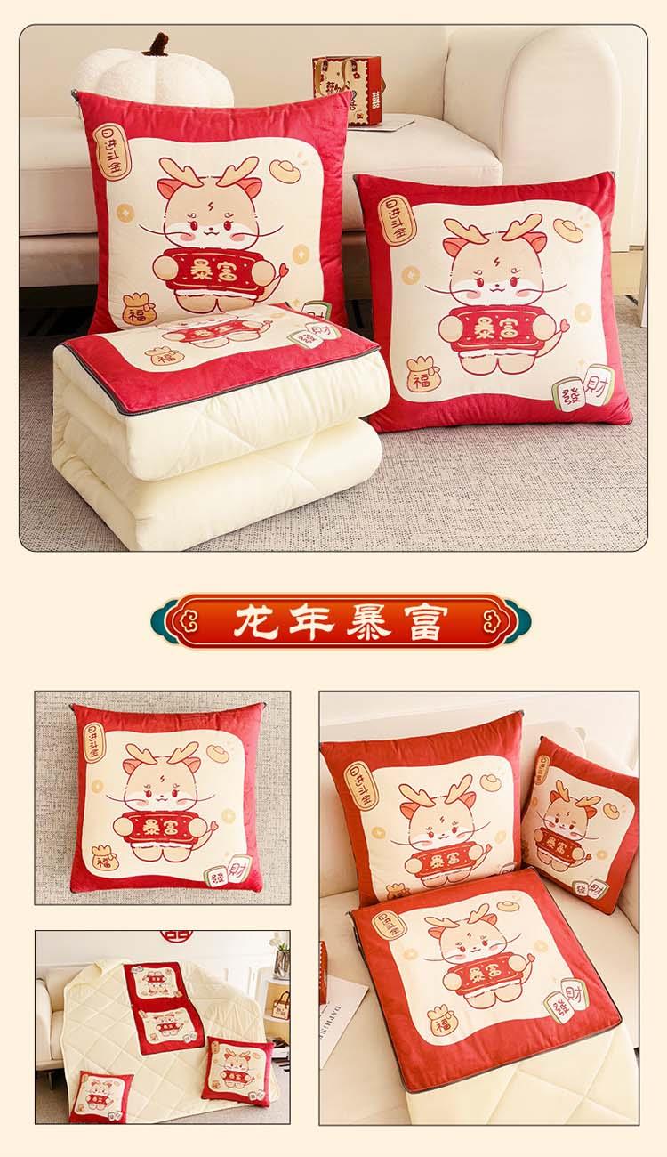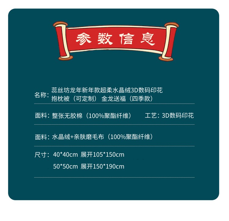 花色:金龙送富/龙年暴富/龙年大吉/龙行大运/人间富婆/可一件定制 规格:折叠40*40cm展开105*150cm 面料:整张无胶棉(聚酯纤维) 填充:水晶绒+亲肤磨毛布(聚酯纤维) 工艺:3D数码印花 国潮当道,超柔水晶绒抱枕被 ,以国潮艺术为灵感展现现在艺术美学, 将中国文化经典传统元素,用抱枕的形式展现设计新潮 ,寓意美好 一枕多用 ,轻松切换 ,自在随心, 整张棉填充 ,久用不起坨, 不跑棉 ,久洗耐用, 新一代数码印花。