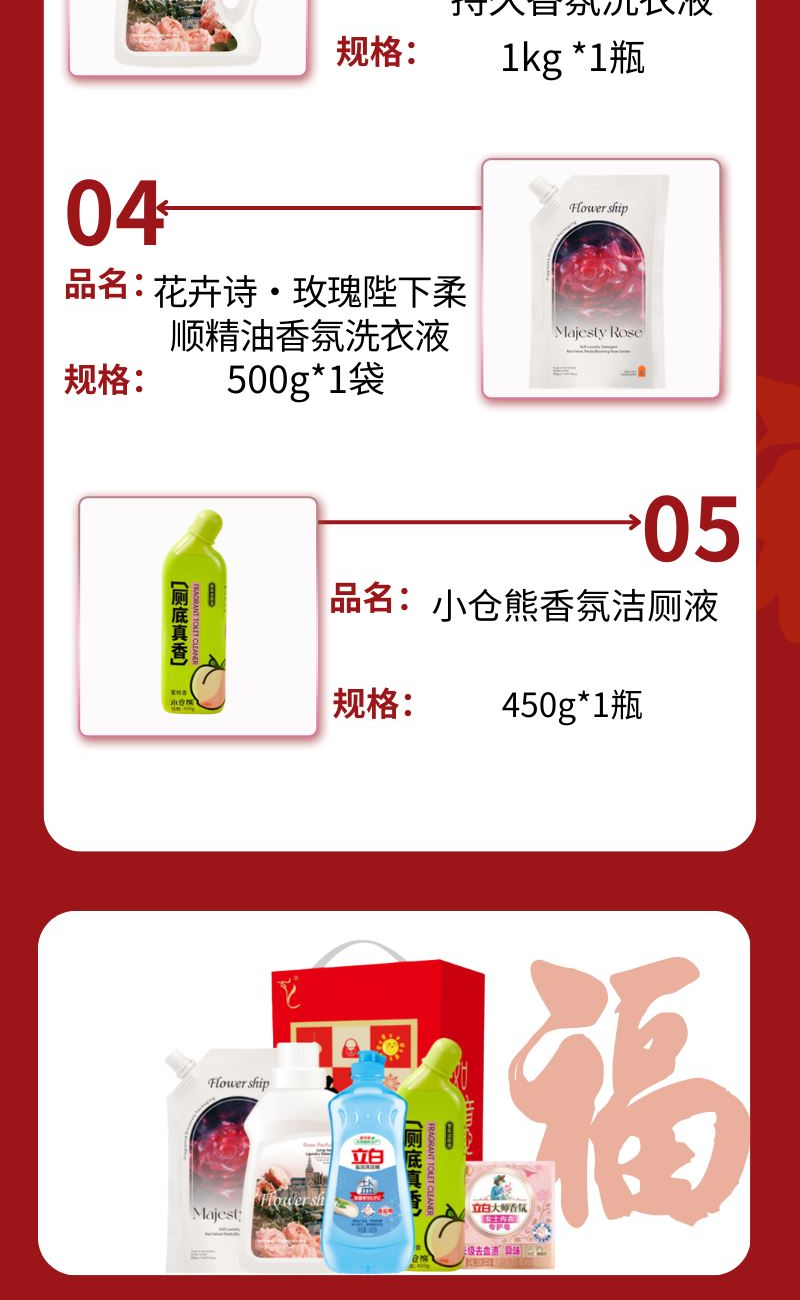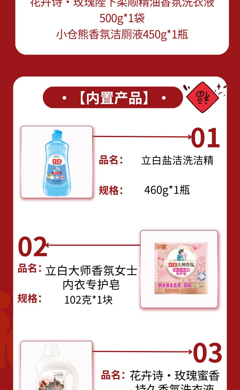 配置: 立白盐洁洗洁精460g*1瓶 立白大师香氛女士内衣专护皂102克*1块 花卉诗·玫瑰蜜香持久香氛洗衣液1kg *1瓶 花卉诗·玫瑰陛下柔顺精油香氛洗衣液500g*1袋 小仓熊香氛洁厕液450g*1瓶 卖点: 可选产品丰富多样,礼箱随心组合,多种价位因需而定,充分满足各种送礼需求,是商务送礼、单位福利的用心之选。