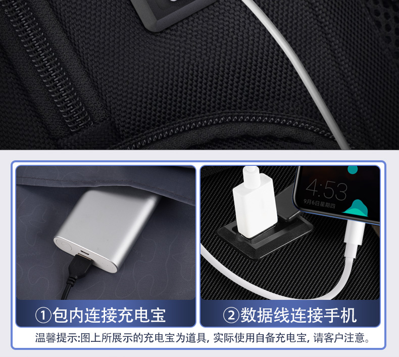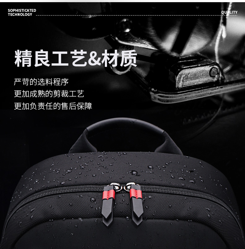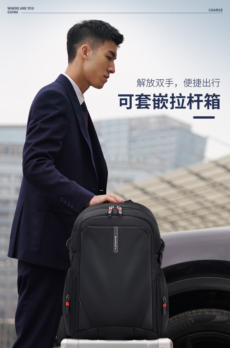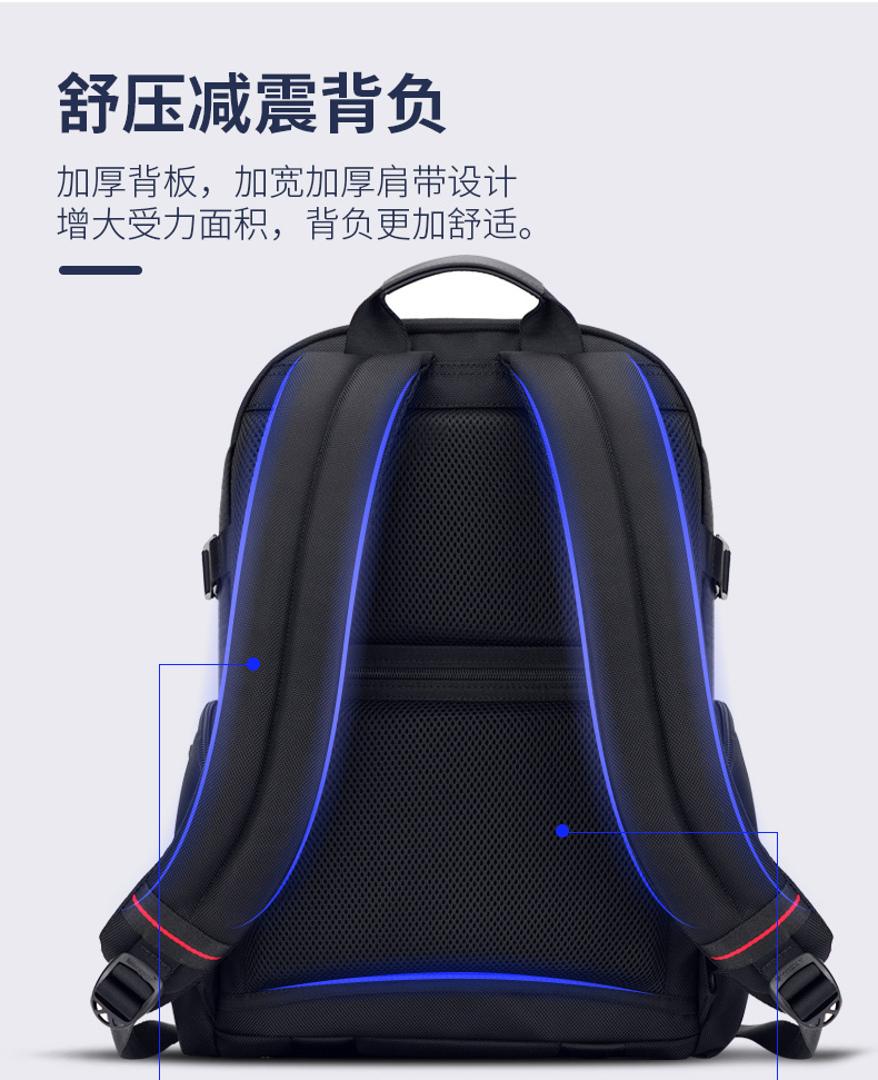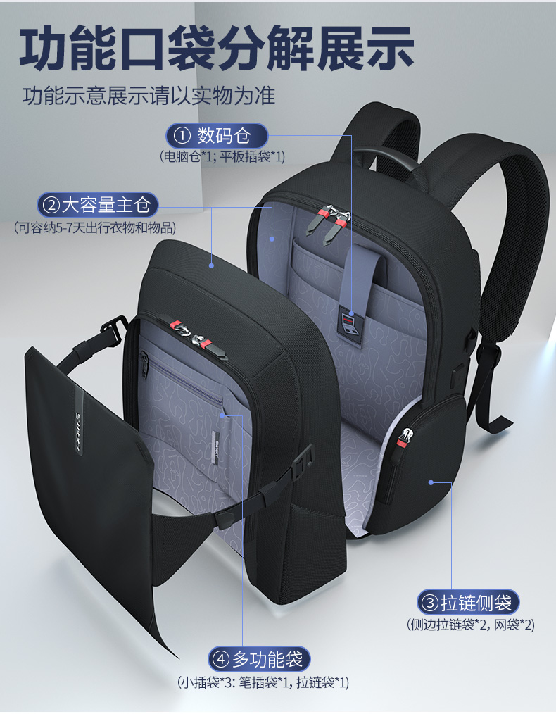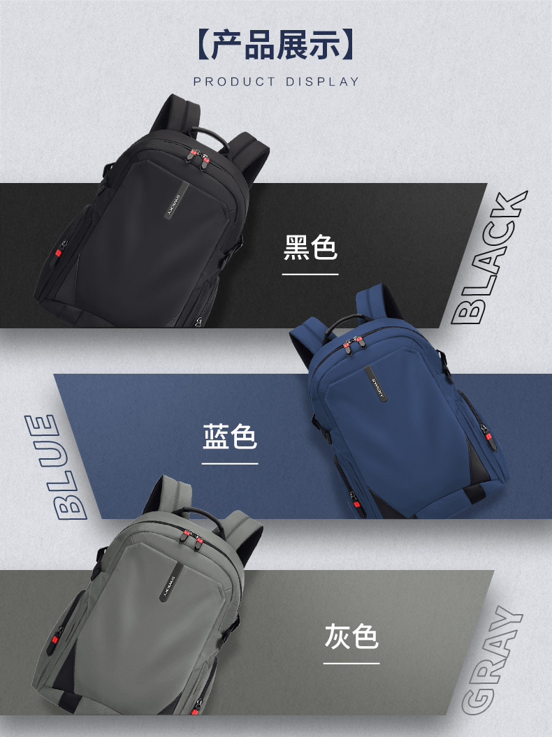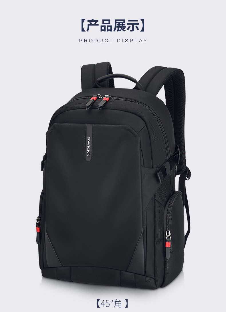 型号:88099黑色 尺寸: 34 x 18 x 47cm 重量:1.1KG 材质: 涤纶织物 1.时尚商务款,流线性弧型设计,多隔层,兼具功能于时尚. 2.内置电脑隔层,干湿分离收纳仓,文具收纳组,大容量衣物主袋 3.采用1680D防水面料+超纤皮,经久耐用。 4.采用物理机械防盗拉链,防暴力开启,让物品更安全。 5.加厚背板,加宽加厚肩带设计,增加受力面积,背负更舒适. 6.新型揭盖式USB接头,美观,有效防尘防泼水
