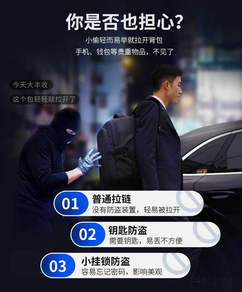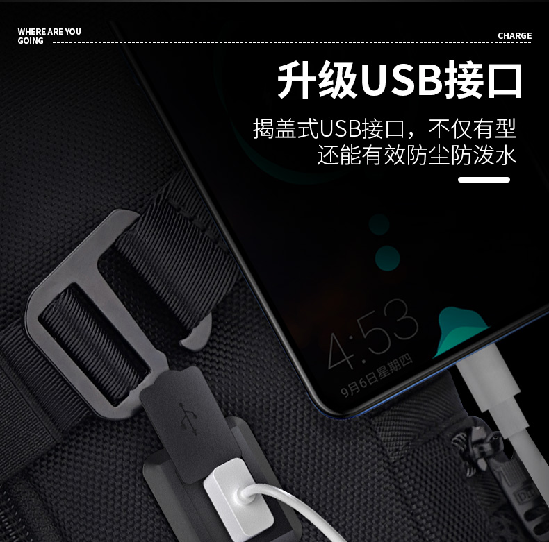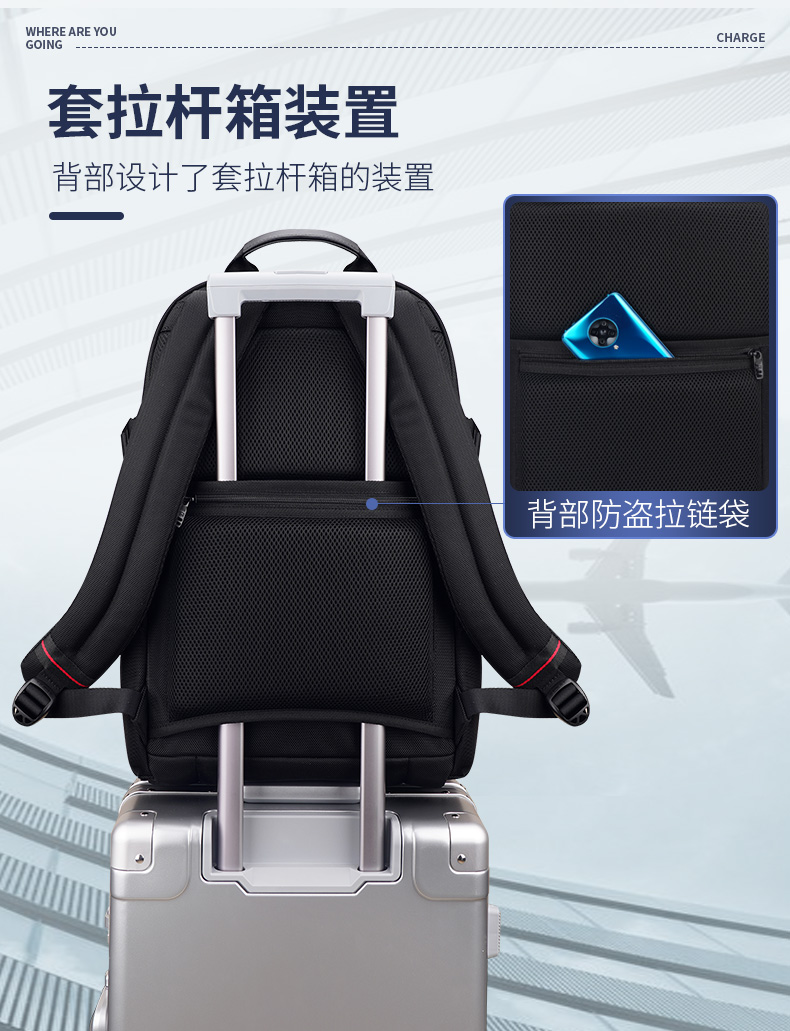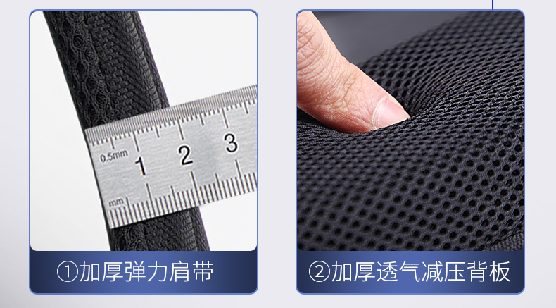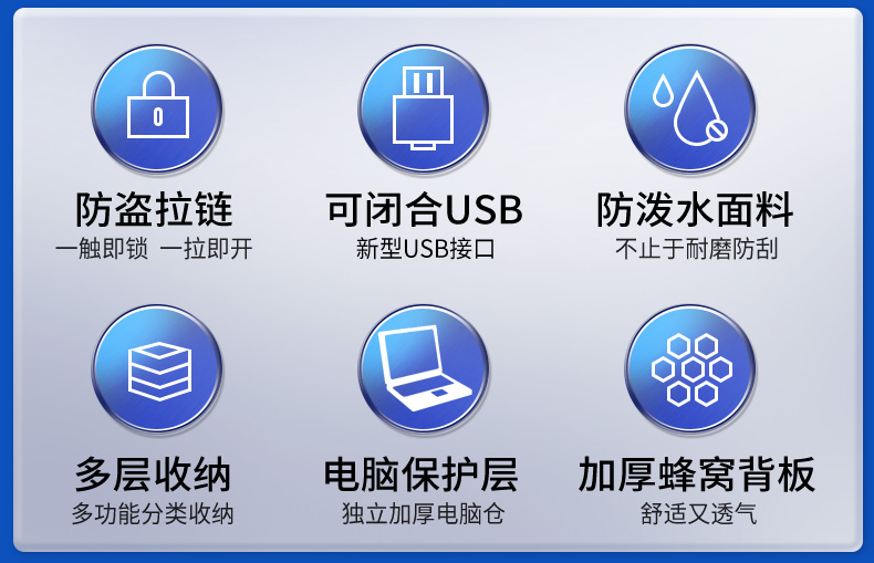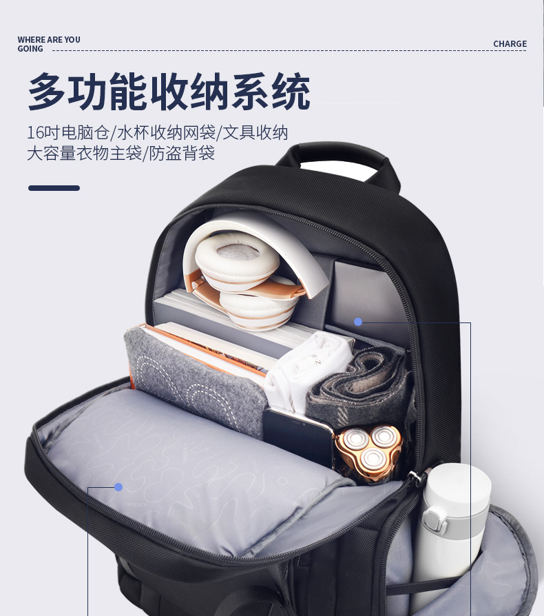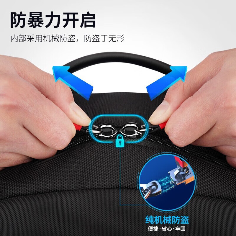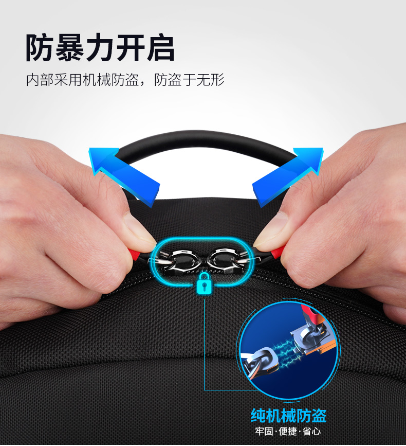 型号:88099黑色 尺寸: 34 x 18 x 47cm 重量:1.1KG 材质: 涤纶织物 1.时尚商务款,流线性弧型设计,多隔层,兼具功能于时尚. 2.内置电脑隔层,干湿分离收纳仓,文具收纳组,大容量衣物主袋 3.采用1680D防水面料+超纤皮,经久耐用。 4.采用物理机械防盗拉链,防暴力开启,让物品更安全。 5.加厚背板,加宽加厚肩带设计,增加受力面积,背负更舒适. 6.新型揭盖式USB接头,美观,有效防尘防泼水