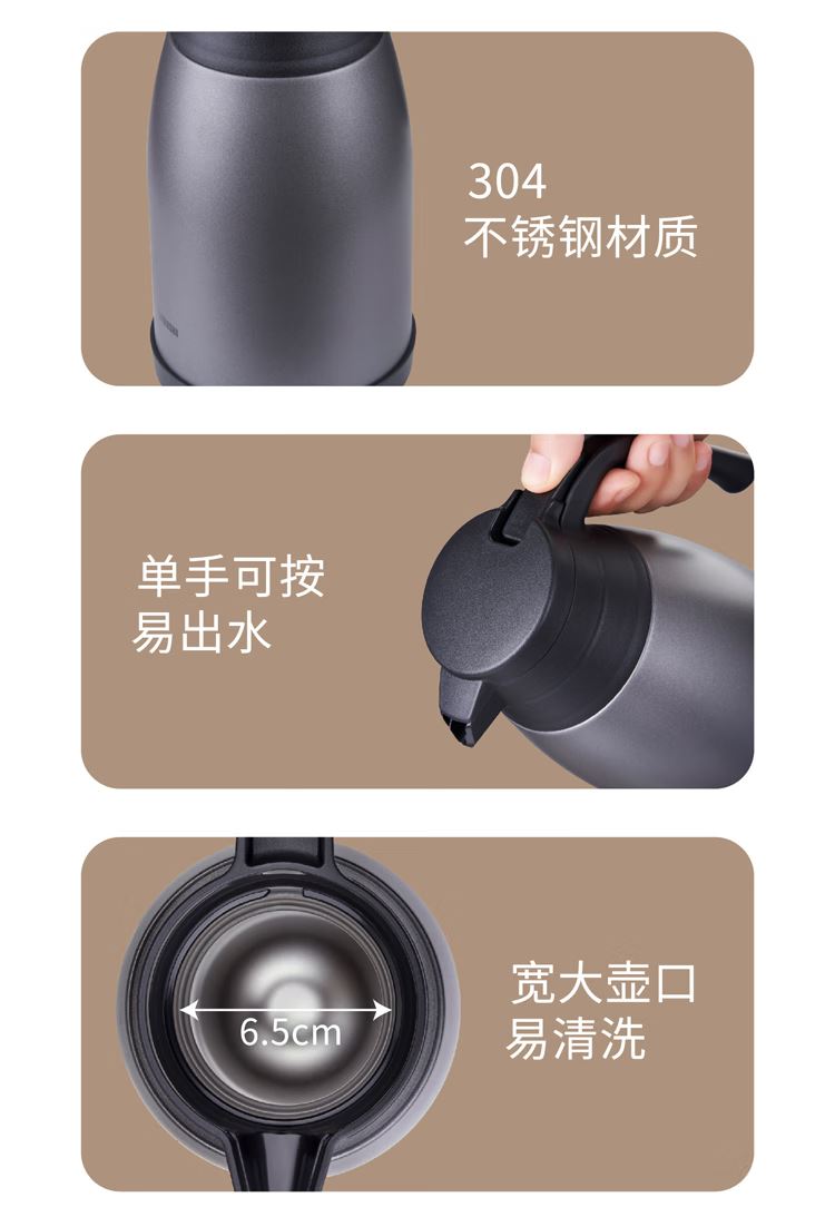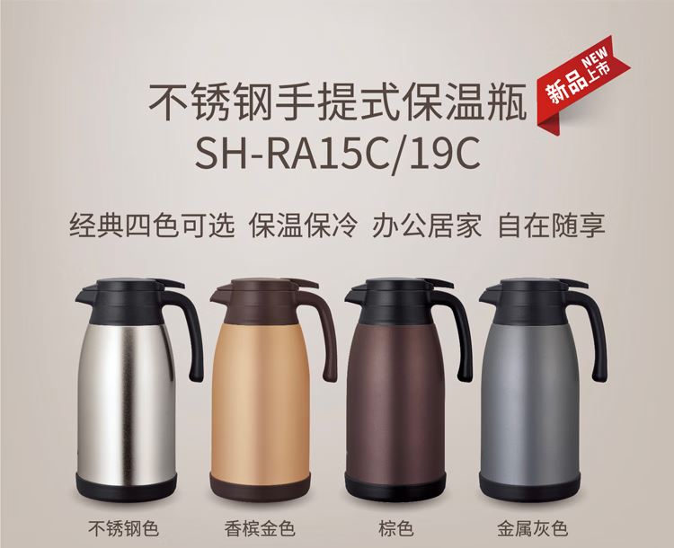 品 牌:象印ZOJIRUSHI 型 号:SH-RA19C 颜 色:TA棕色/HM灰色/NL香槟色/XA不锈钢 容 量:1.9L 类 型:按压式保温壶 材 质:304不锈钢 保 温:6小时约60°C 保 冷:6小时约10°C以下 产 地:中国