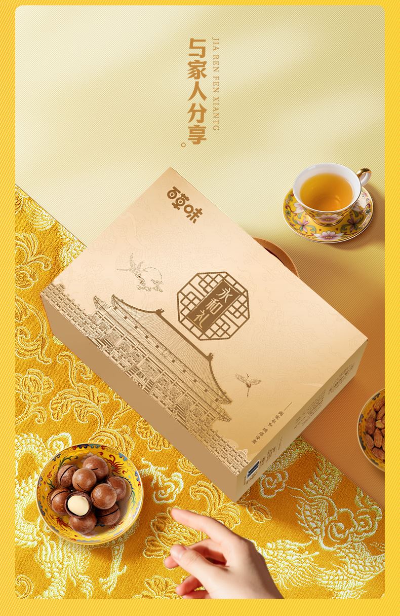 礼盒尺寸mm(长*宽*高):430*150*305 东北松子 60g 夏威夷果(奶油味) 60g 炭烧腰果(蟹黄味)60g 巴旦木(奶油味)60g 小白杏核(奶香味)100g 纸皮核桃 100g 虎皮凤爪(卤香味)68g 鸭脖(甜辣味)65g 爆汁卤花生(五香味)228g香酥青豌豆(蒜香味) 70g 甜心灰枣 70g 燕麦片(原味)100g 每日坚果乳 310g 坚果八宝粥360g