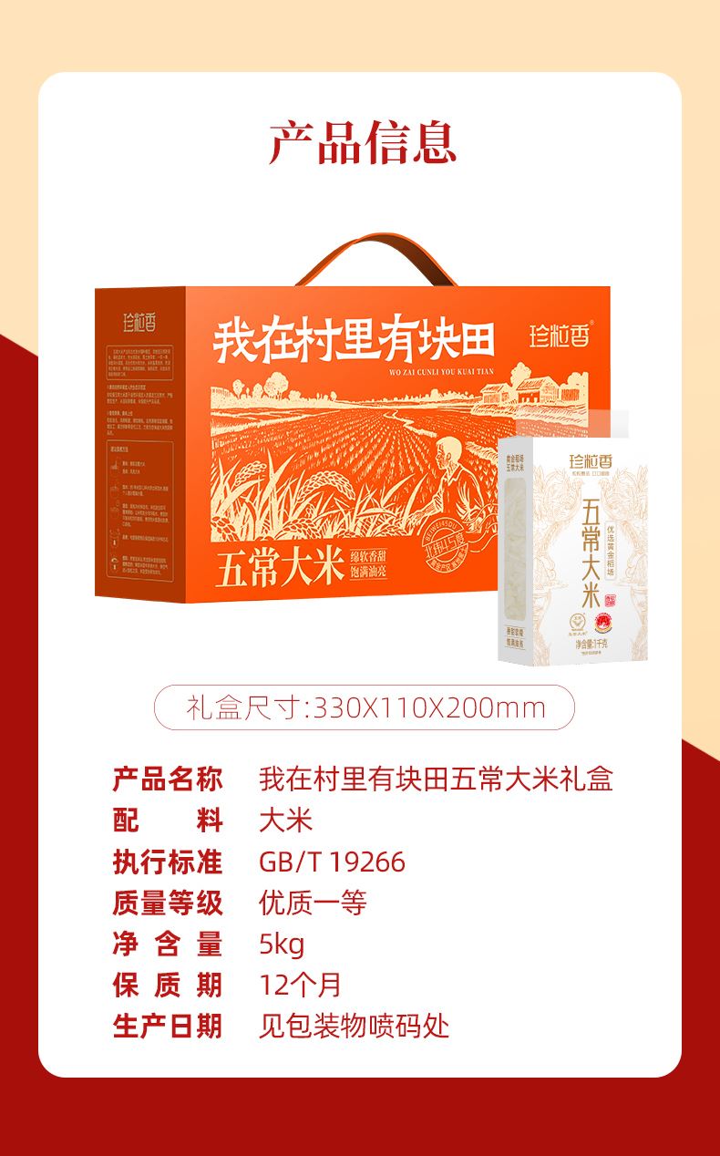 产品规格:1kgX5 质量等级:优质一等 产品标准:GB/T 19266 产品包装:小盒装+礼盒 产品规格:4盒/箱 产品尺寸:330*110*195mm 条 码:6976641150210 发 货 地:黑龙江省五常市 推荐理由: 1、五常龙凤山种植,稻米核心产区 2、145天超长种植期,一年一季 3、清澈河水灌溉,富含微量元素 4、精美礼盒包装,送礼佳选
