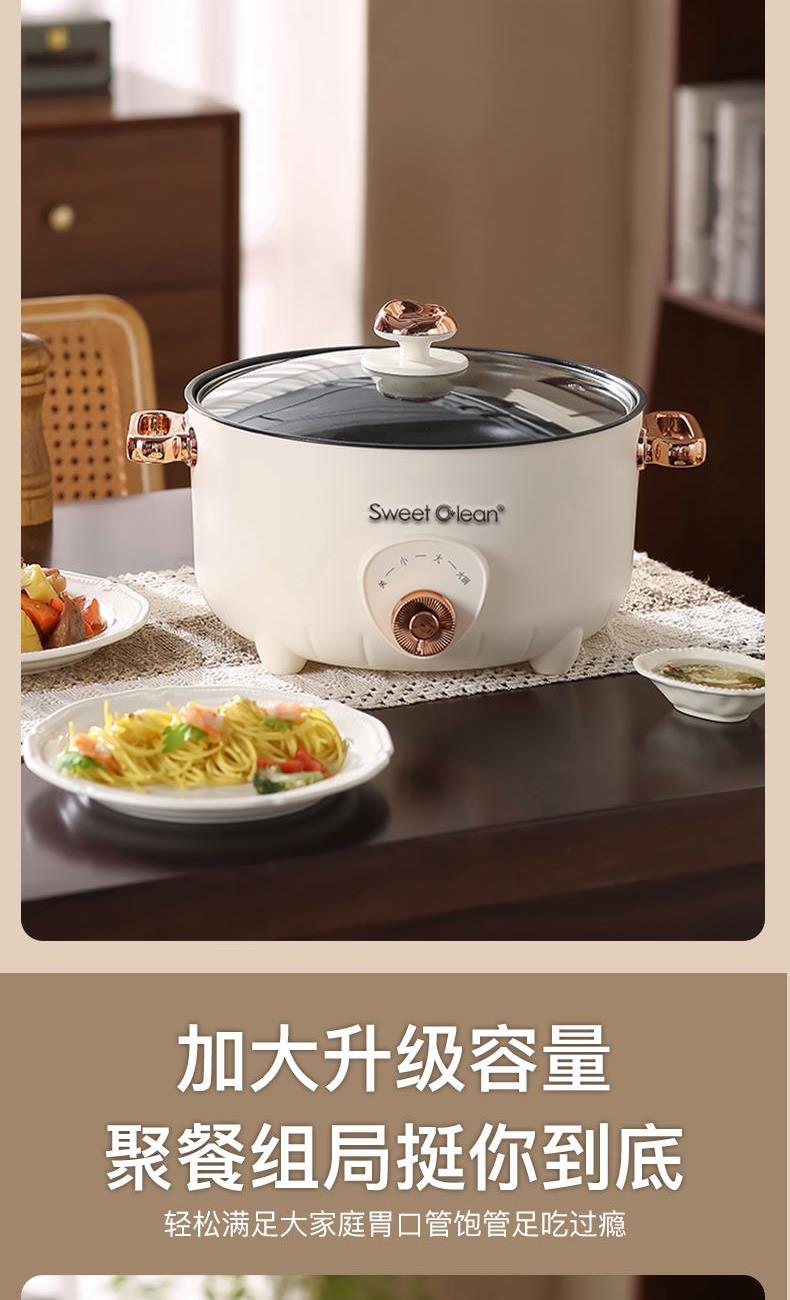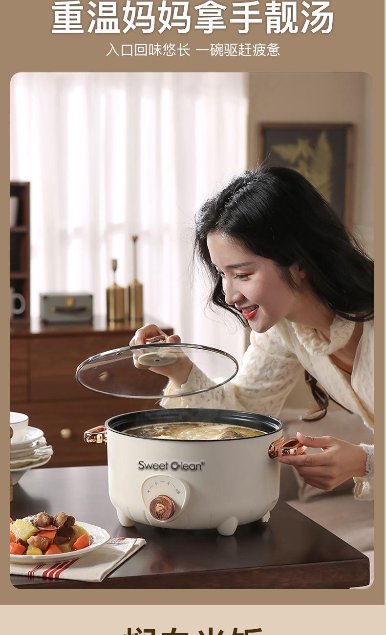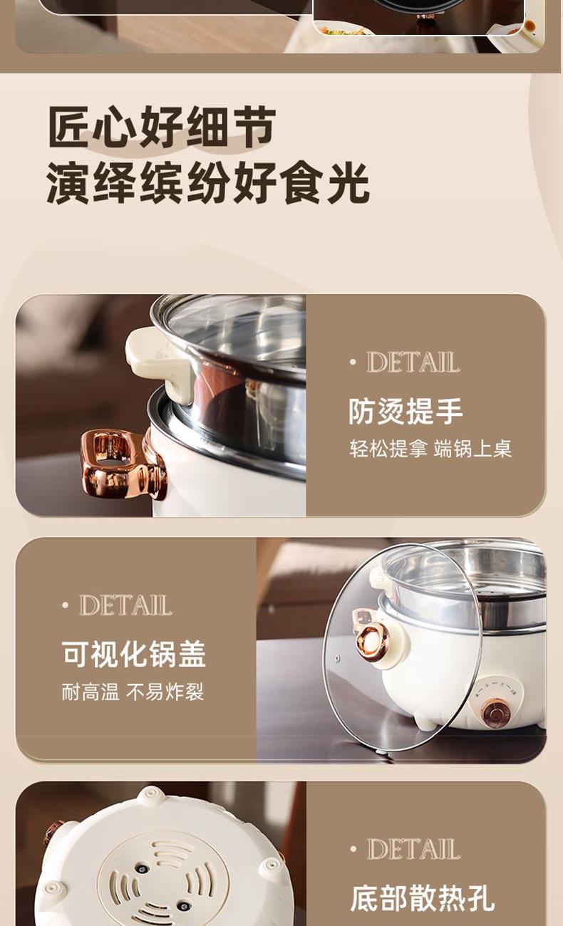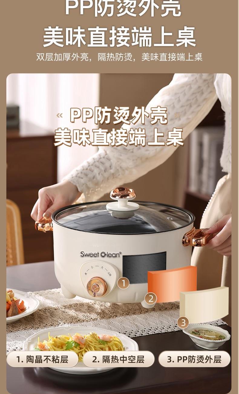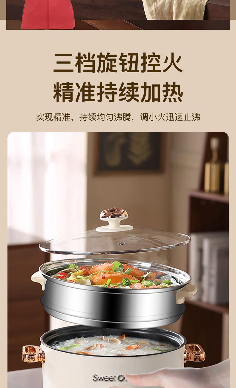 精通蒸/煮/涮的电火锅一锅多用美食享不停,蒸、一锅同出两种美食,上蒸下煮方便快捷。不粘锅体熬煮不糊,自动保温美味回温,双层防烫更安全,分离式电火锅身蒸架分离便捷清洗,玻璃锅盖,人性化透视化可观察食物状态。蒸笼,选用食品级PP材质健康安全安心。锅身塑料锅身安全防烫外观简约耐看,旋钮一键旋钮选择火力大小可调控操作简单