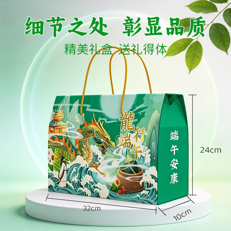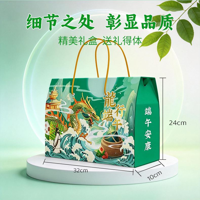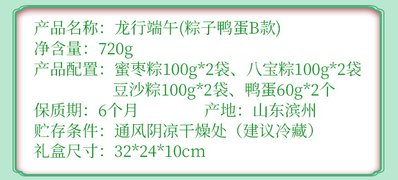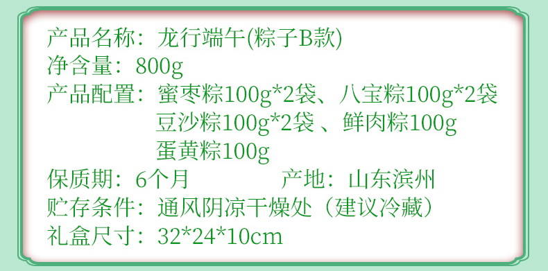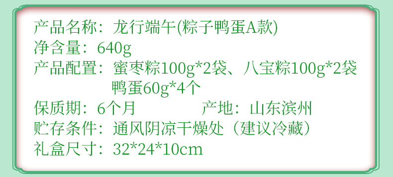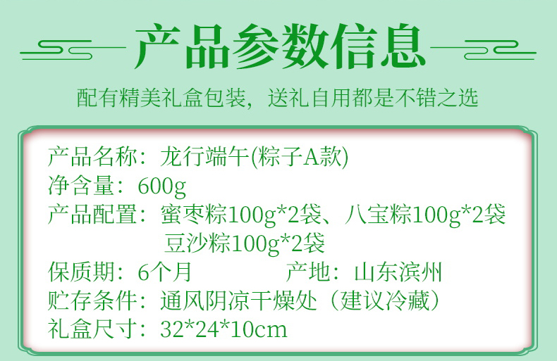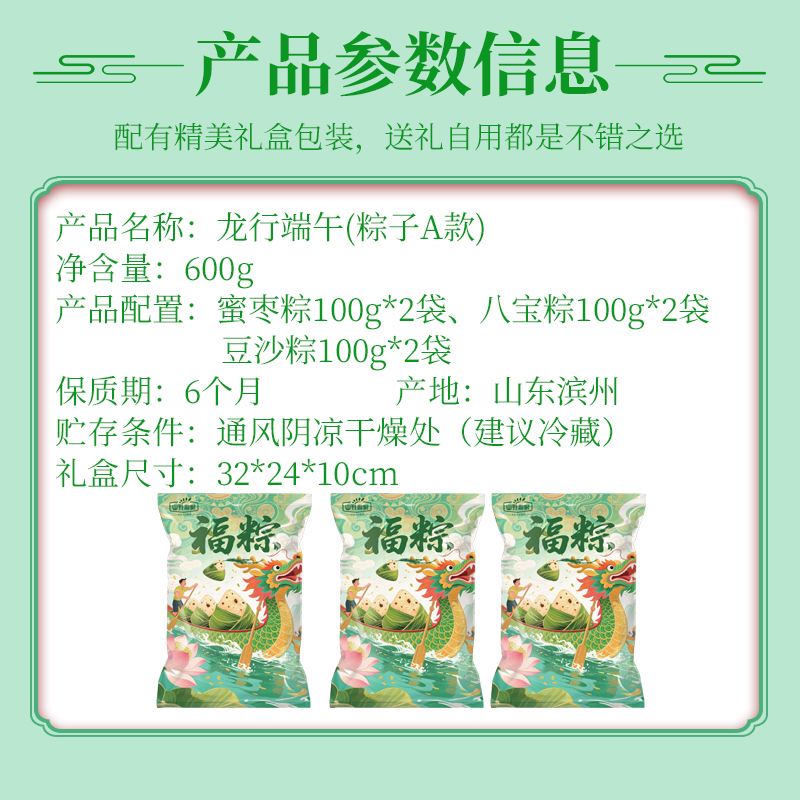 龙行端午A款 净含量:600g 产品规格配置:蜜枣粽100g*2八宝粽100g*2、豆沙粽100g*2盒尺 寸:32*10*24cm 尺寸:63*34*50 箱体积:0.107方 箱重量:10.6kg