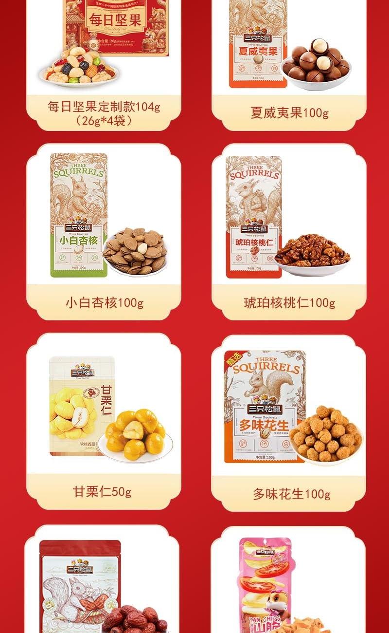 三只松鼠每日坚果定制款104g(26g*4袋) 三只松鼠夏威夷果100g 三只松鼠小白杏核100g 三只松鼠琥珀核桃仁100g 三只松鼠甘栗仁50g 三只松鼠多味花生100g 三只松鼠灰枣75g 三只松鼠山药脆片番茄味60g 三只松鼠小圆饼奶盐味100g 三只松鼠红豆薏米水500ml 三只松鼠红豆薏米水500ml