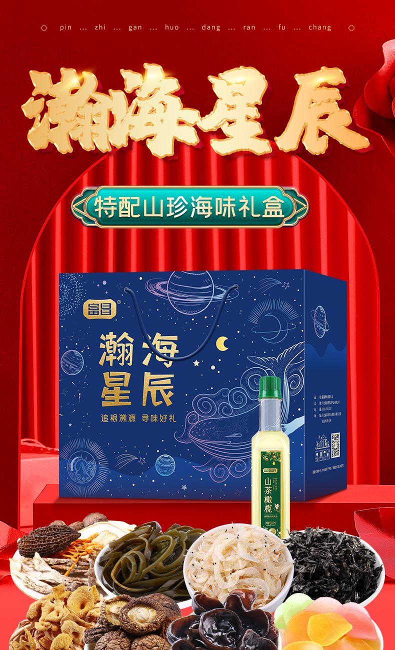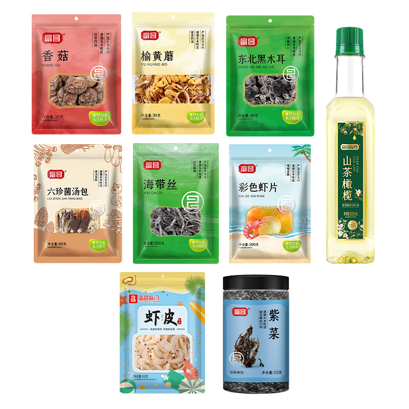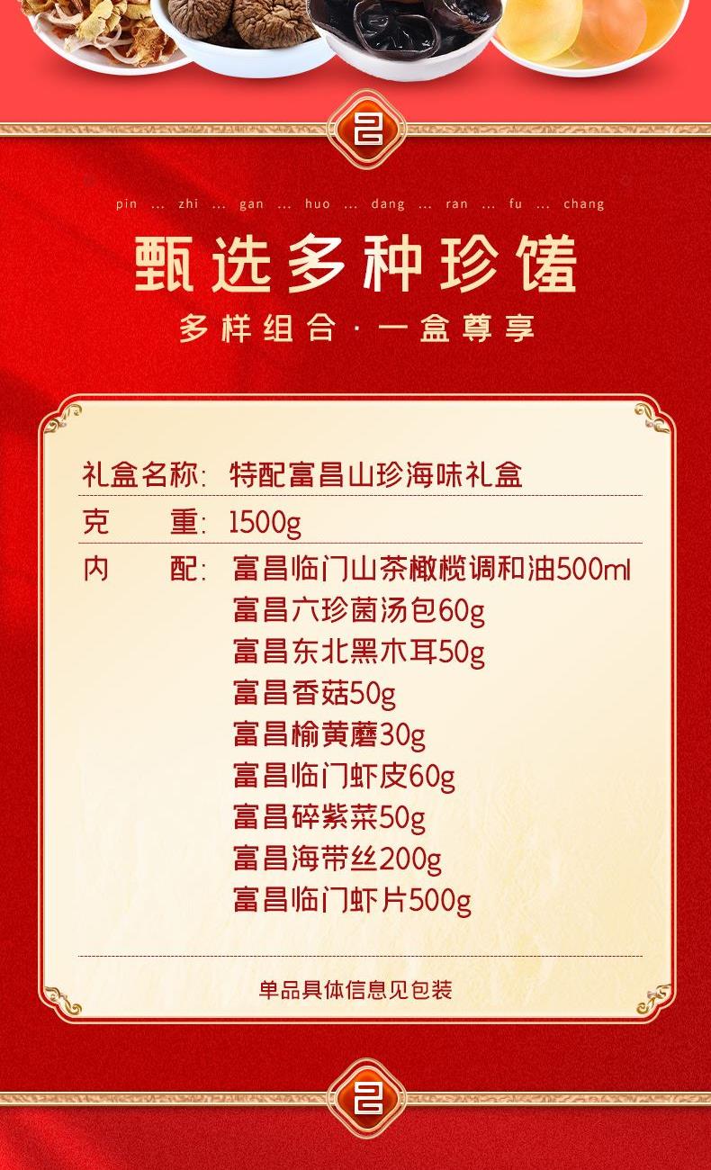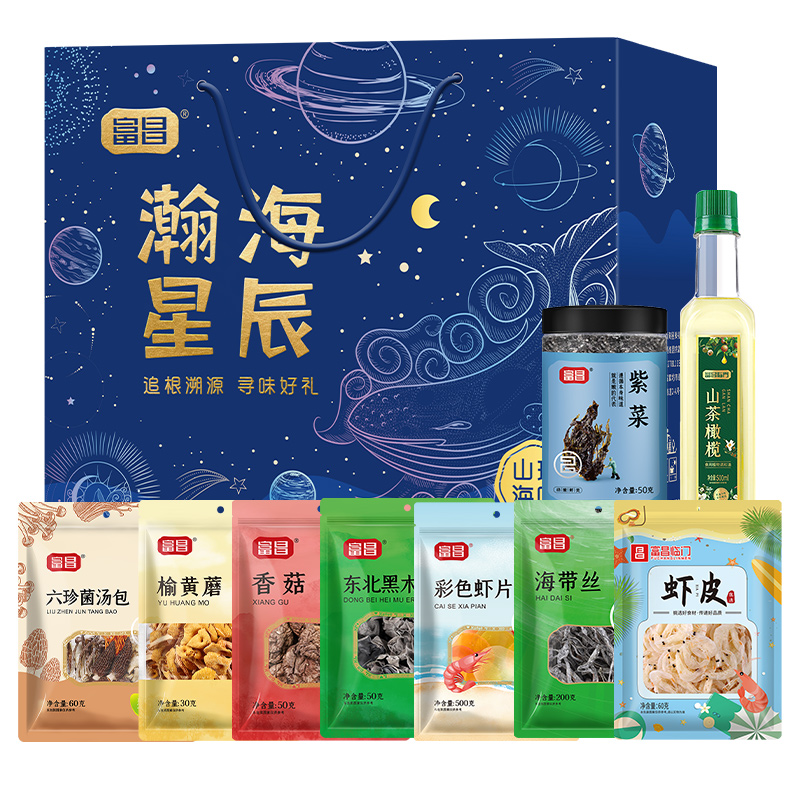 【富昌】临门山茶橄榄调和油500ml 【富昌】六珍菌汤包60g 【富昌】东北黑木耳50g 【富昌】香菇50g 【富昌】榆黄蘑30g 【富昌】临门虾皮60g 【富昌】碎紫菜50g 【富昌】海带丝200g 【富昌】临门虾片500g 名物精美礼盒*1