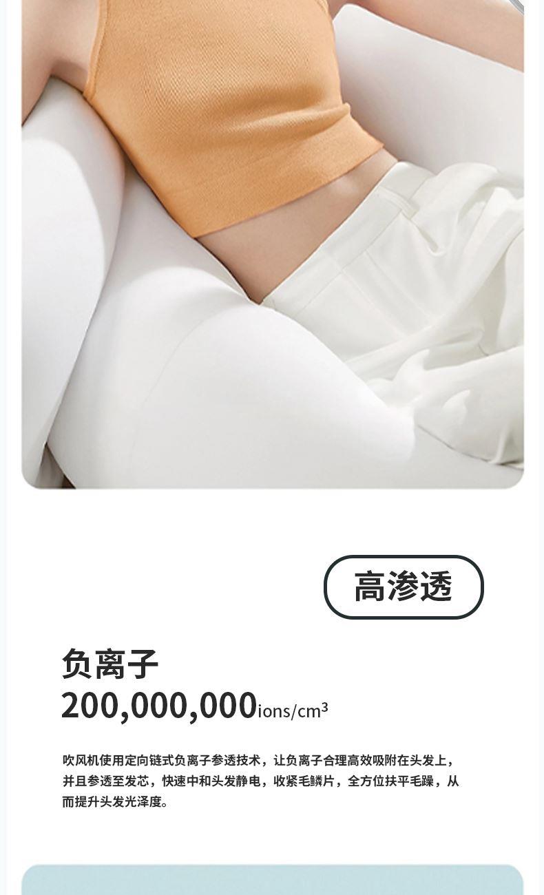 吹过更柔顺,秀发更出众,搭载负离子发射器,强劲气流下,释放负离子。不仅可以减少发丝间静电,帮助抚平毛糙,收紧头发的毛鳞片,让头发更加柔顺光泽;还可以快速温和干发,改善毛糙干枯发质。