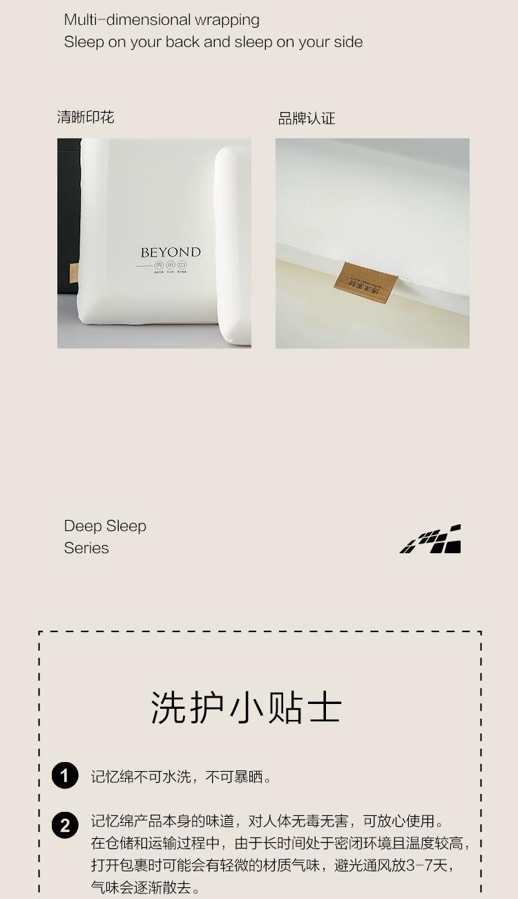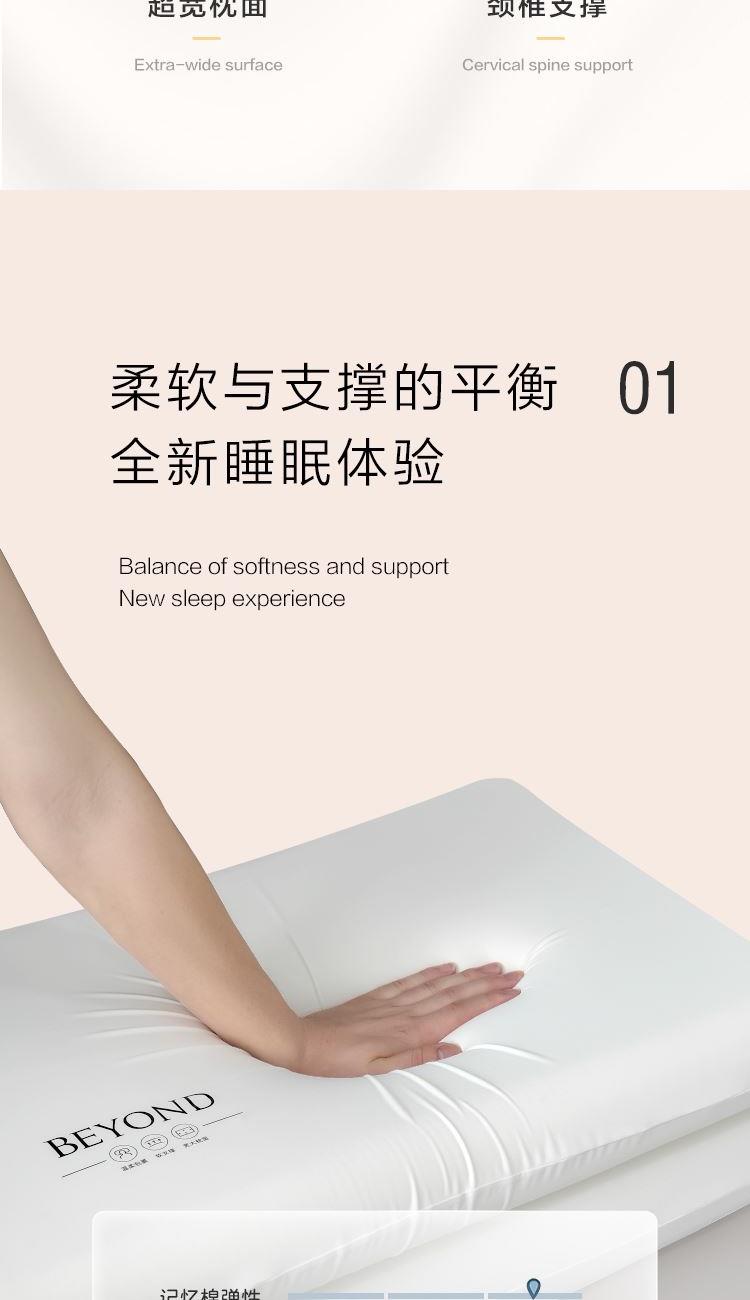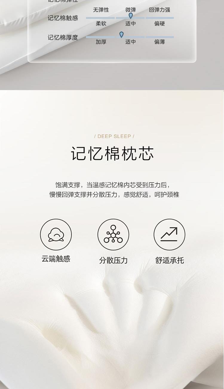 产品规格:70*42*8CM*1 面 料:枕套:93%聚酯纤维+7%氨纶 枕芯:%聚氨酯 1、超柔丝滑枕套,触感细腻柔滑,亲肤贴面,仿佛置身云端。 2、慢回弹记忆棉材质,躺下温和支撑起肩颈,平衡分散头颈压力,仰侧趴各种睡姿都能够舒适支撑。 3、超宽枕面,肆意翻滚。轻松翻身,动态支撑,包裹感十足。缓解一天工作疲劳,给您一夜深睡眠。