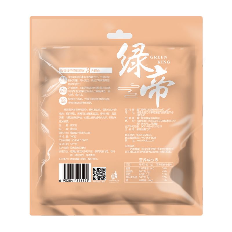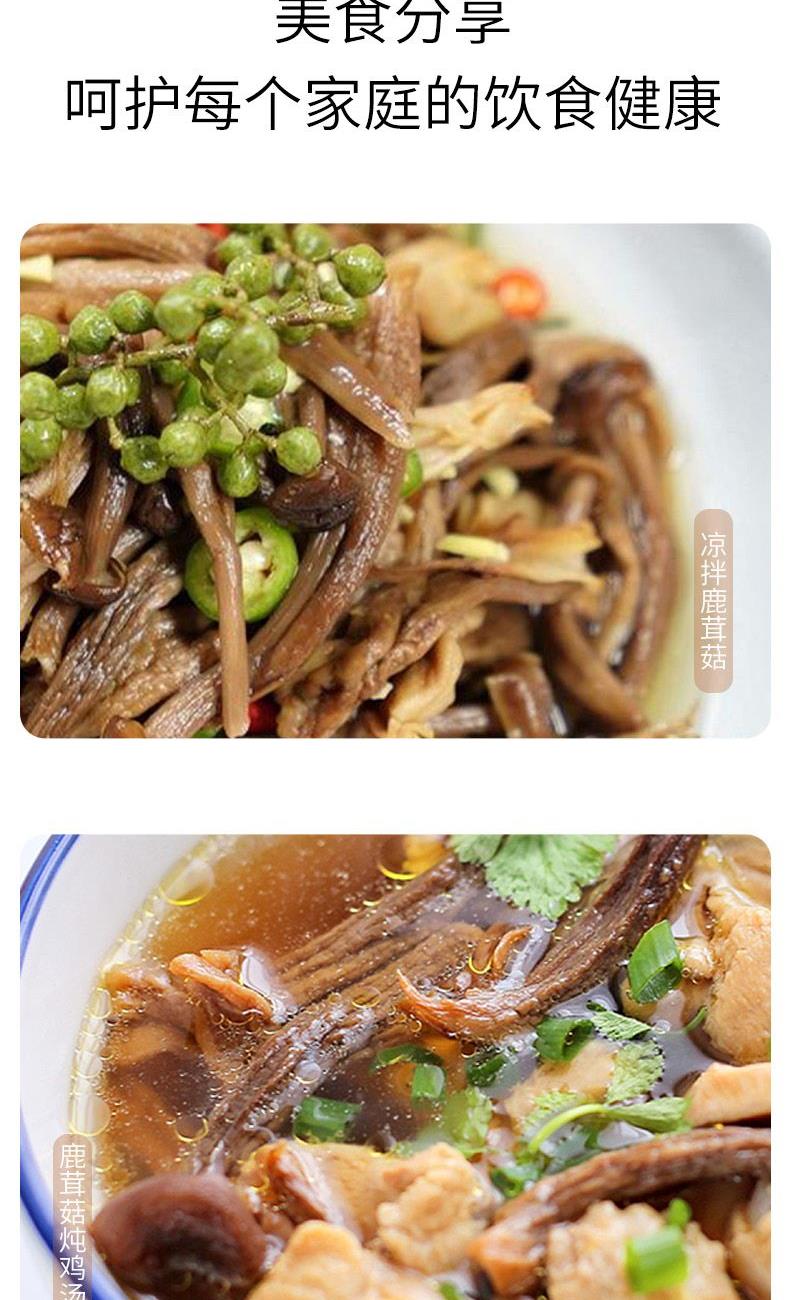 配料:鹿茸菇 原料产地:福建省宁德市古田县 净含量:100克 保质期:12个月 生产日期:见包装物打印处 食用方法:用清水浸泡洗净沥干后,煮菜煲汤均可,与鸡肉、猪肉同炒,味道更佳。鹿茸菇学名荷叶离褶伞,菇体灰白色,因形式幼小的鹿角,故而得名。烹调后口感脆松适度,香味浓郁,菇盖滑嫩,肉质饱满有弹性,如配上猪肉或鸡肉共炒,则食味更佳鲜美。