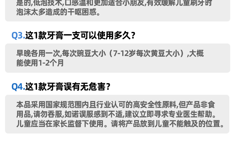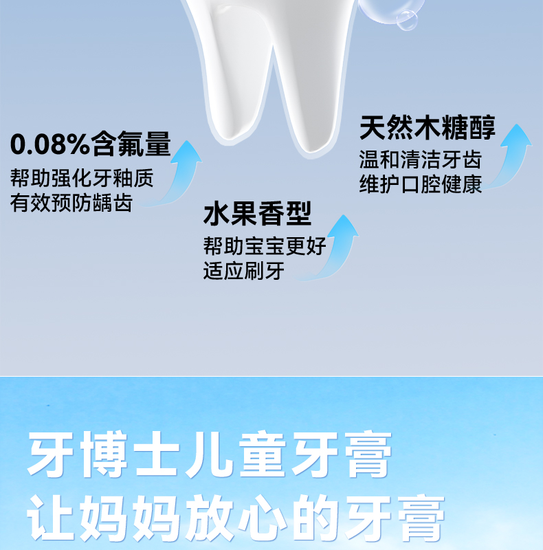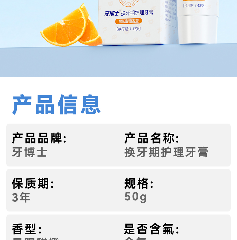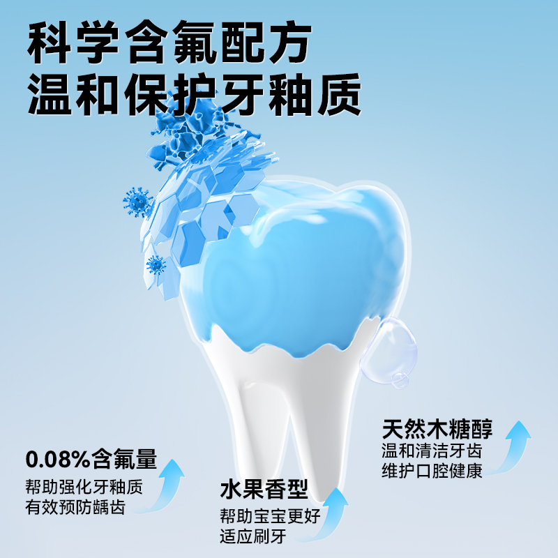 容量:50g 保质期:3年 1.0.08%含氟量,帮助强化牙釉质有效预防龋齿 2.水果香型,帮助宝宝更好适应刷牙 3.温和低泡,减少吞咽,妈妈安心 4.天然木糖醇,温和清洁牙齿 维护口腔健康