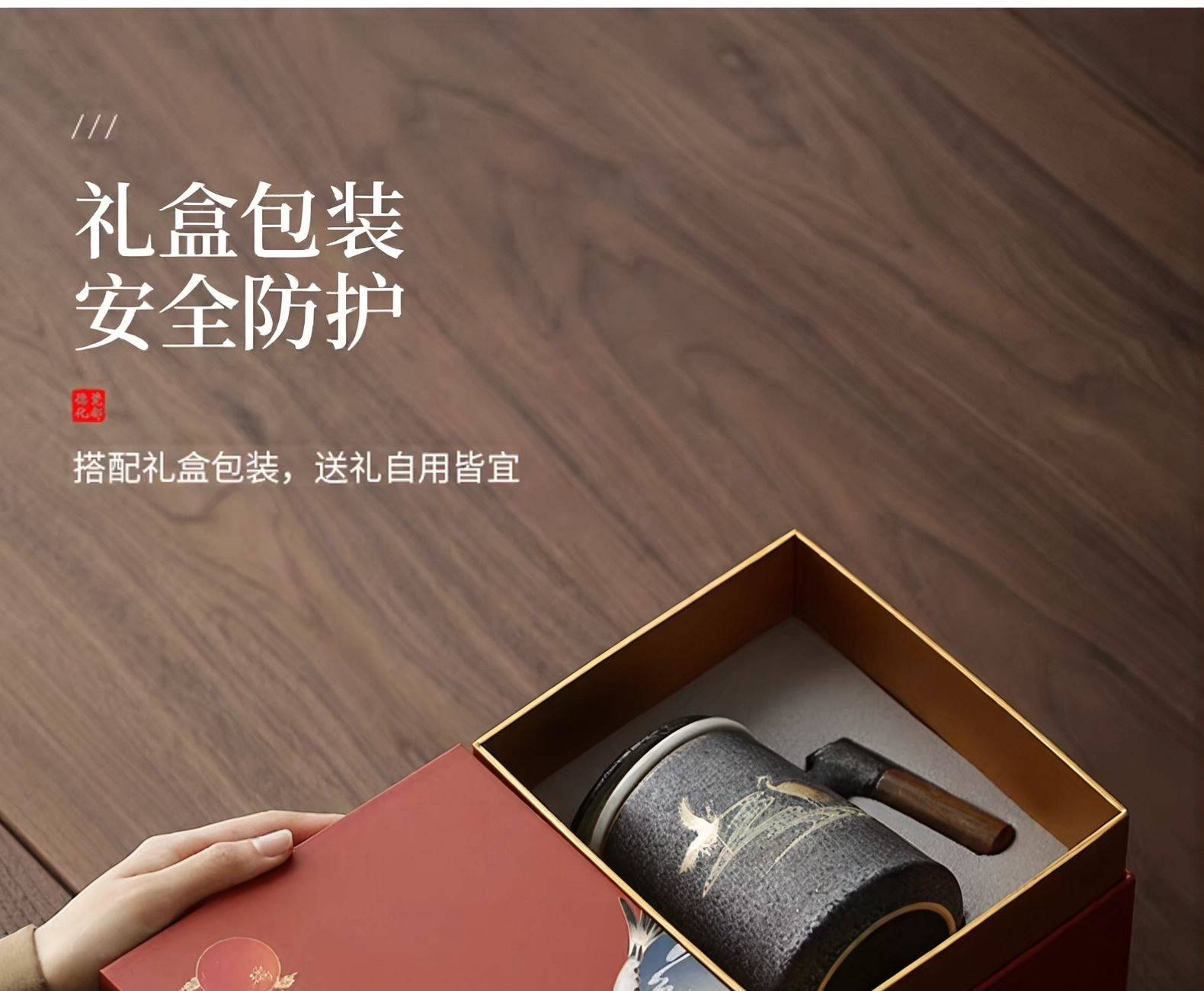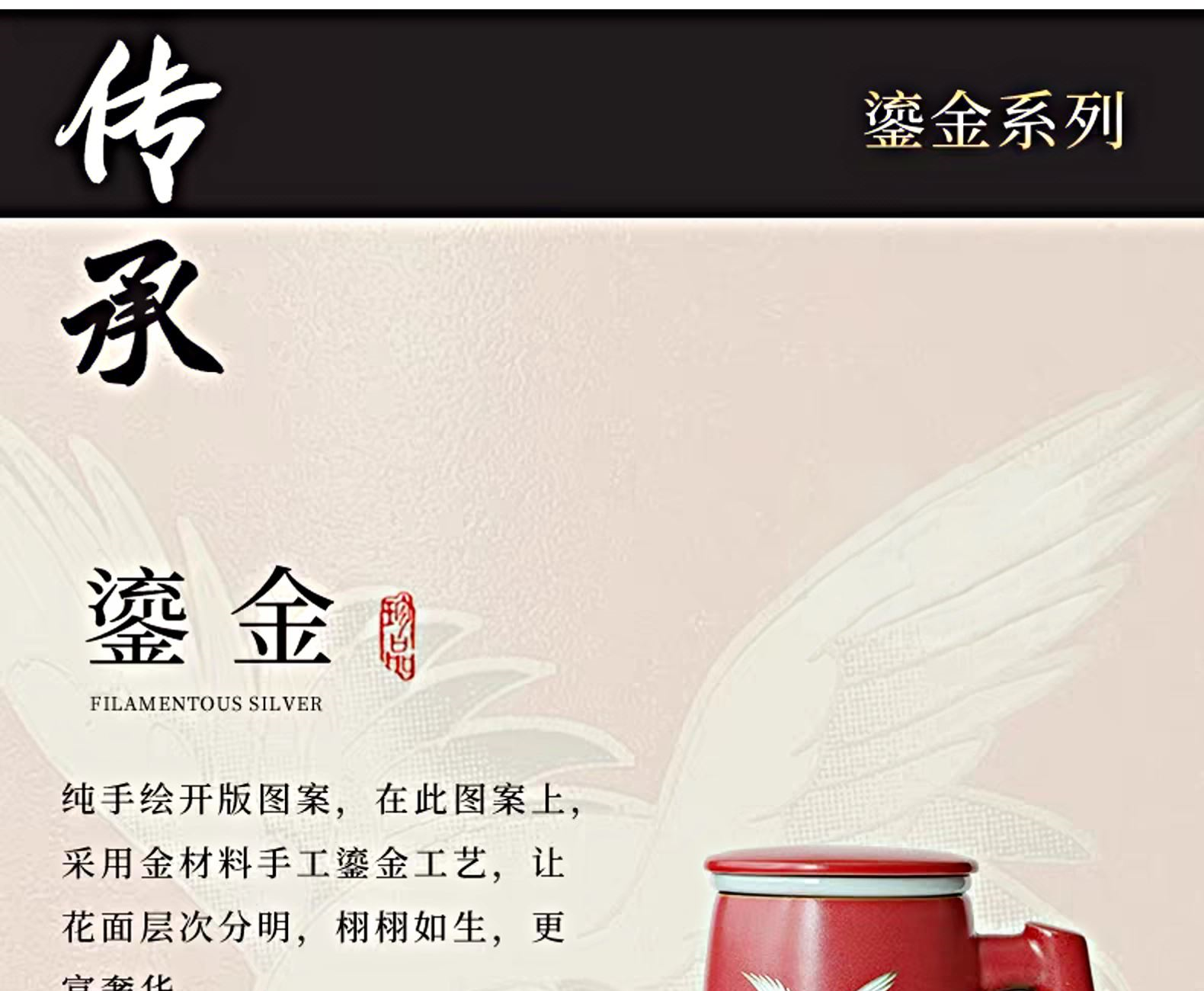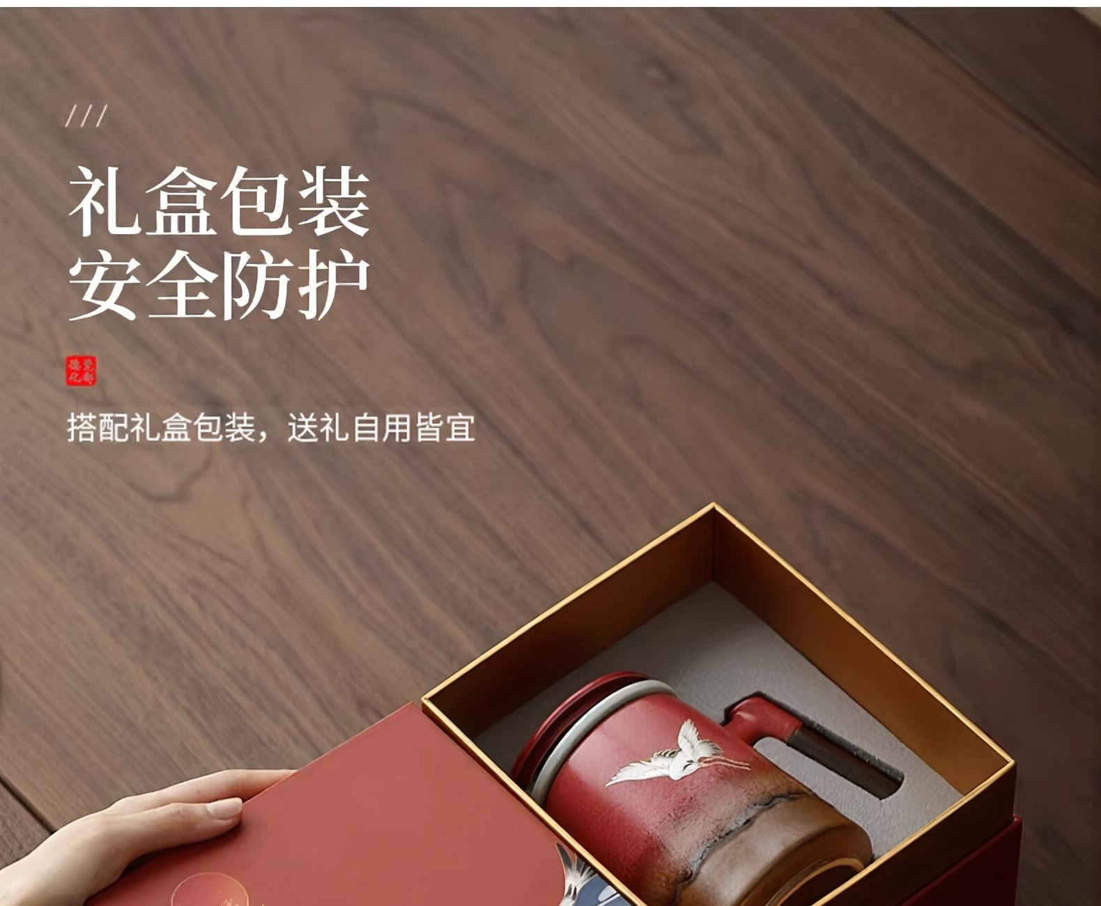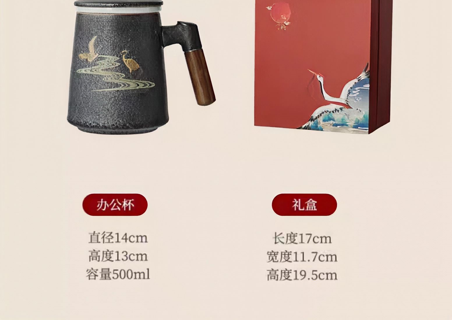 配置:陶瓷杯*1,礼盒*1. 颜色:宫墙红/银斑釉 尺寸:14*13cm,容量500ml。 礼盒:17*11.7*19.5cm。