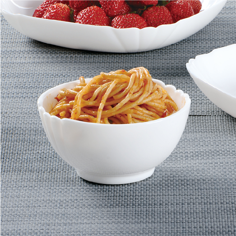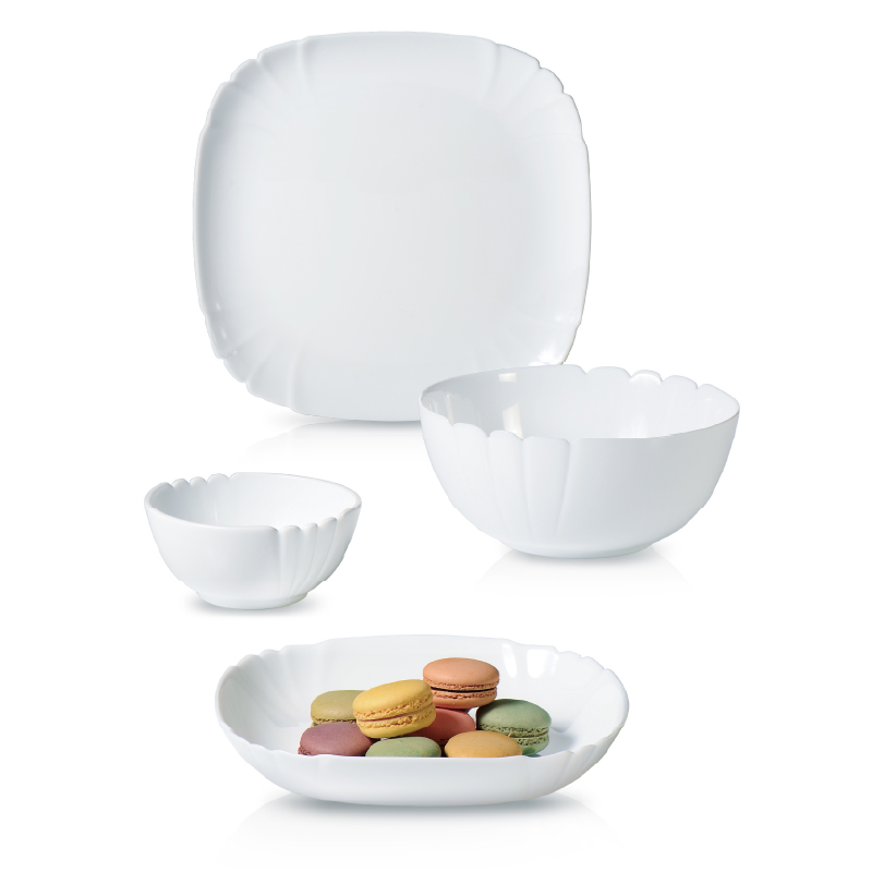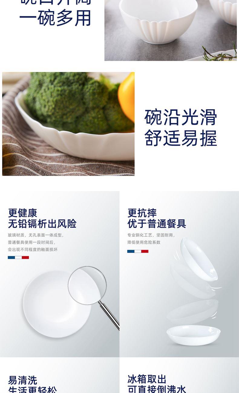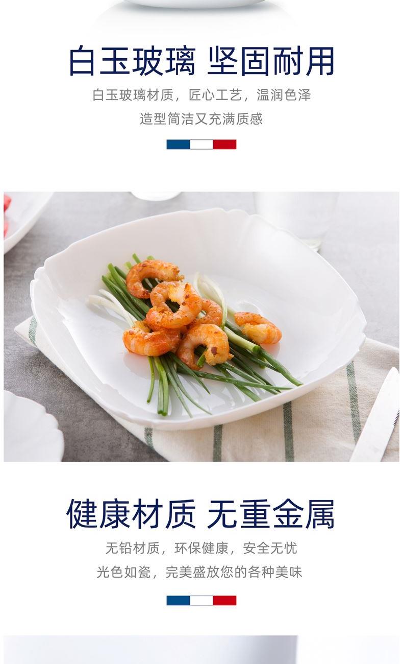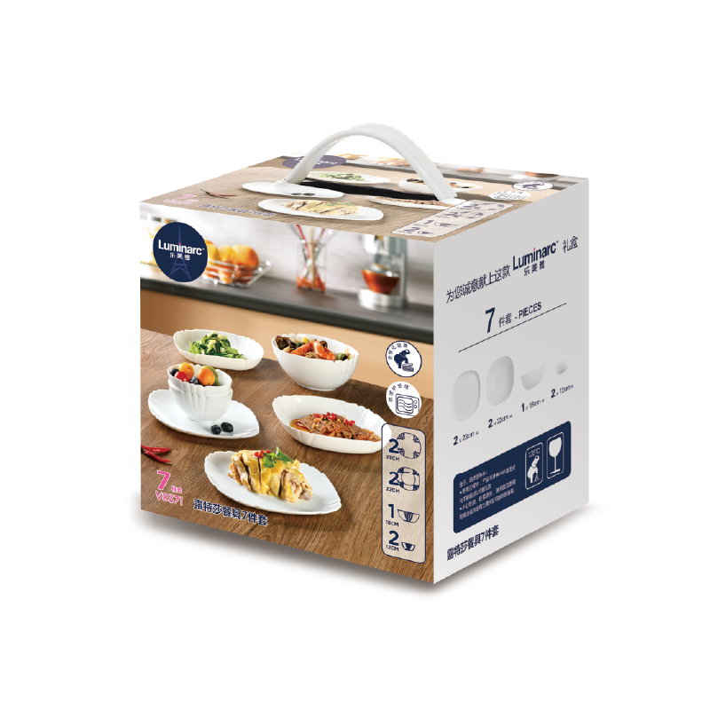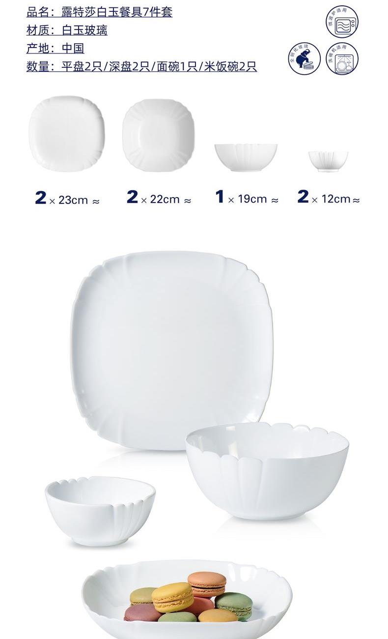 套件组成:饭碗12cm*2+深盘22cm*2+平盘23cm*2+汤碗18cm*1 材质:白玉玻璃 工艺:钢化工艺 包装:彩盒 外箱尺寸:454*379*259mm 毛重:2.7kg/11kg 特点: 1.无铅玻璃材质,环保、健康 2.全钢化工艺,抗震耐刮擦,耐温差120°C,微波炉、洗碗机、皆适用 3.无孔表面,易冲无残留,减少细菌产生 4.法式设计, 质薄轻巧,方便收纳,节省空间