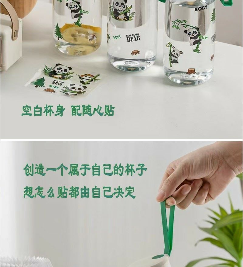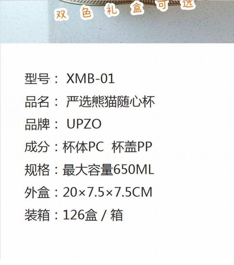 型号: XMB-01 透明杯*1+熊猫贴纸*1 成分:杯体PC 杯盖PP 规格:容量650ML 外盒:20×7.5×7.5CM DIY创意杯 空白杯身设计+熊猫贴纸 打造专属自己的个性杯 空白杯身的挑选也更便于产品定制客户广告