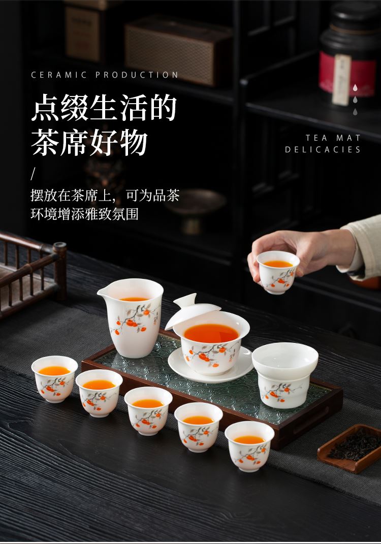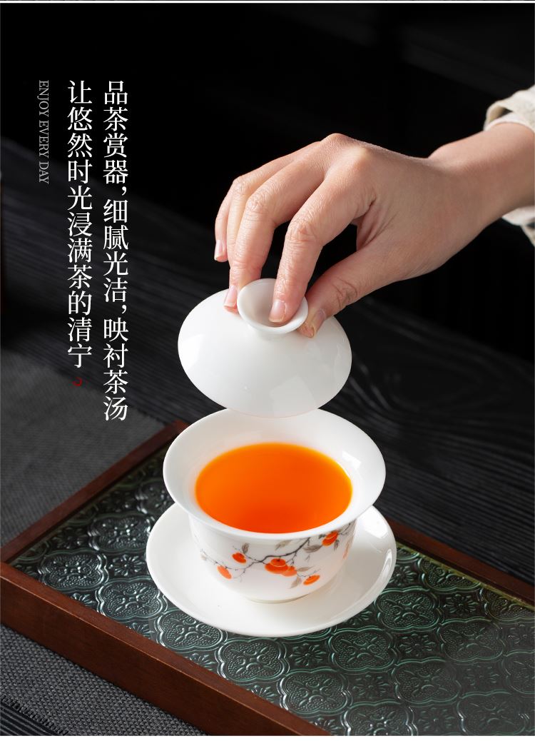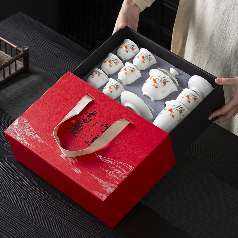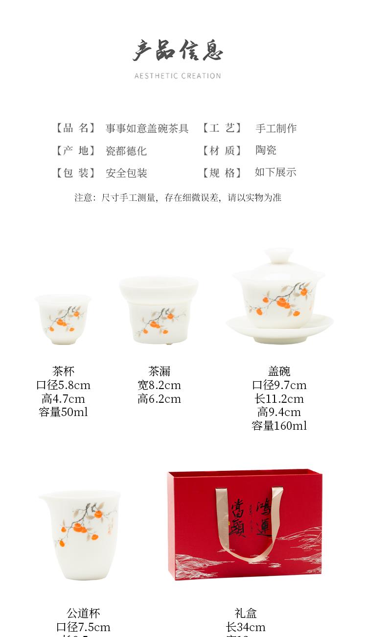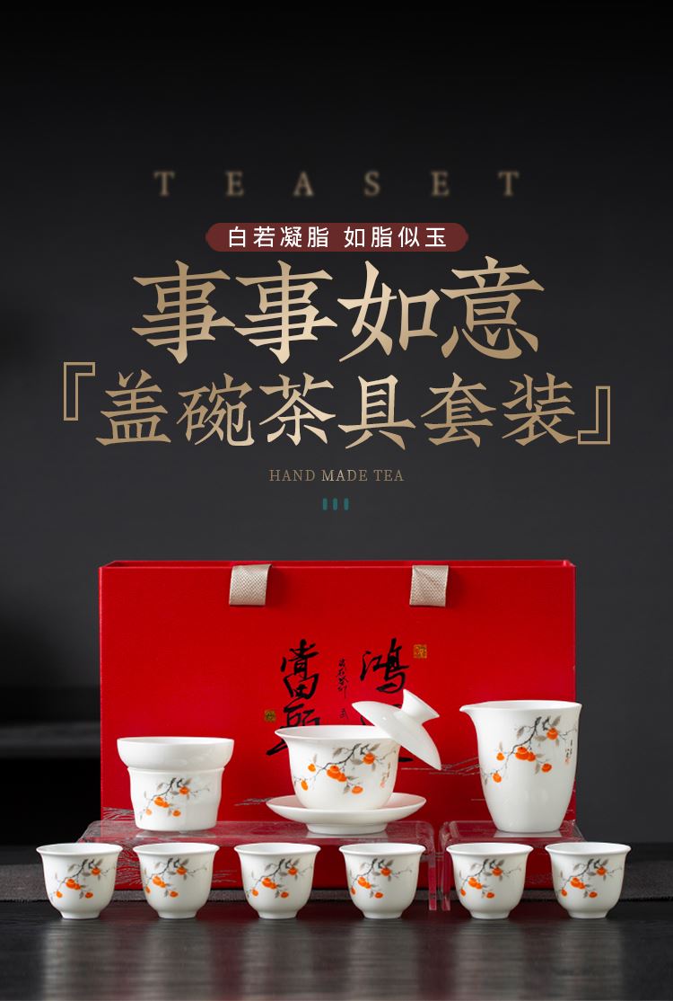 配置:品茗杯*6 盖碗*1 茶海*1 茶漏*1 礼盒*1 材质:羊脂玉瓷 礼盒尺寸:34cm*23cm*12.5cm 产品尺寸:盖碗175ml 品茗杯75ml 茶海225ml
