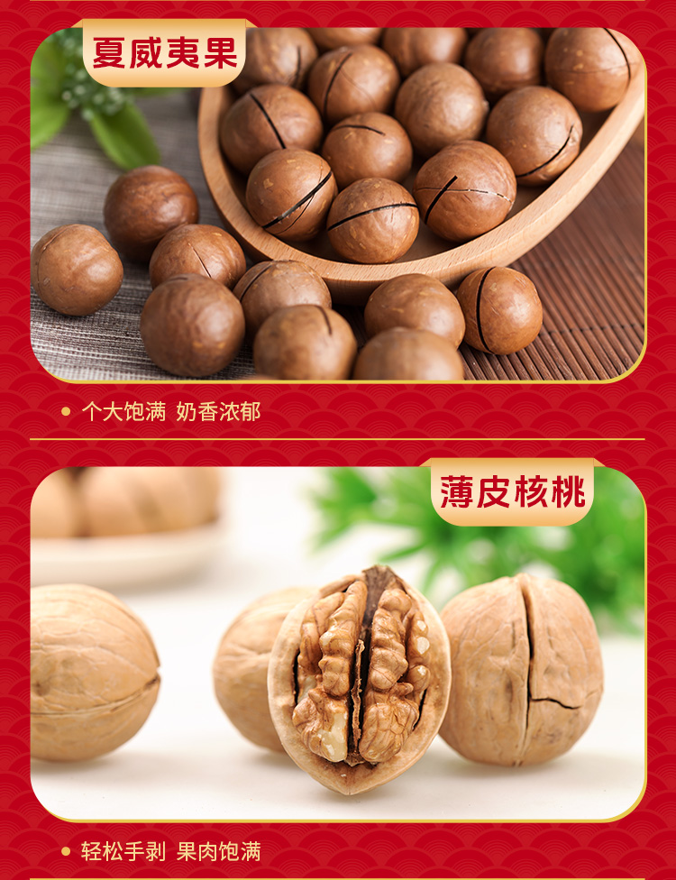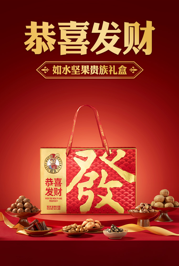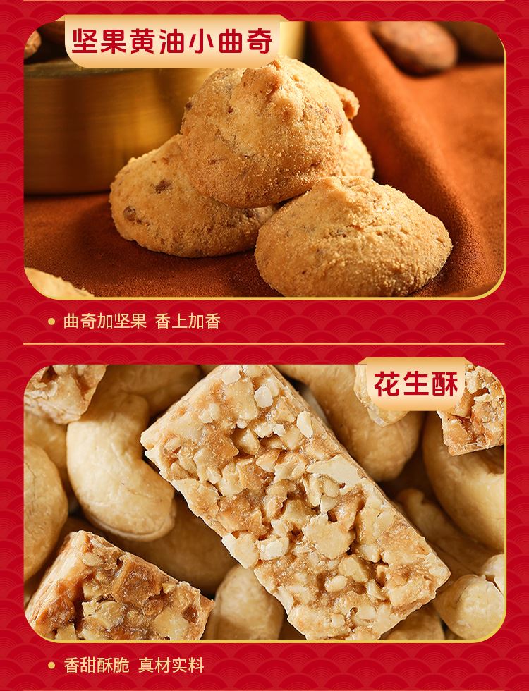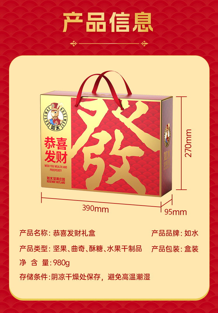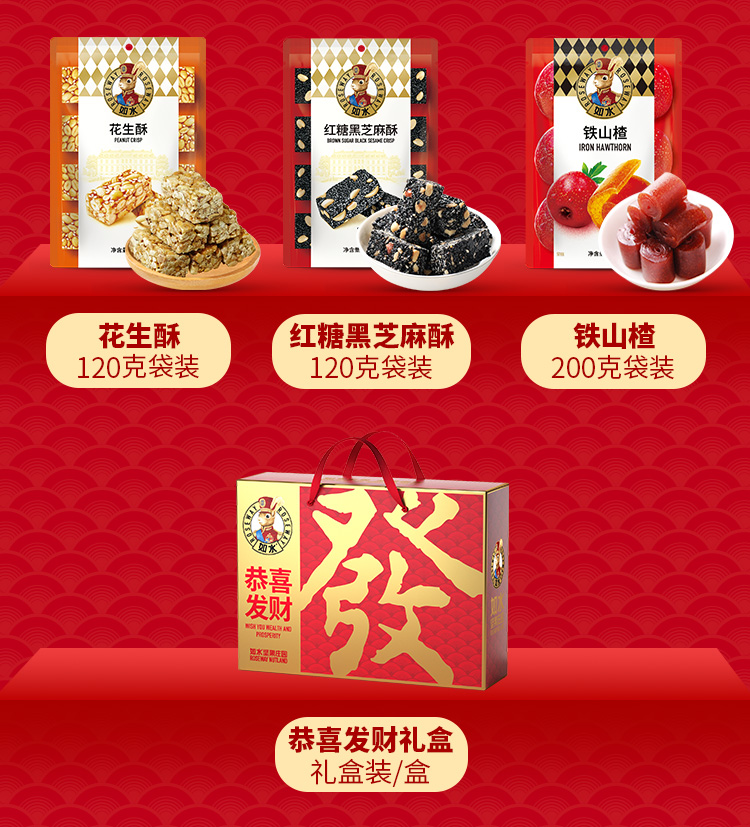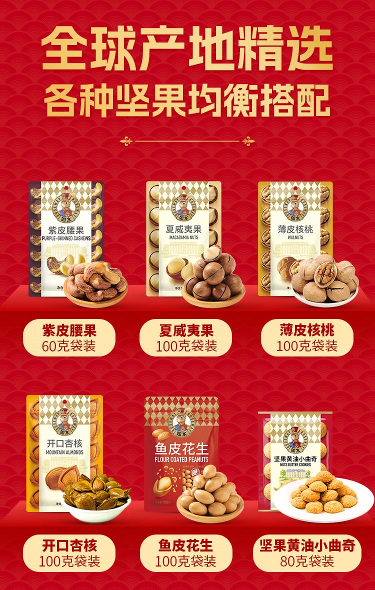 如水恭喜发财礼盒 净含量:980g 如水紫皮腰果60g 如水夏威夷果100g 如水薄皮核桃100g 如水开口杏核100g 如水鱼皮花生100g 如水坚果黄油小曲奇80g 如水花生酥120g 如水红糖黑芝麻酥120g 如水铁山楂200g