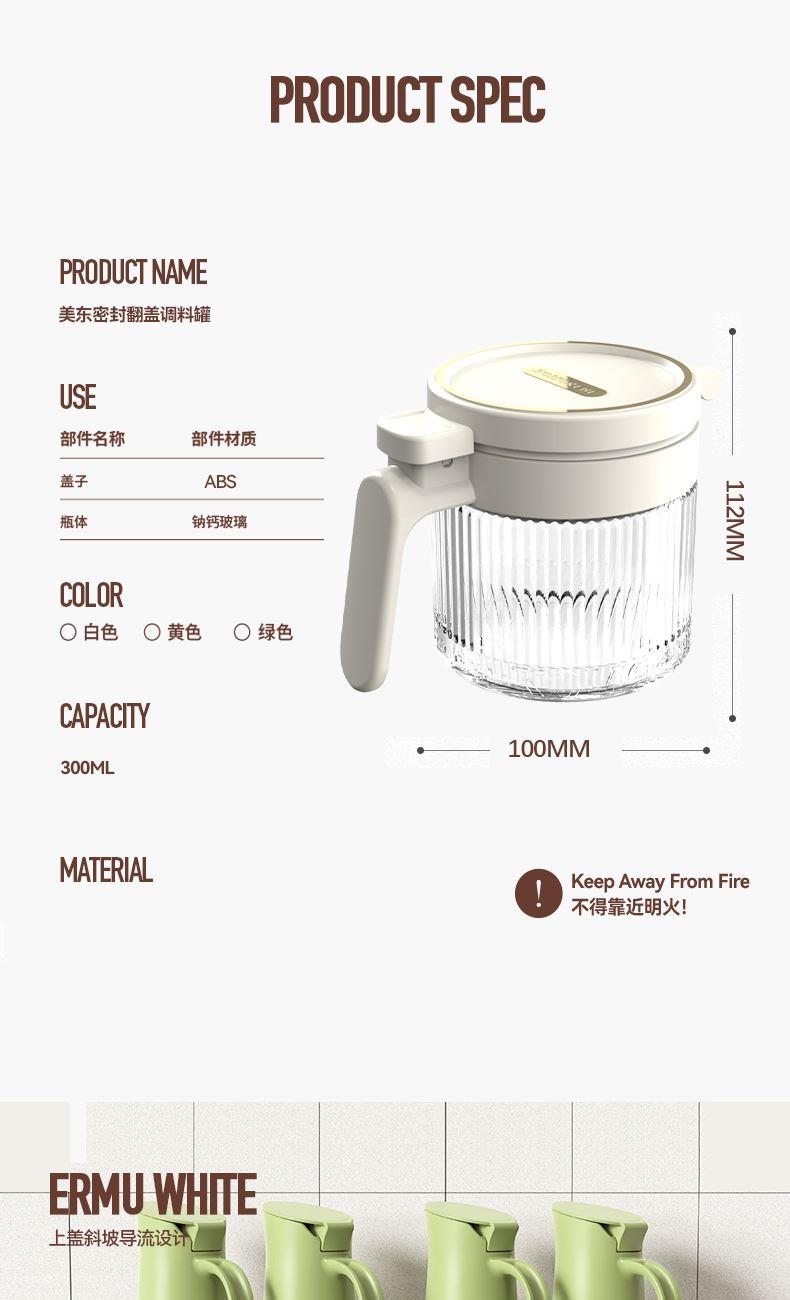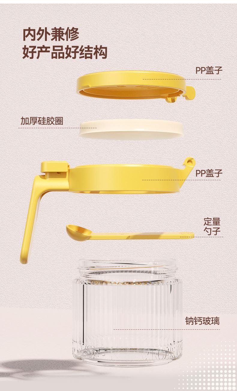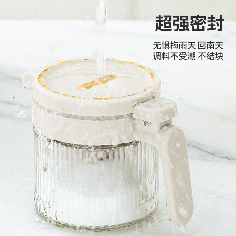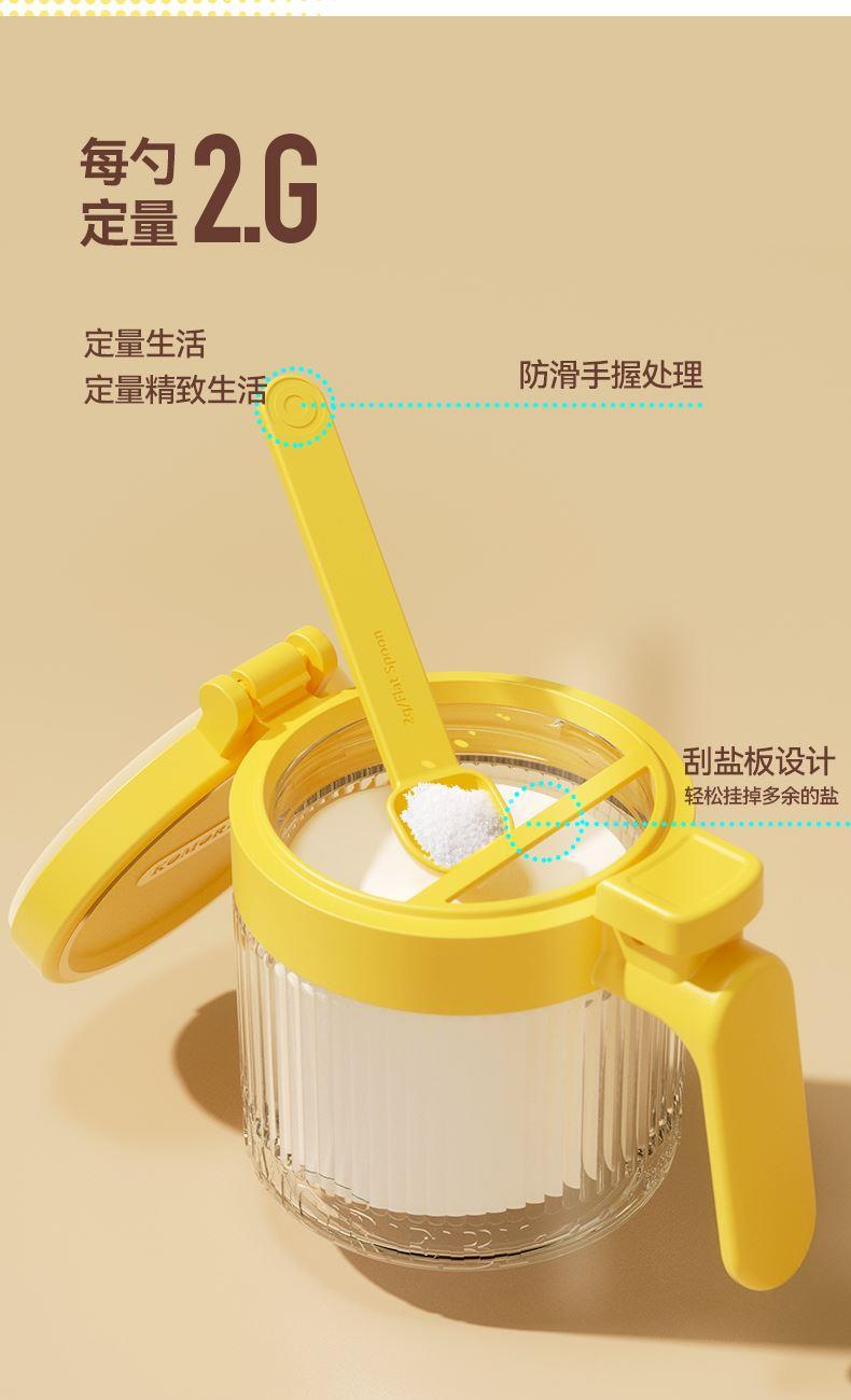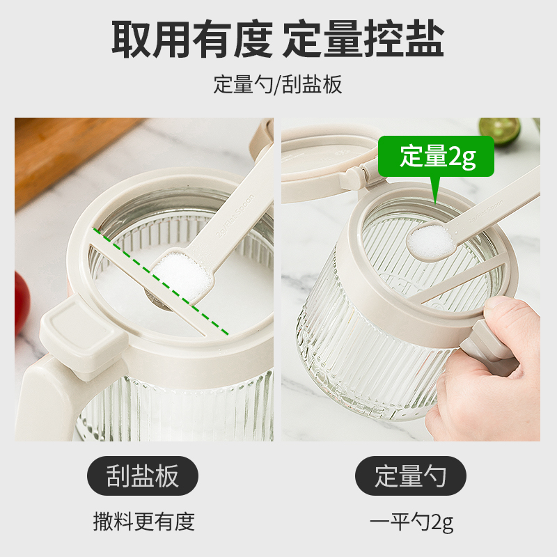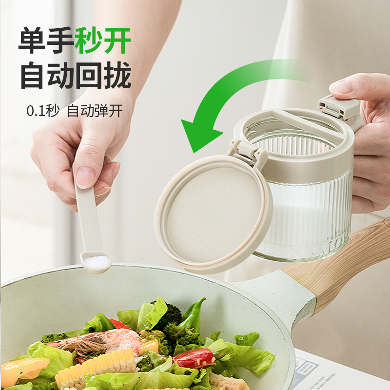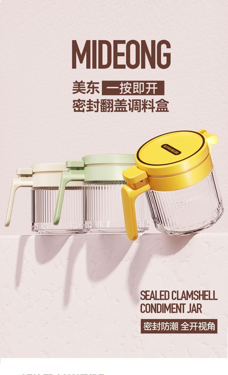 美东 一按即开密封翻盖调料盒 内外兼修好产品好结构 PP盖子+加厚硅胶圈+定量勺子+钠钙玻璃 每日2g,定量精致生活,防滑手握处理 超强密封无惧回南天,调料不受潮不结块强密封 加厚硅胶圈。防护瓶内的调料