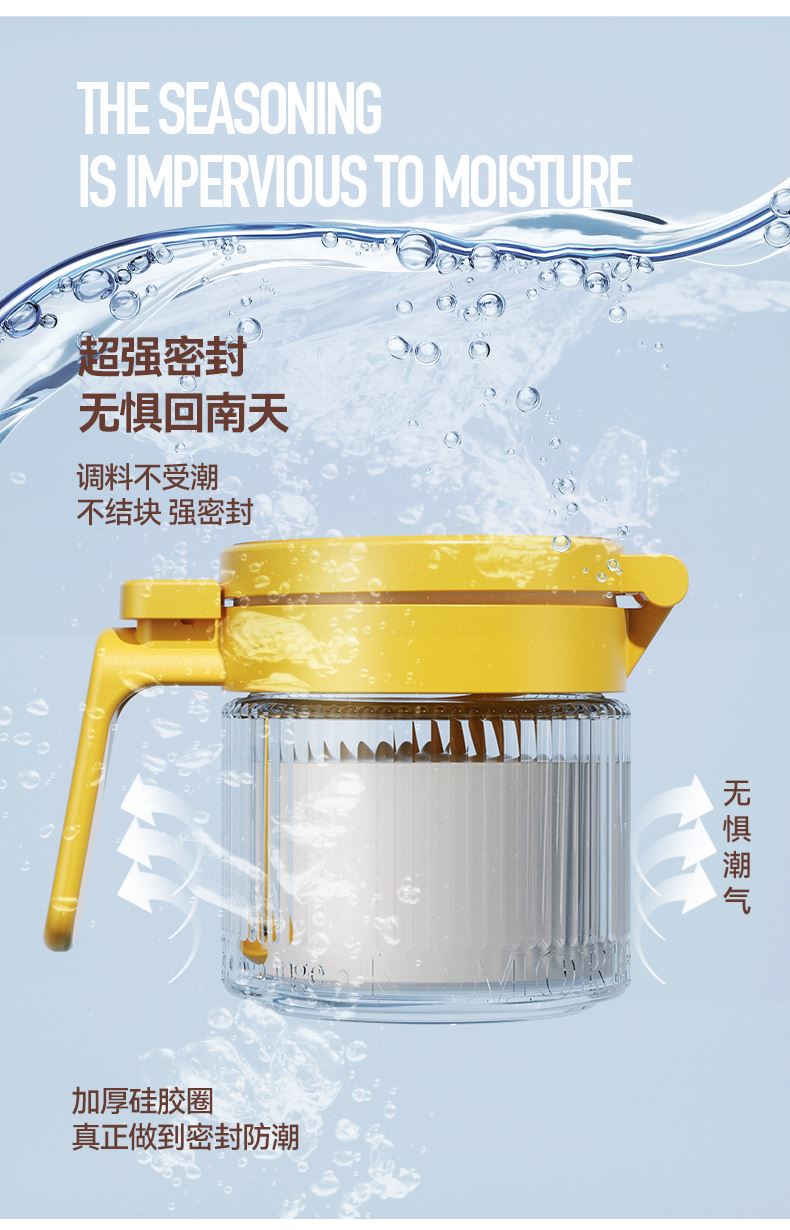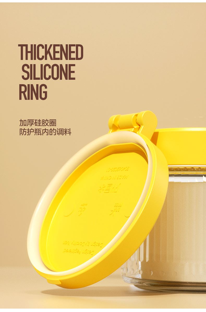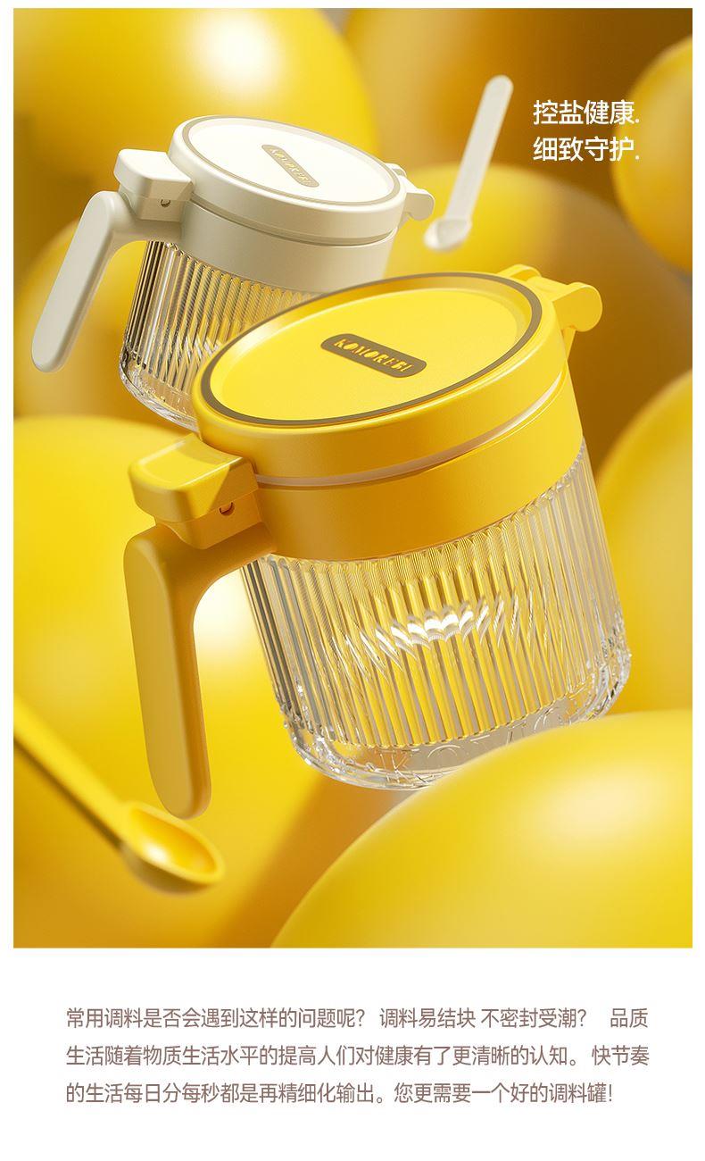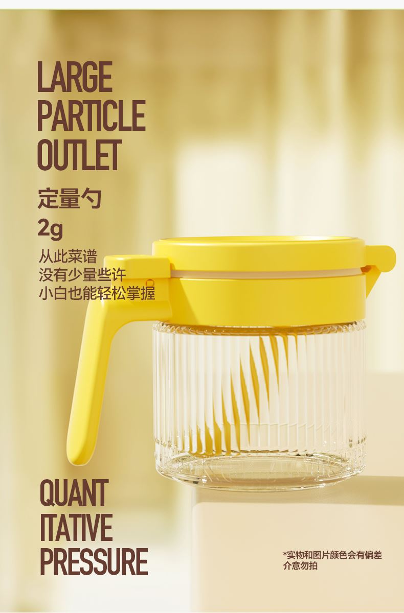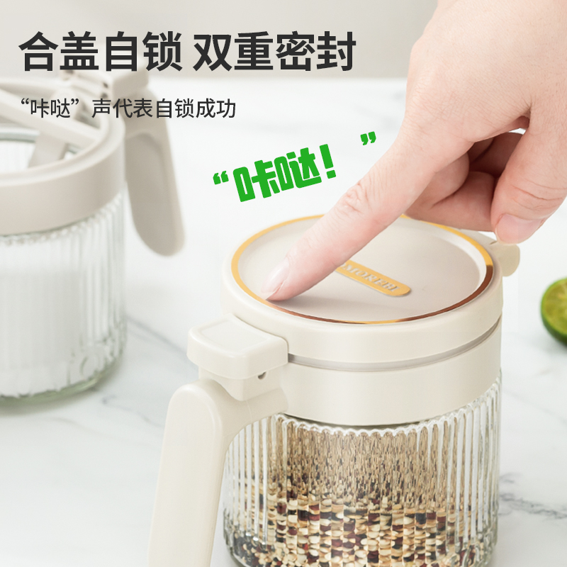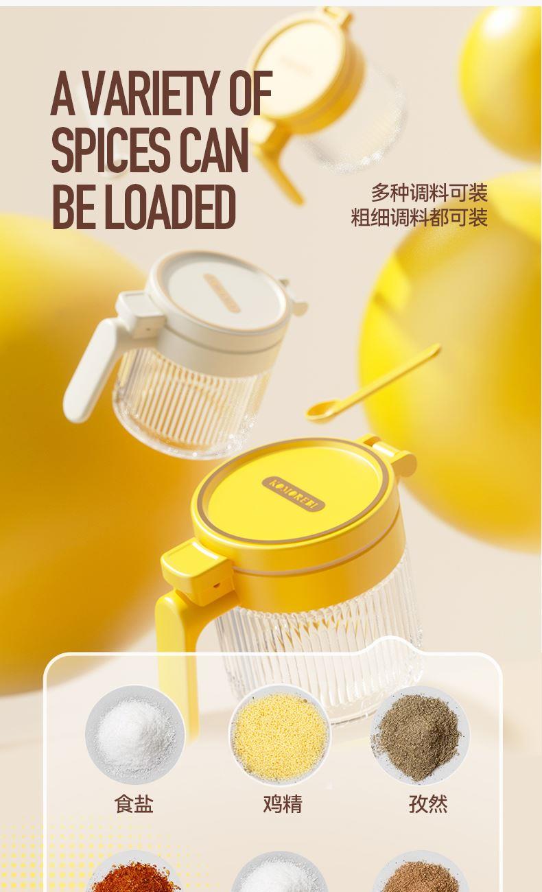 美东 一按即开密封翻盖调料盒 内外兼修好产品好结构 PP盖子+加厚硅胶圈+定量勺子+钠钙玻璃 每日2g,定量精致生活,防滑手握处理 超强密封无惧回南天,调料不受潮不结块强密封 加厚硅胶圈。防护瓶内的调料