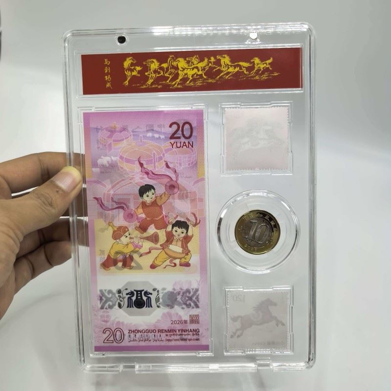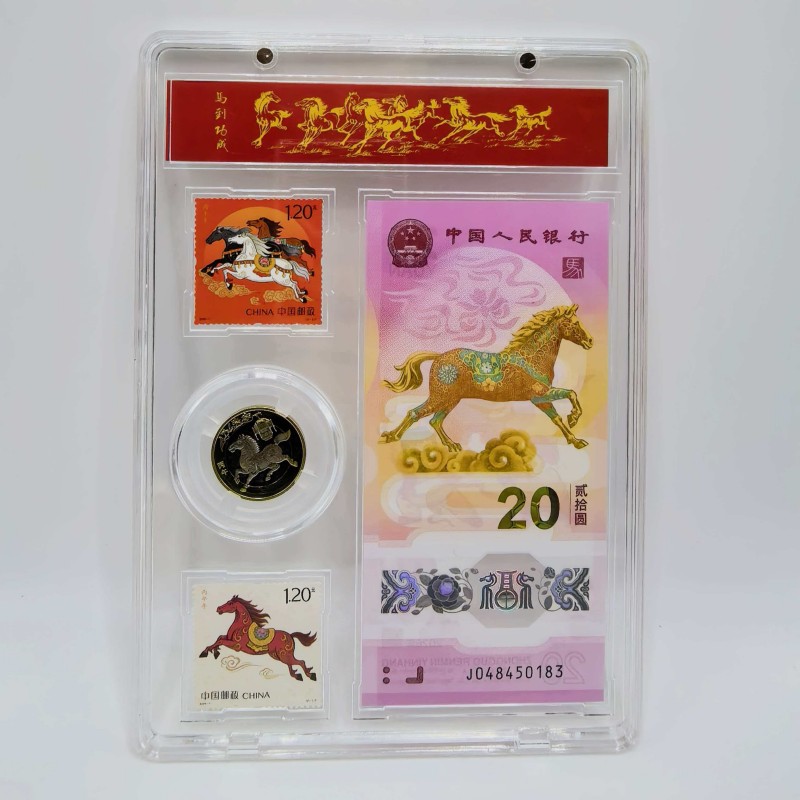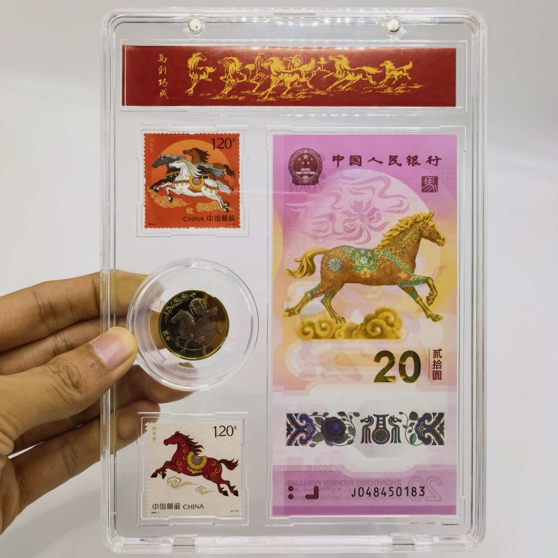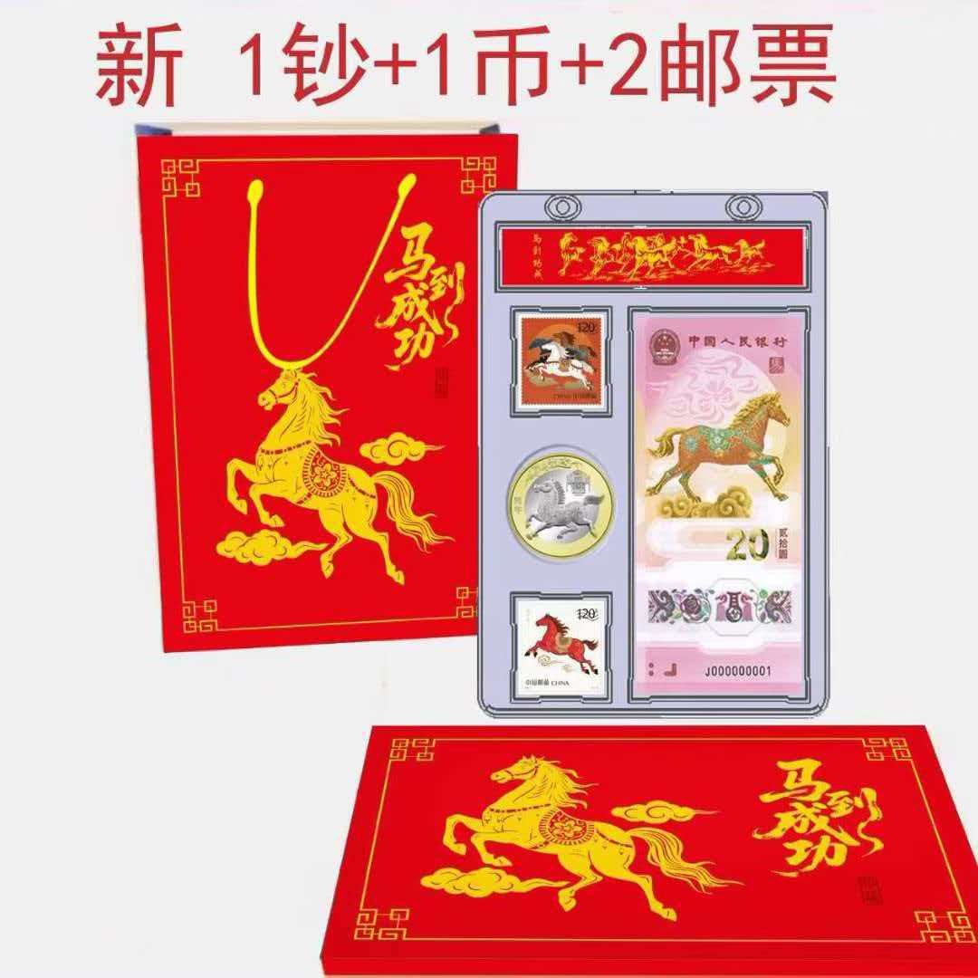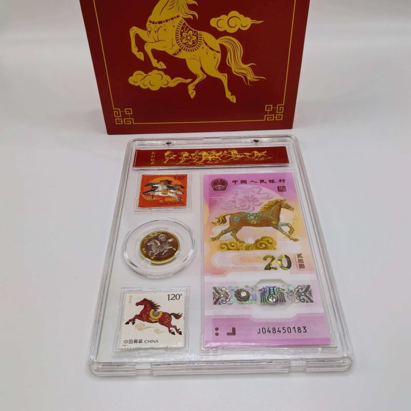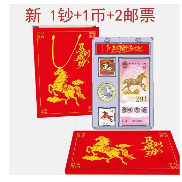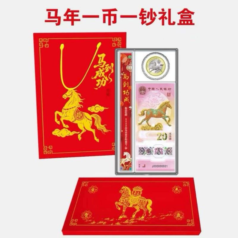产品配置:1钞1币2邮票 产品面值:纸钞20元,硬币10元 产品包装:亚克力+手提袋 辞旧迎新,骏马踏春来!中国人民银行官方发行, 重磅上市,限量珍藏,祥瑞献礼! • 正红礼盒缀以鎏金奔马,寓意“马到成功” • 传统纹样衬喜庆祥云,传递财源广进之愿 • 透明封装呈现藏品细节,自藏赠礼皆显心意
