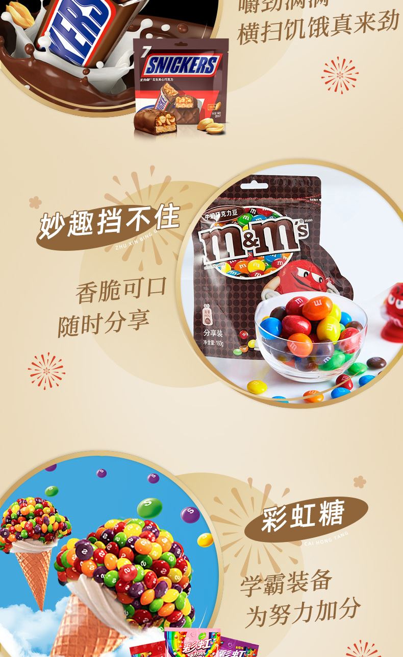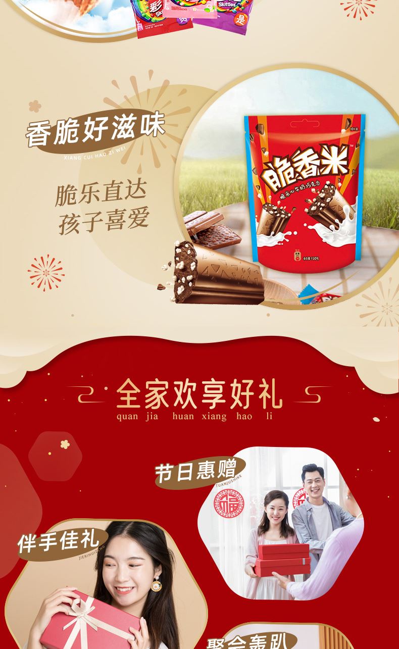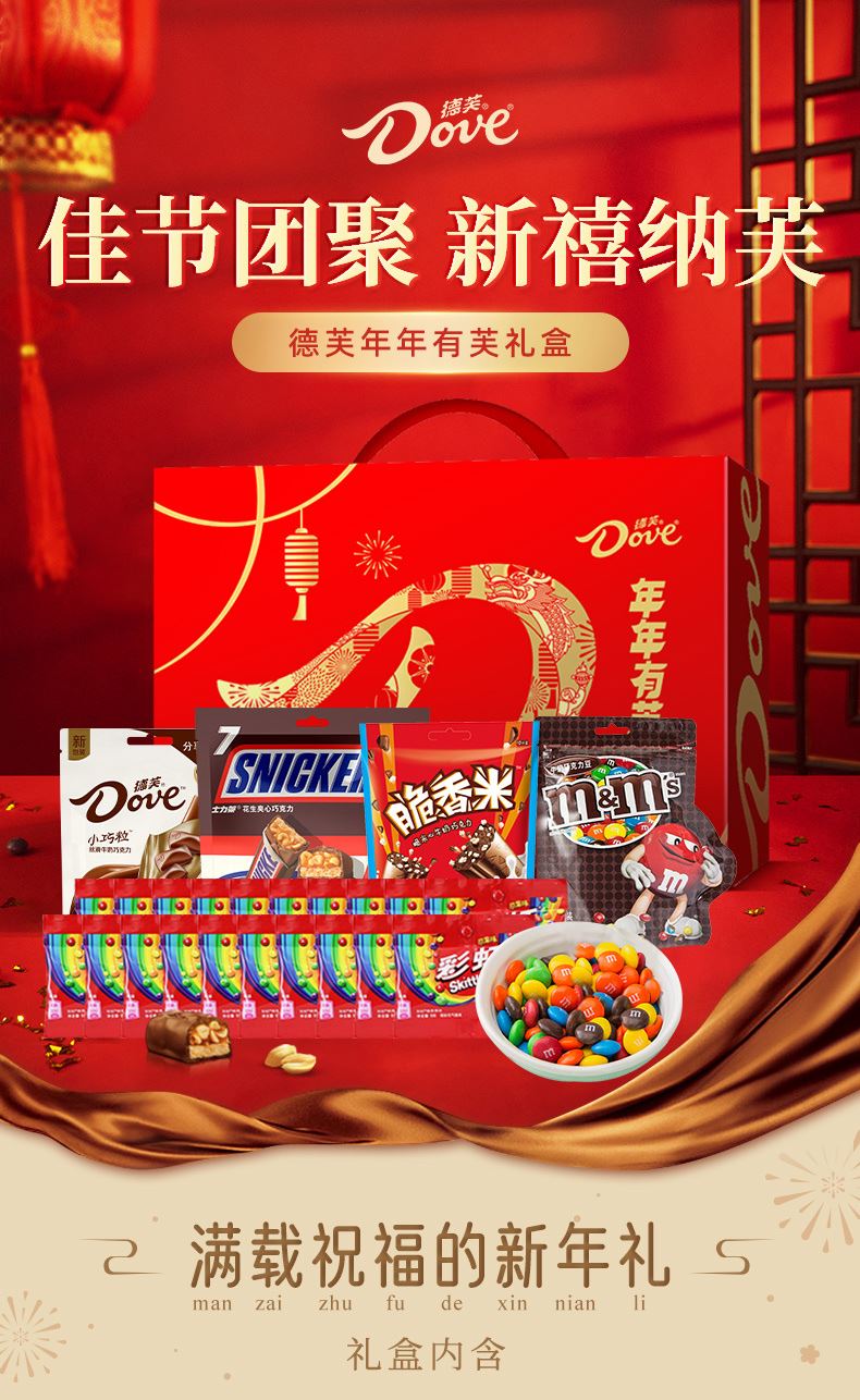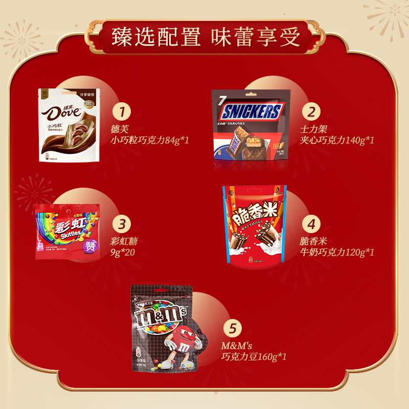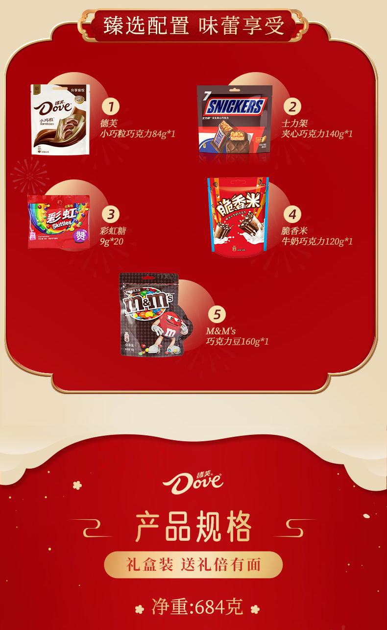 德芙 年年有芙 礼盒684克 配置: 德芙小巧粒巧克力84g*1 士力架巧克力140g*1 脆香米巧克力120g*1 M&M’巧克力160g*1 彩虹糖9g*20
