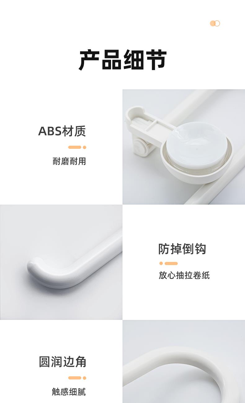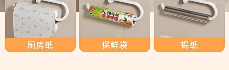 产品尺寸:306*80*171mm 材质:ABS 类别:普通置物架 适用场景:厨房 图案:白色 产品描述:厨房好伴侣,免打孔壁挂卷纸架,一秒安装,免钉免胶,防水防油,旋转倒挂。