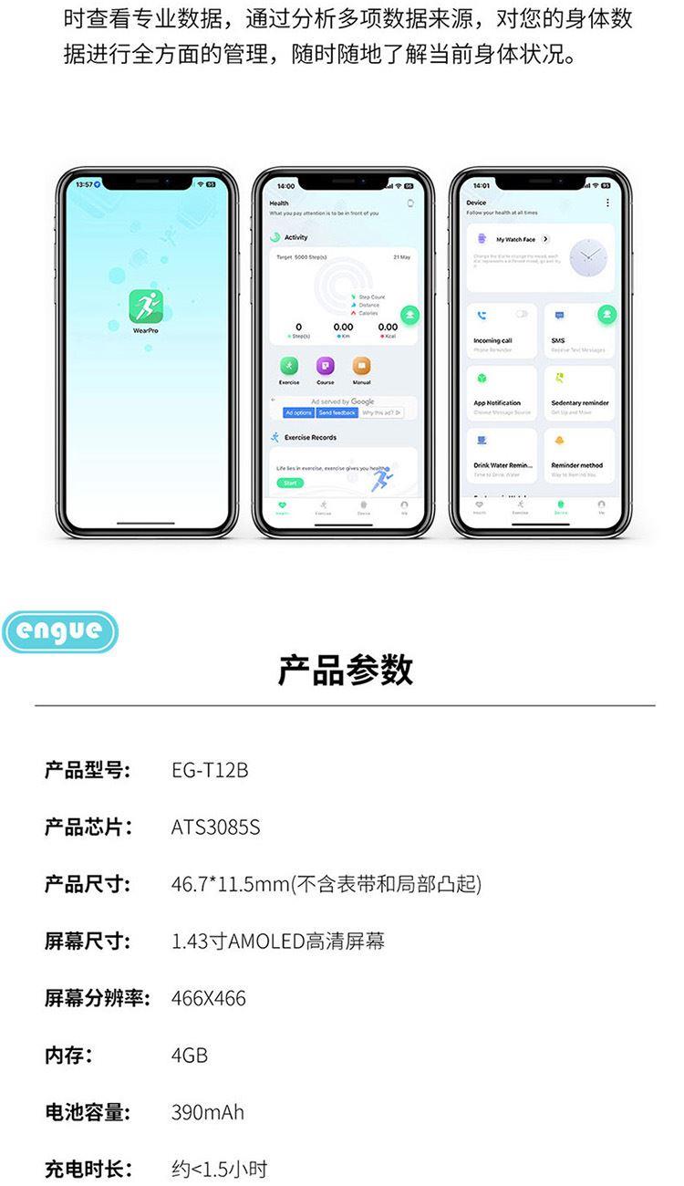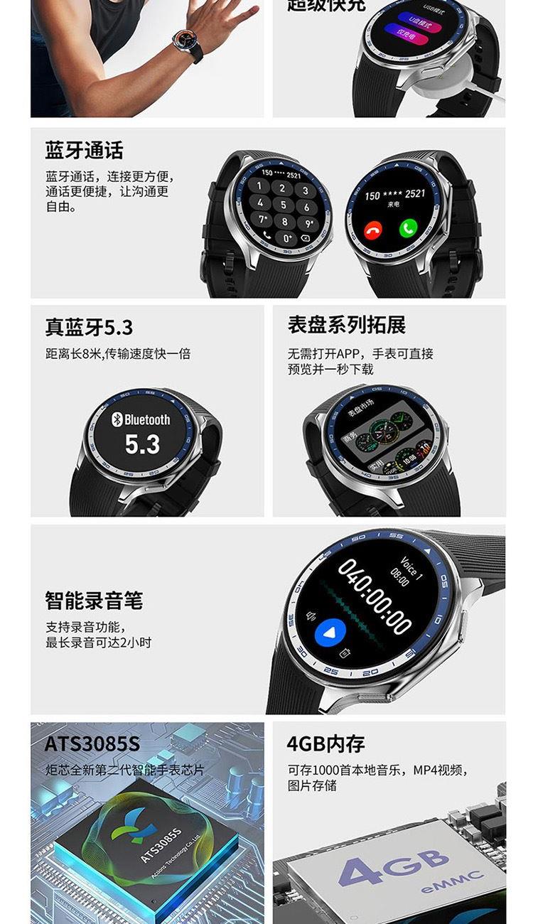 1,显示屏:1.43inch;分辨率:466*466;IP67级防水