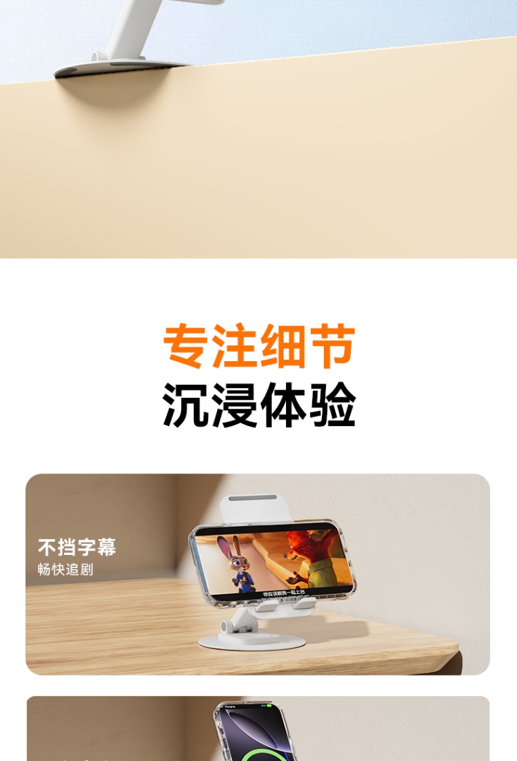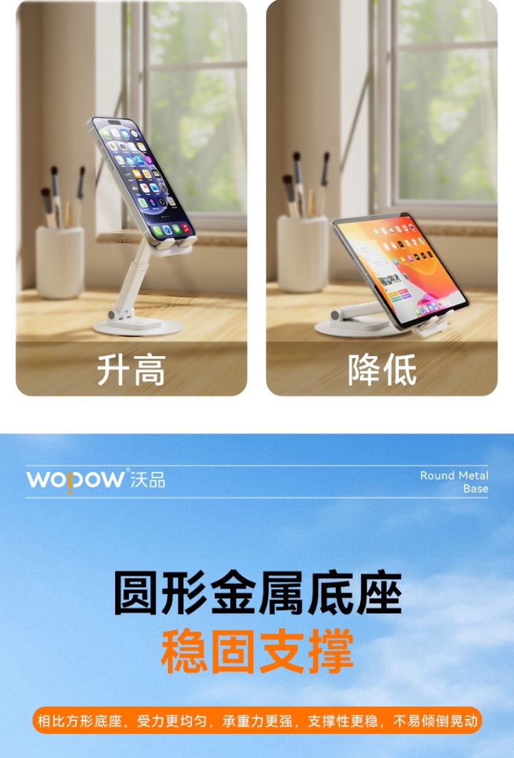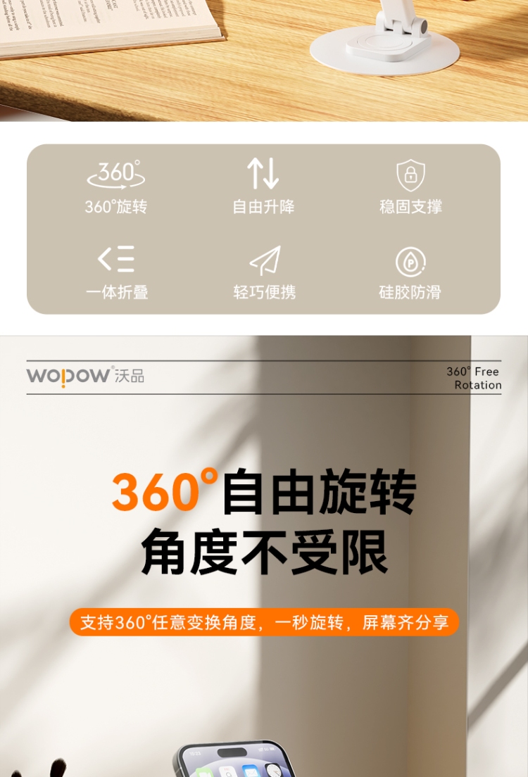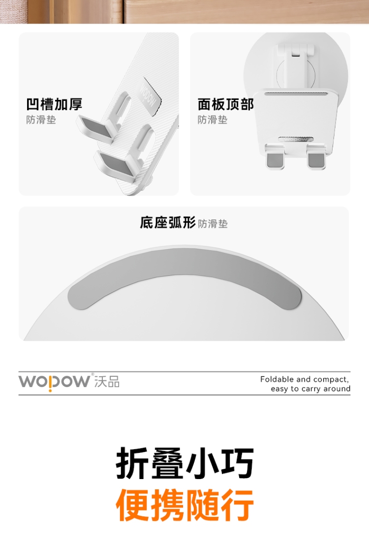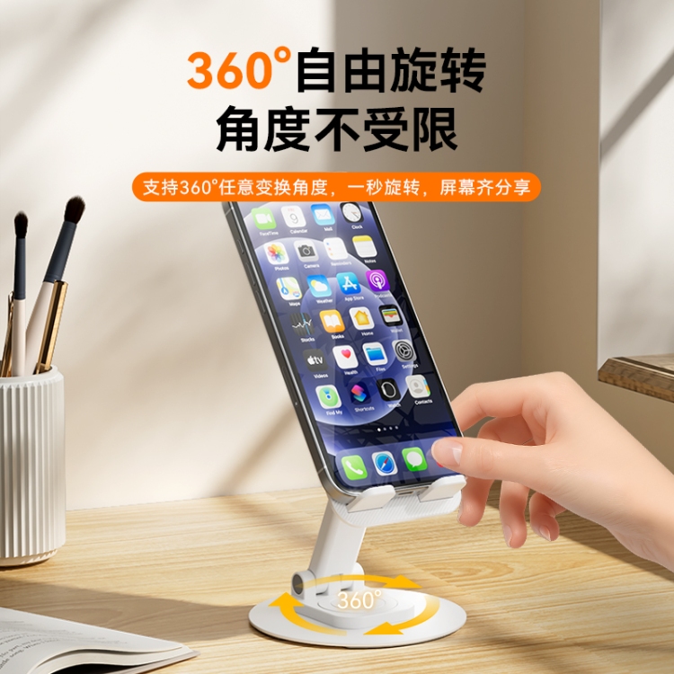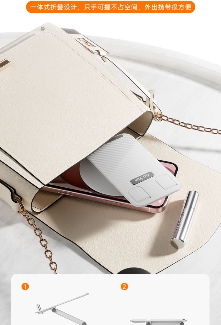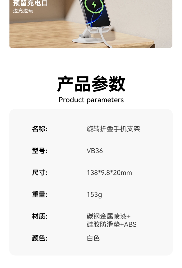 产品尺寸:138*9.8*20mm 包装尺寸: 102*140*27.5mm产品重量:153g 颜色:白色 材质:碳钢金属喷漆+硅胶防滑垫 使用场景:把支架平稳放置在桌面上,调节好舒适角度就可以放置手机, 不使用的时候可以折叠起来,随身携带方便实用 360度任意变换角度 可折叠方便携带 自由升降,支撑力大 金属底座,硅胶垫防滑垫