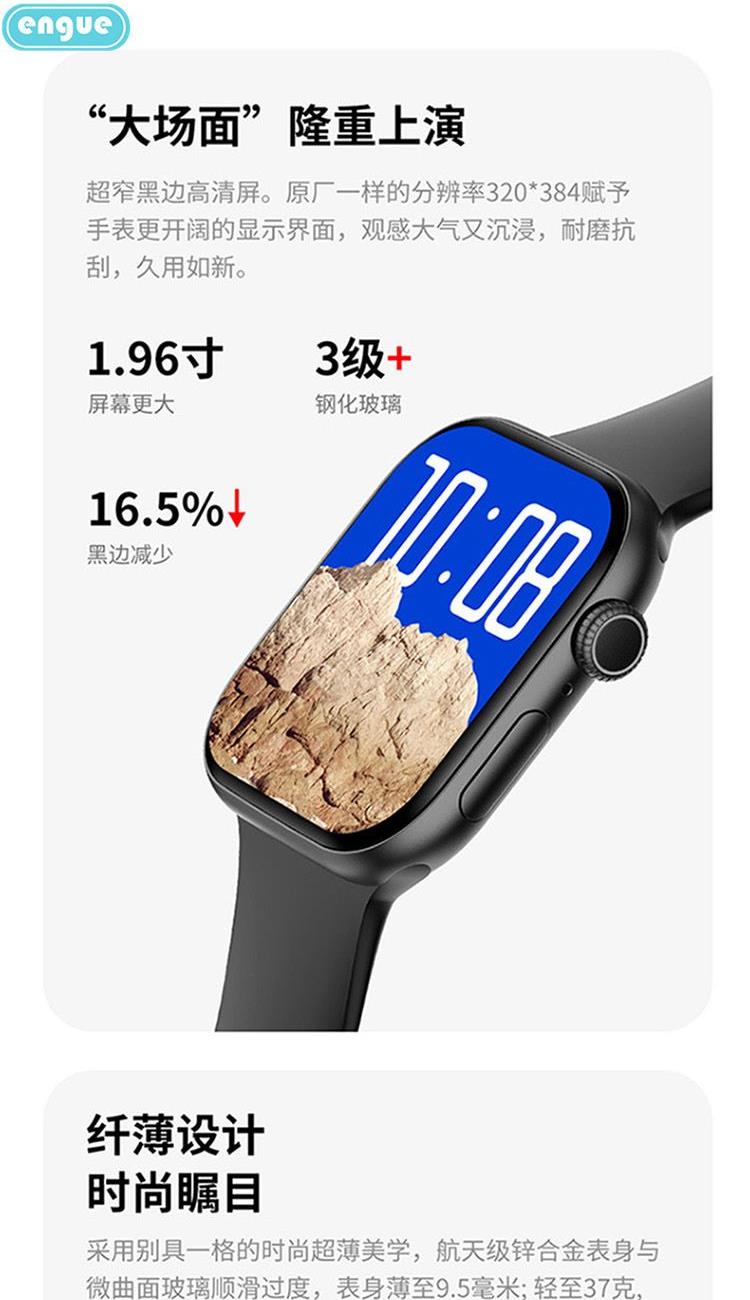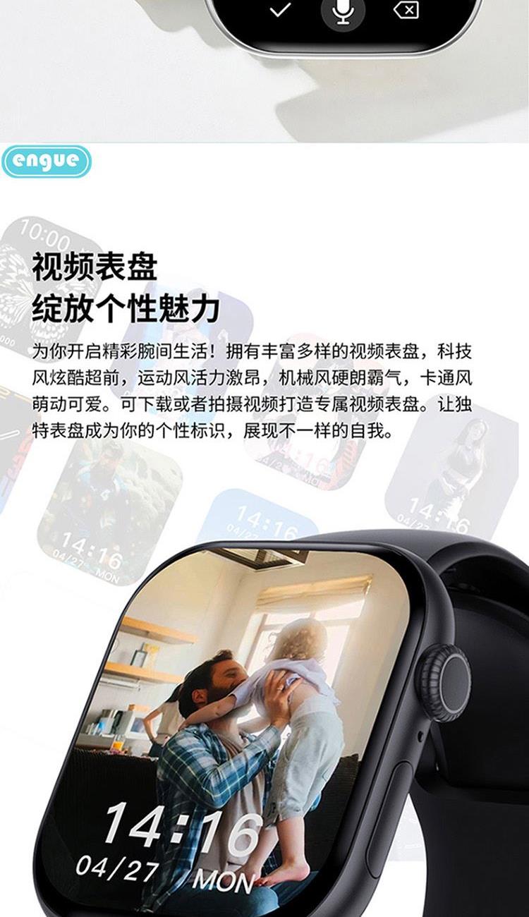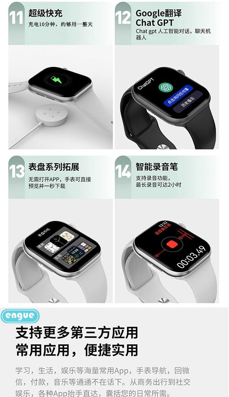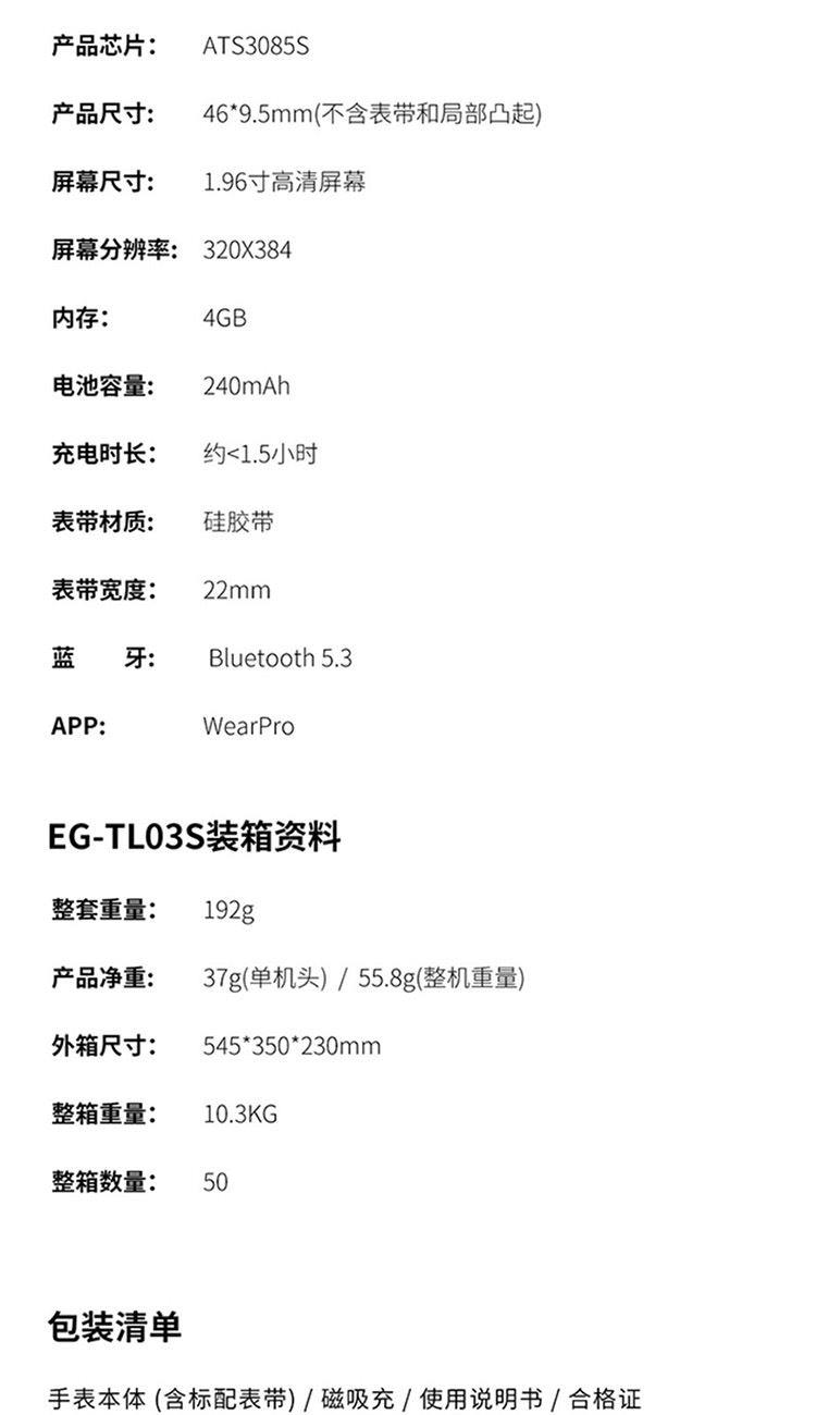1,显示屏:1.96英寸inch;分辨率320*385;IP67级防水 2,CPU:炬芯ATS3085S;内存:128MB+4GB储存 3,蓝牙5.3;支持通话 4,电池容量:240mAh;使用时间:5-7天 5,支持视频播放、本地音乐、信息推送,TWS耳机等多种功能 6,23国语言包:英语.繁体中文,简体中文.日语,韩语,西班牙语,法语等