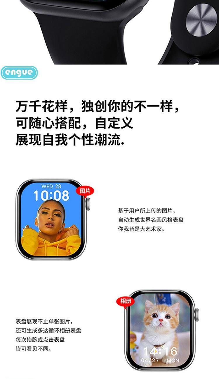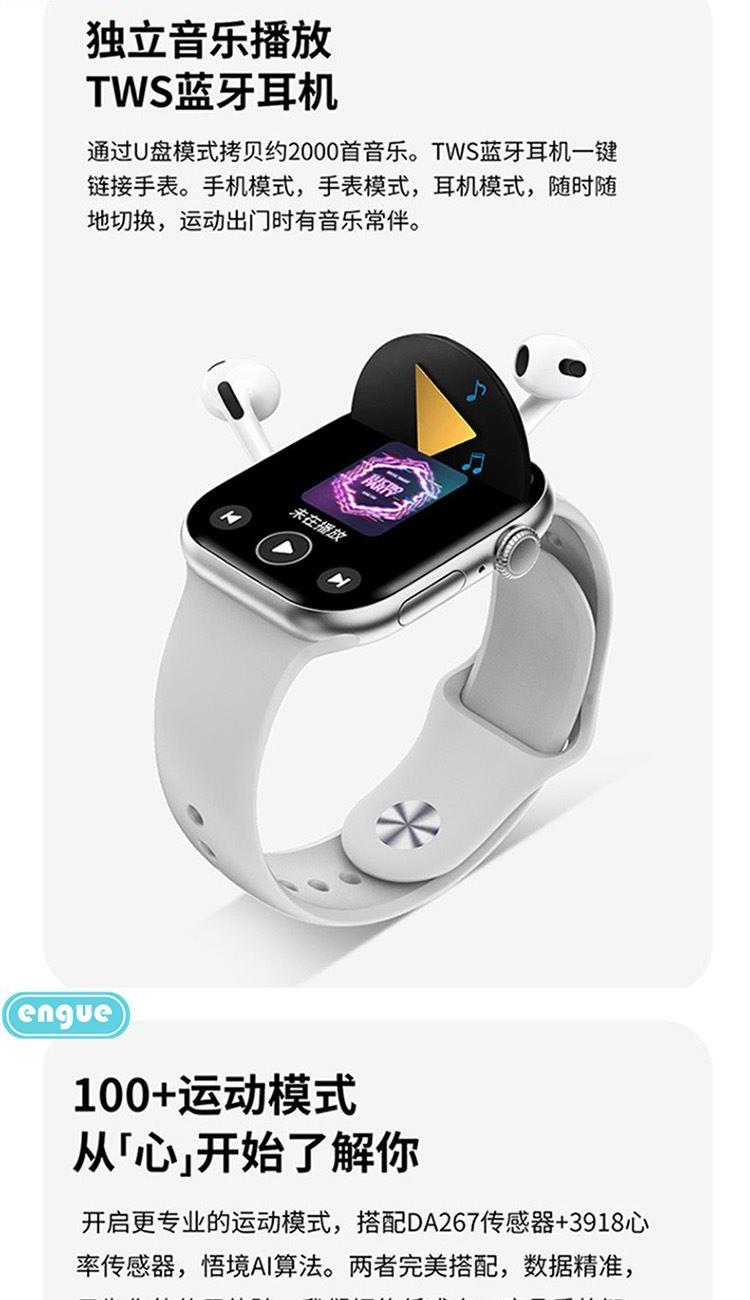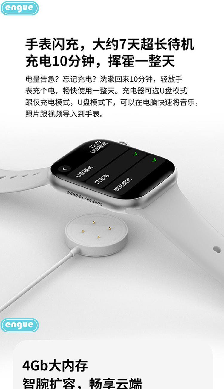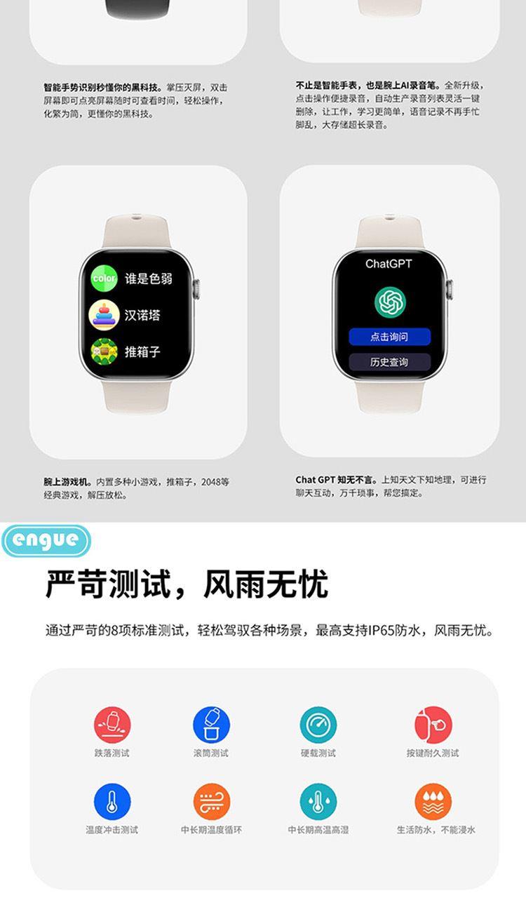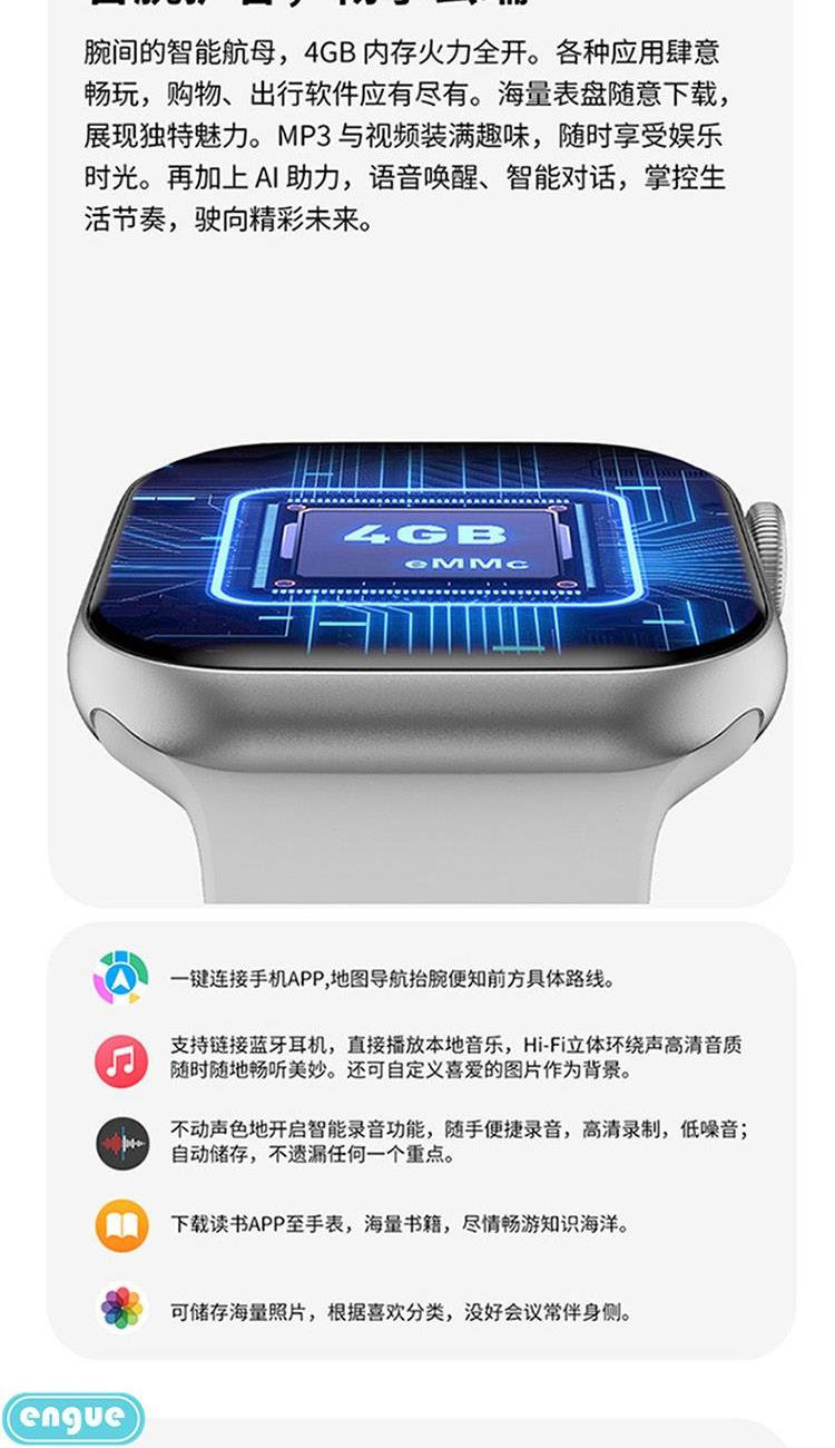 1,显示屏:1.96英寸inch;分辨率320*385;IP67级防水 2,CPU:炬芯ATS3085S;内存:128MB+4GB储存 3,蓝牙5.3;支持通话 4,电池容量:240mAh;使用时间:5-7天 5,支持视频播放、本地音乐、信息推送,TWS耳机等多种功能 6,23国语言包:英语.繁体中文,简体中文.日语,韩语,西班牙语,法语等