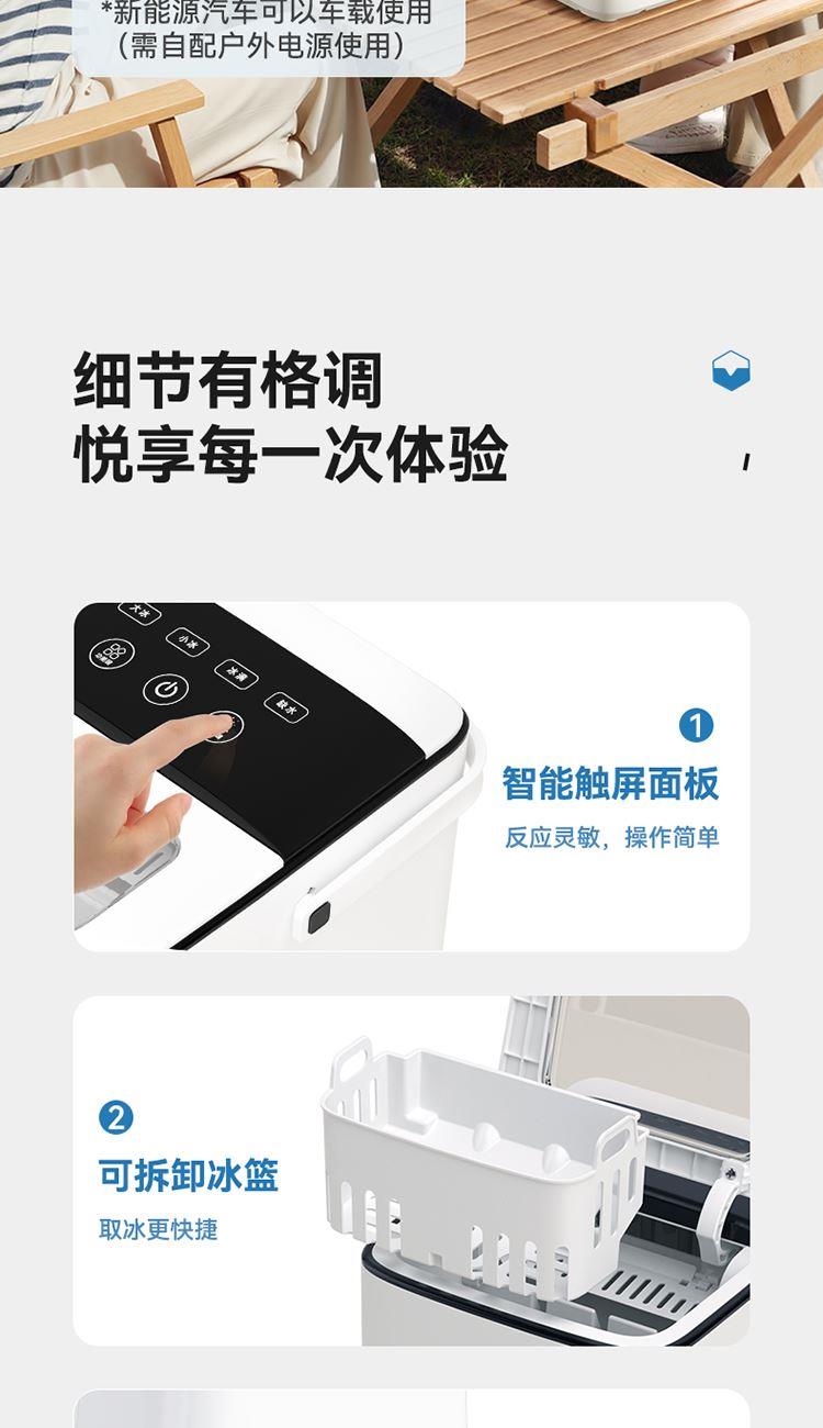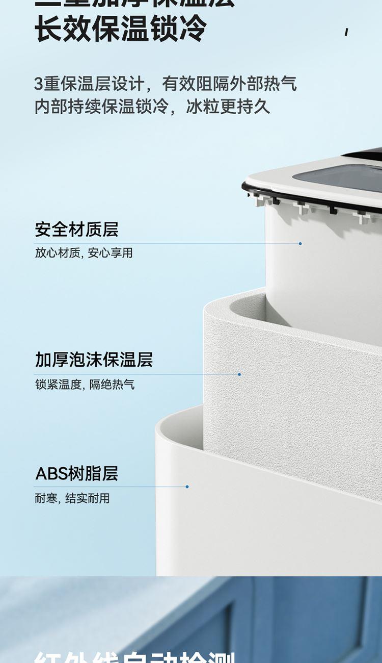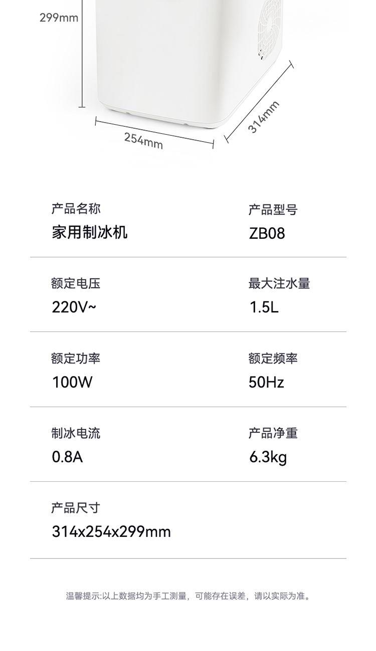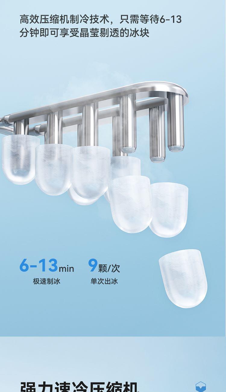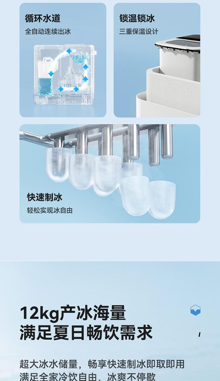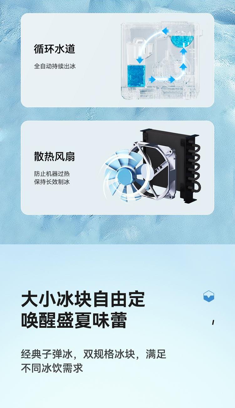 产品尺寸:314*254*299mm 额定电压:220V~ 额定功率:100W 额定频率:50Hz 制冰电流:0.8A 产品净重:6.3kg 大注水量:1.5L 1、低噪节能压缩机,快速制冰; 2、大小冰随心选择; 3、循环水道,全自动连续出冰; 4、缺水/冰满报警功能使用更安全; 5、一键自清洁。