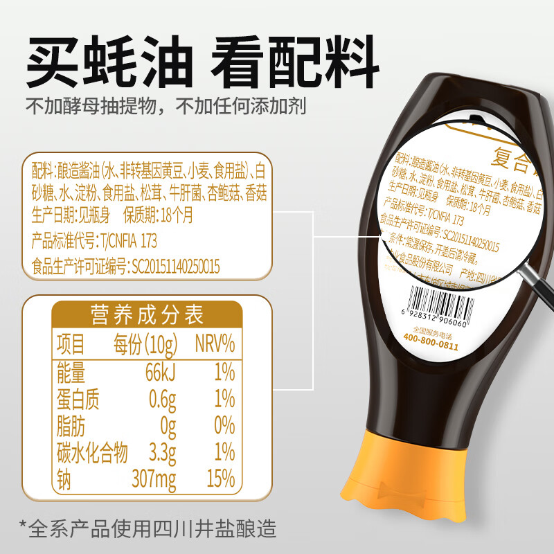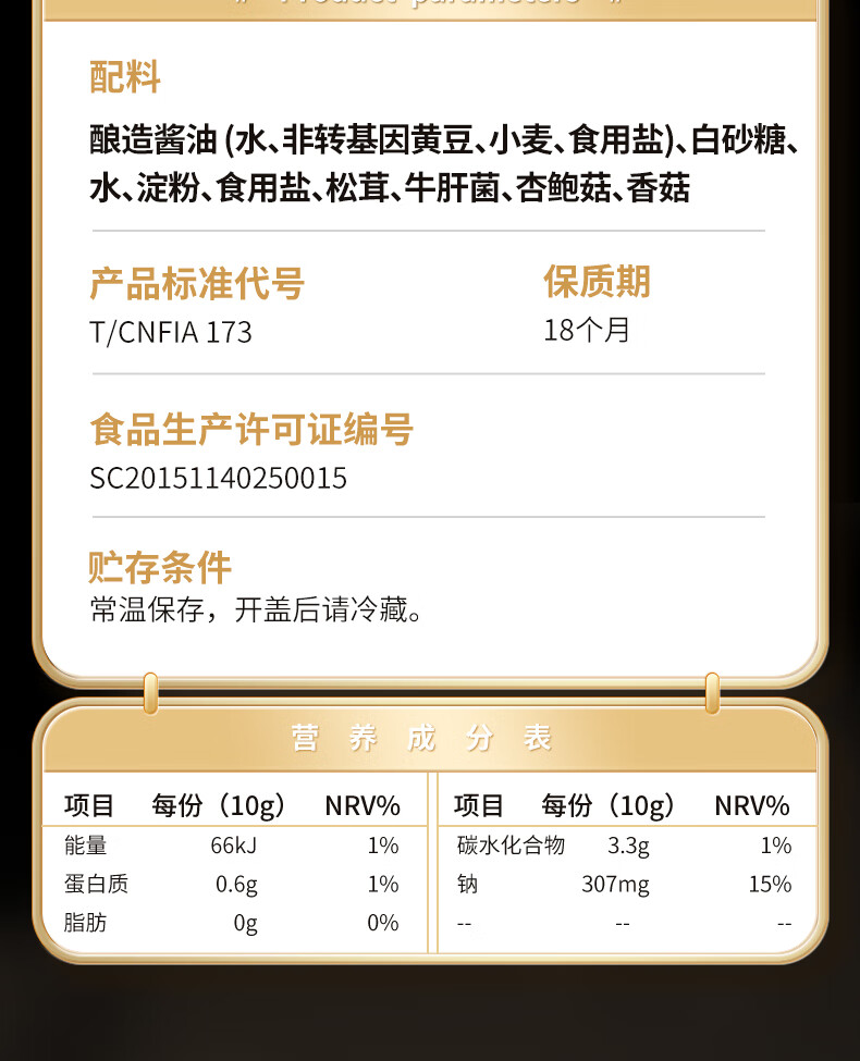 配料: 酿造酱油(水、非转基因黄豆、小麦、食用盐)、白砂糖、水、淀粉、食用盐、松茸、牛肝菌、杏鲍菇、香菇