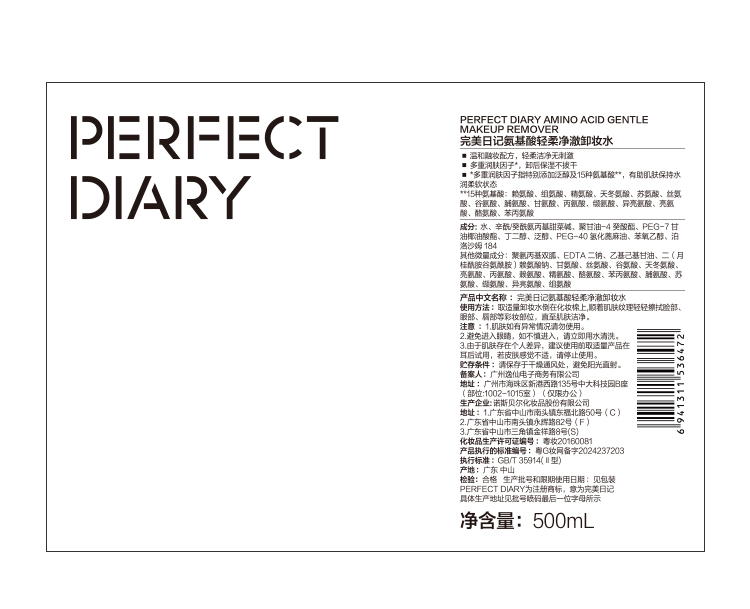 PERFECTDIARY氨基酸轻柔净澈卸妆水500ml