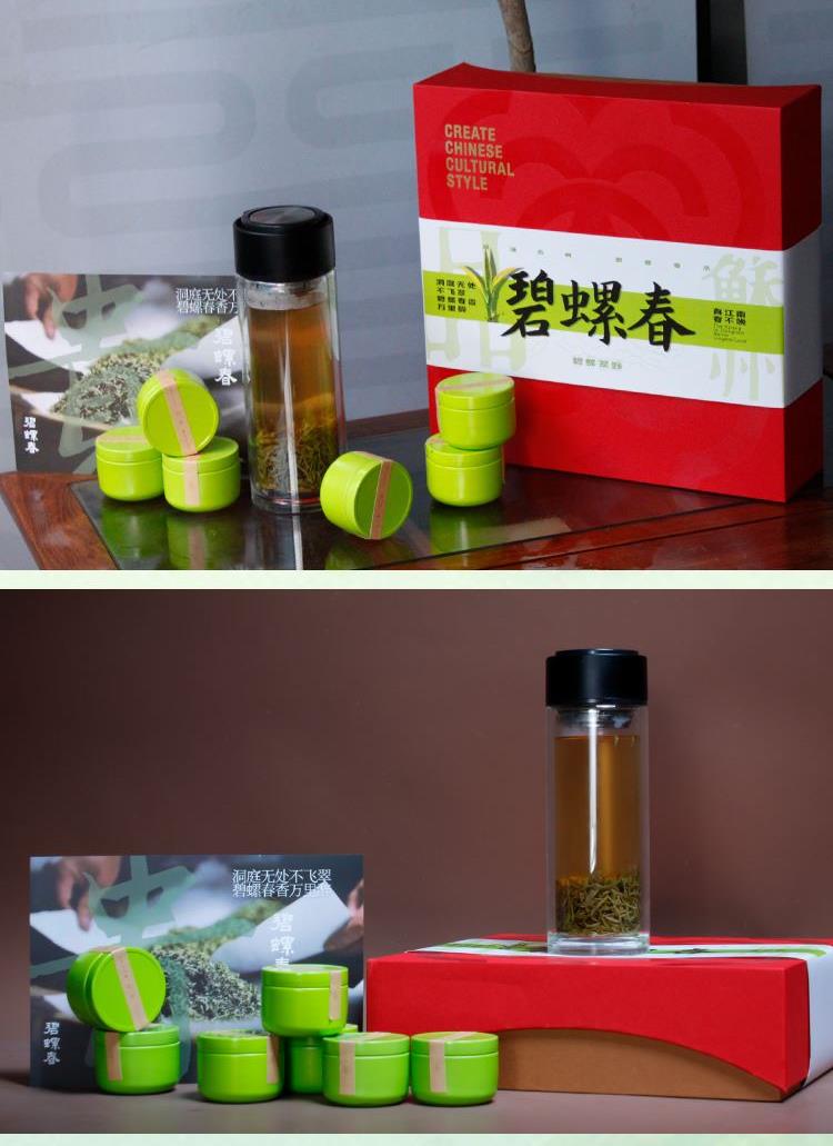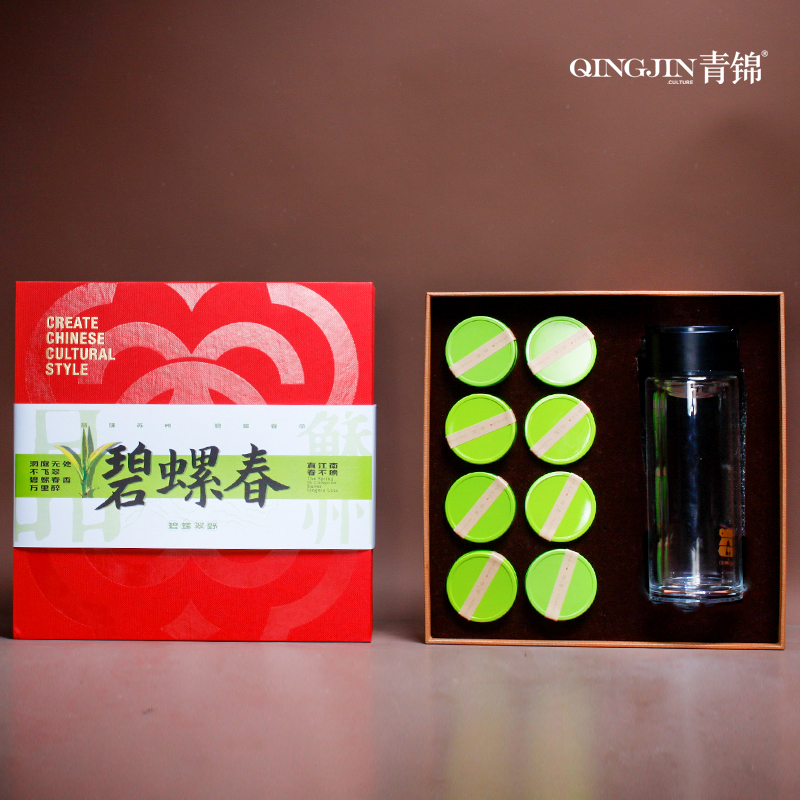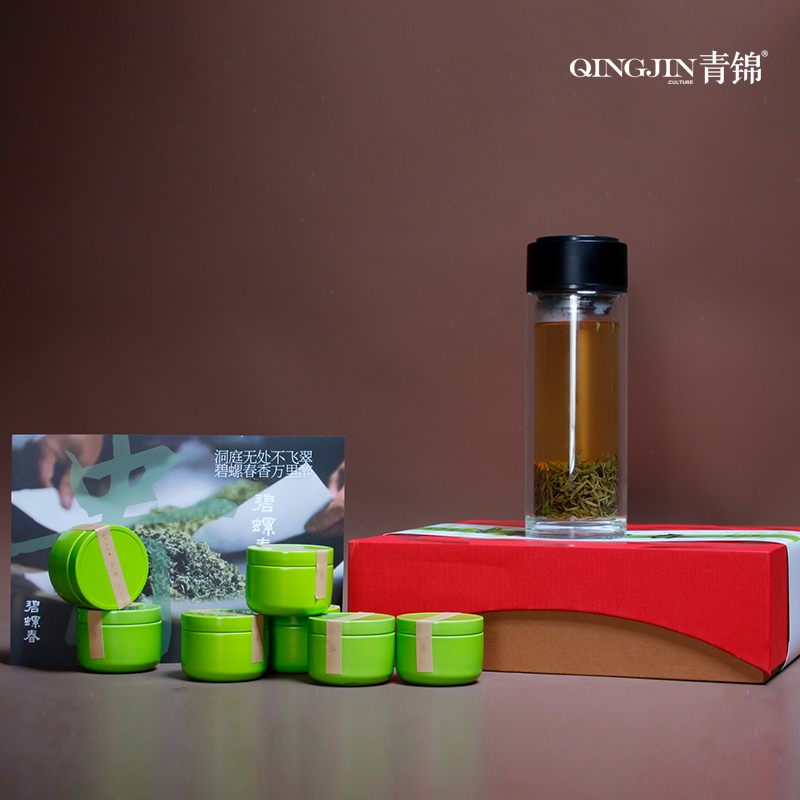 配置 手提式玻璃杯*1 洞庭碧螺春*8罐 手提袋套*1 精装礼盒*1 水杯:abs-玻璃 明前碧螺春:金属罐/每罐5克 定制工艺 :激光 镭射 印刷 烫压印 赠送场景:商务拜访 会议随手礼 企业形象推广礼 尺寸 茶叶罐 :45*45mm 礼盒:272*272*83mm